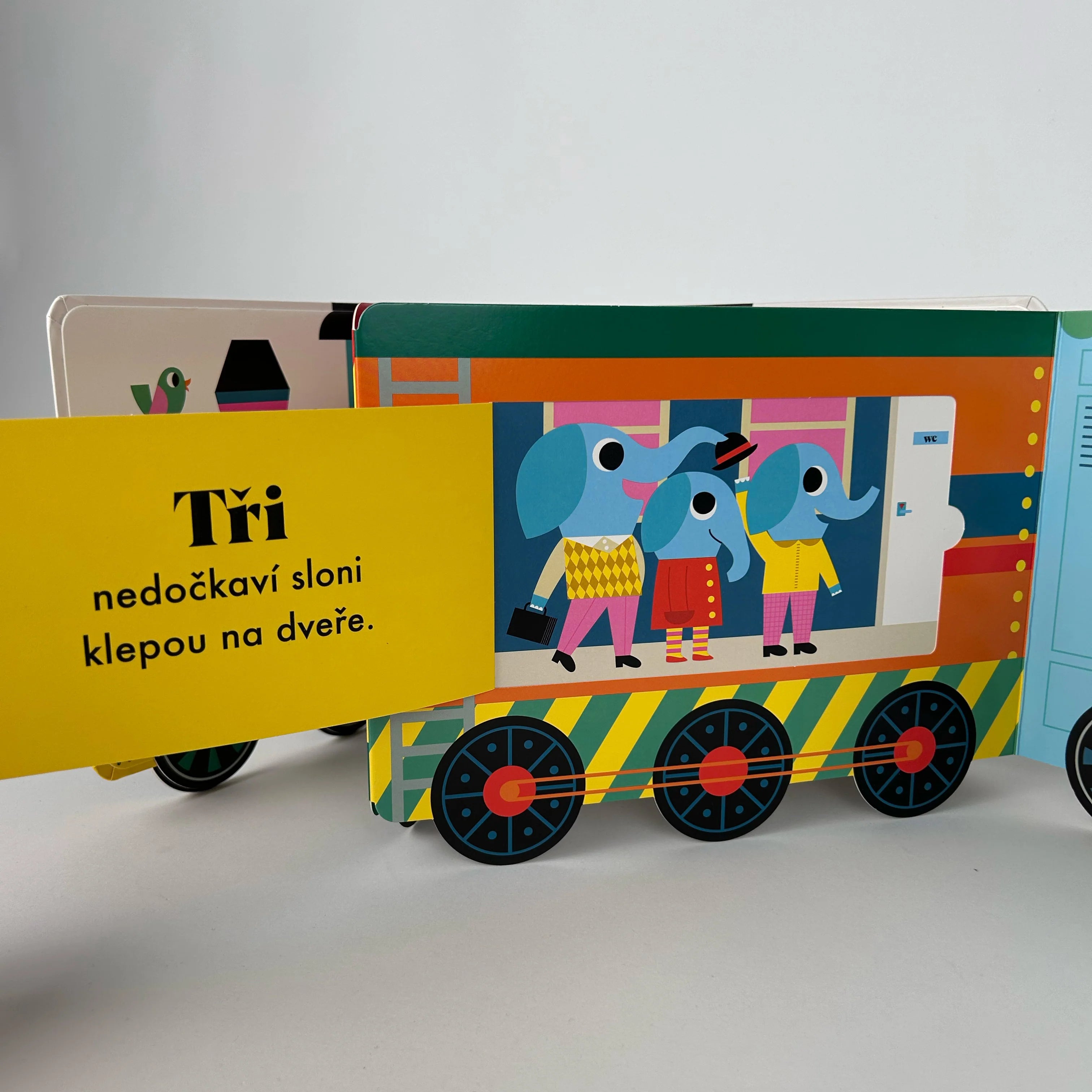 Nastupovat! Odjíždíme! Kdo si pochutnává na svačince? Kdo si zdřímnul? A kdo dělá ve vlaku tolik hluku? To vše zjistíte v tomto rozkládacím obřím leporelu (2 metry!! po rozložení) ve tvaru vlaku ilustrovaného světoznámou švédskou výtvarnicí Ingelou P Arrhenius. Učte se čísla, odklápějte okénka, užijte si rýmovaný text a scénky se zvířátky v každém vagónu. A pak knihu otočte a zahrajte si zábavnou počítací hru na druhé straně. Nakonec můžete knížku posouvat po šesti pohyblivých kolečkách.