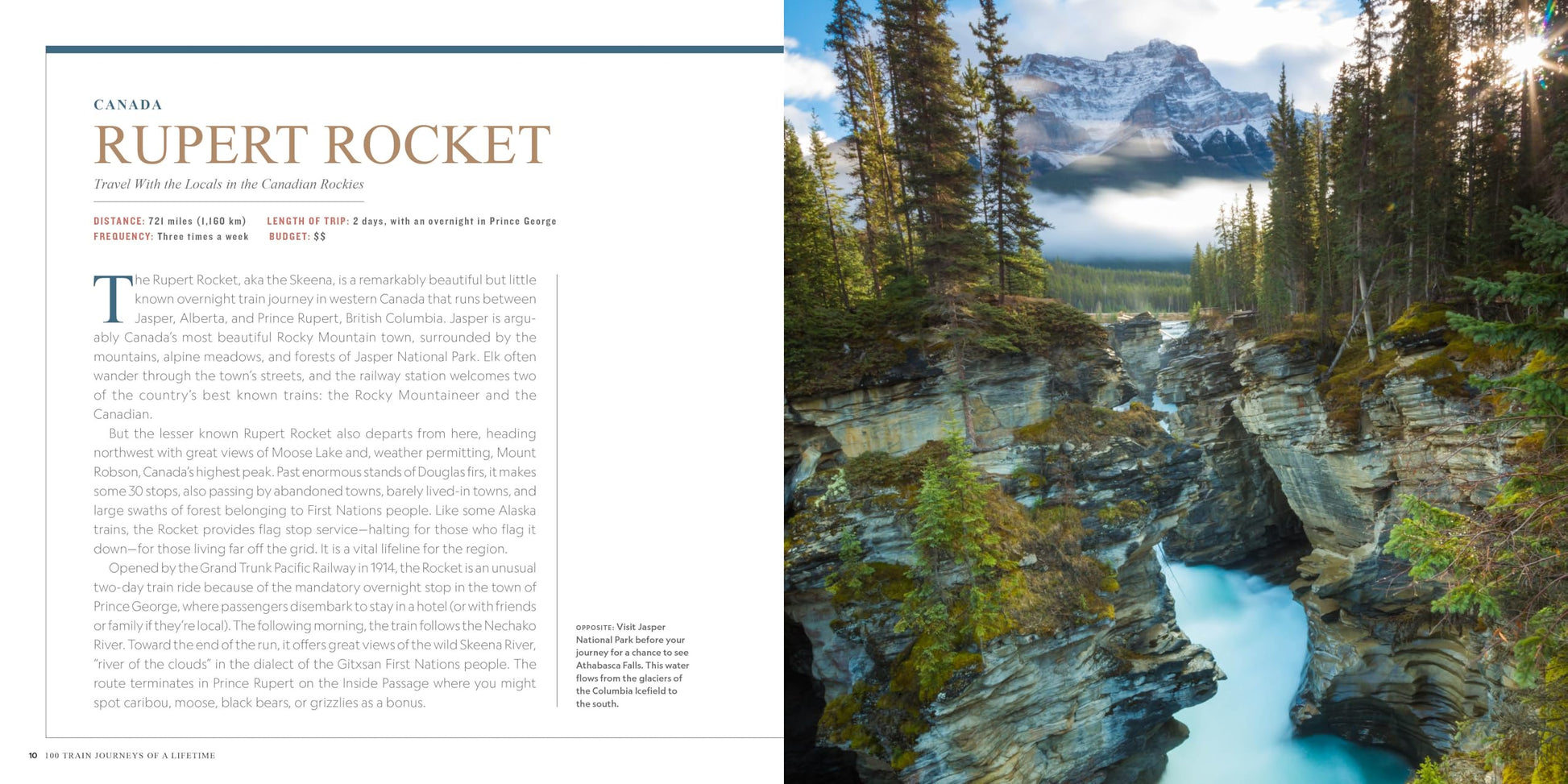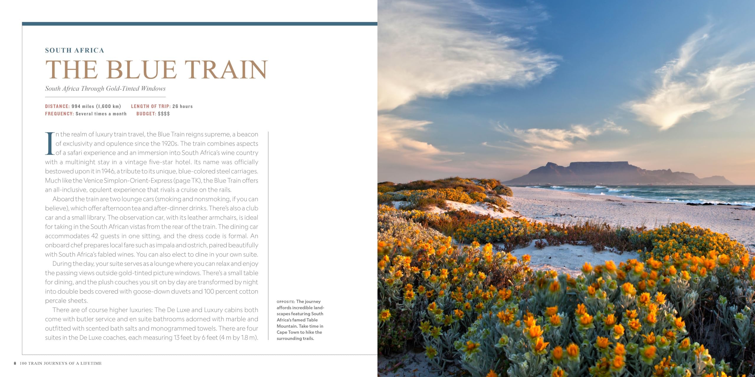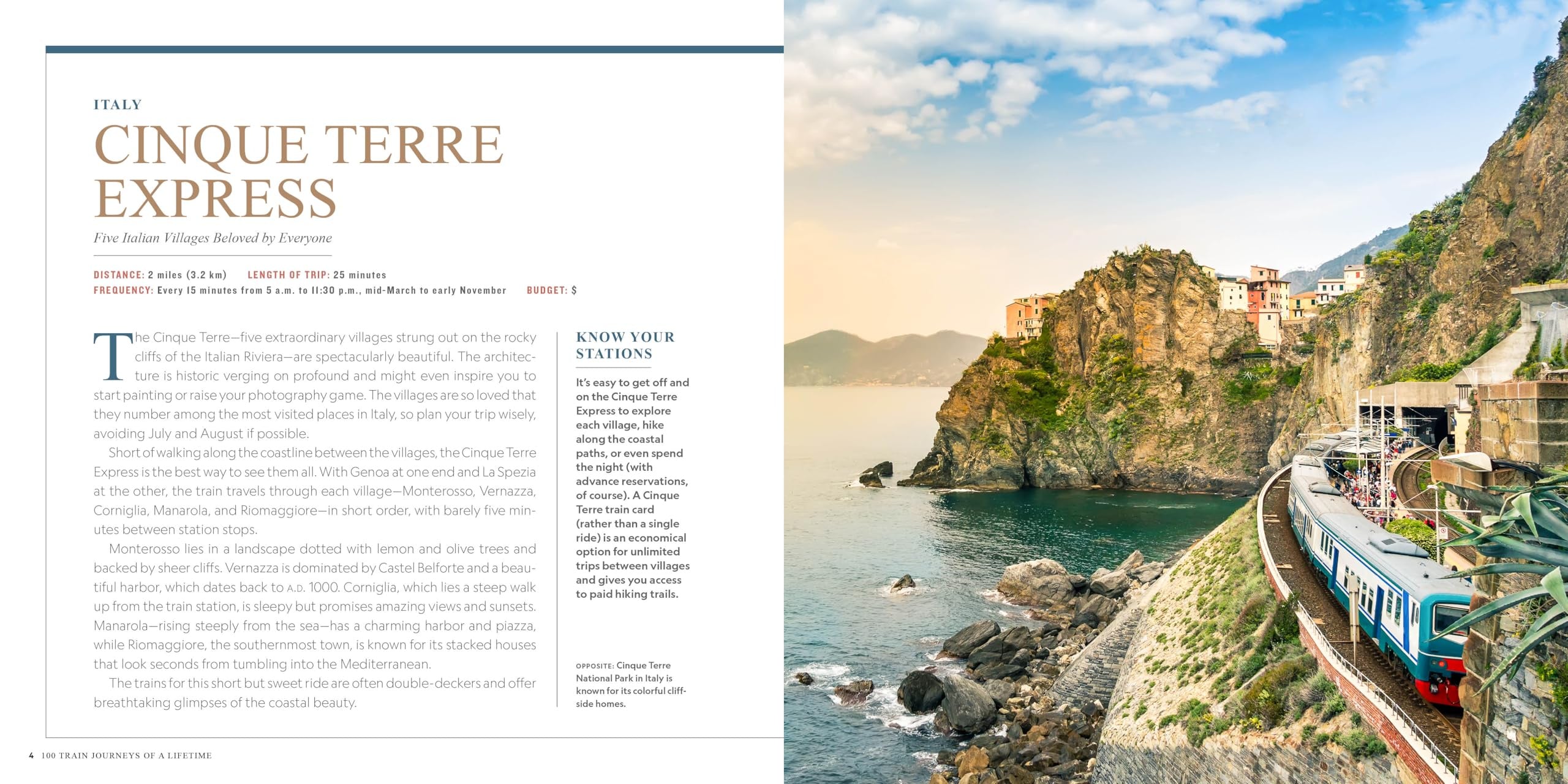 Along with where and when to go, 100 Train Journeys of a Lifetime includes inside info on passenger cars (like the best cabins to book or the tastiest meals en route), sidebars on historic stations and jet-setting train trips, and top excursions to take while off the rails.