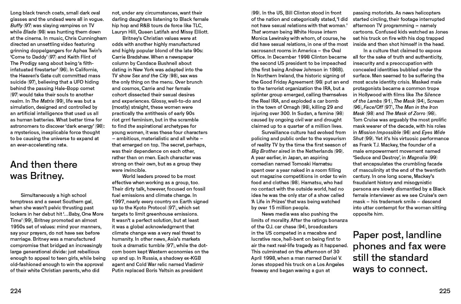 And so we had the first flashes of reality TV, the O.J. Simpson trial, the rise of surveillance culture and the internet. We had early wake-up calls to the world of social media as The Truman Show and The Blair Witch Project exploited the emerging visual language of DIY video content. We heard the rallying call of ‘Girl Power!’ from riot grrrls and the Spice Girls. We argued over East Coast versus West Coast rap and Biggie versus Tupac. Ice-T went from ‘Cop Killer’ to TV detective and Will Smith went from the Fresh Prince to a man in black. Cults, crop circles and conspiracy theories spread, and The X-Files and The Matrix pulled back the curtain on fictional hidden truths. It was the end of history and it was print’s last hurrah – or so we thought.