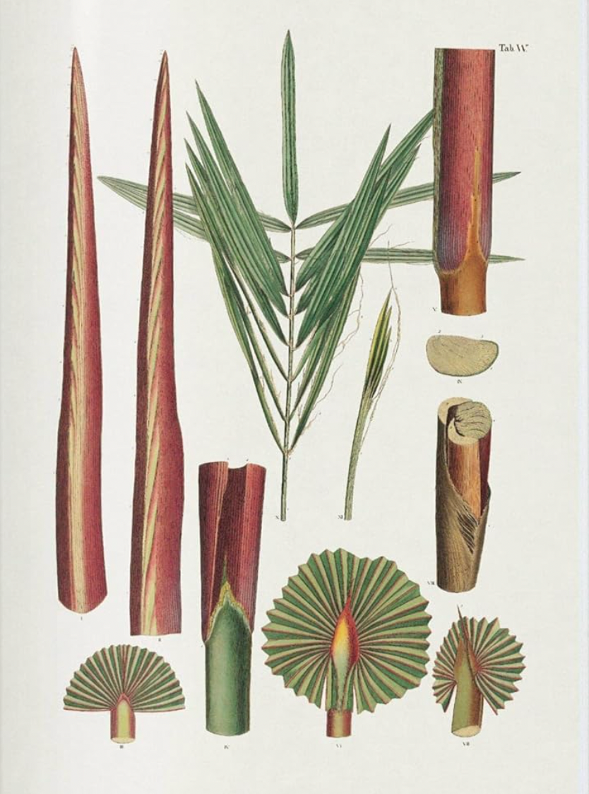 The result was an unrivaled catalogue of all known genera of the palm family, outlining the modern classification of palms, describing all the palms of Brazil, and producing the first maps of palm biogeography. Von Martius's folio is unusual in its inclusion of cross-sectioned diagrams, conveying the architecture of these mighty trees, which central Europeans would have found hard to imagine accurately. Equally remarkable are the color landscapes showing various palms-often standing alone in simple and elegant beauty.