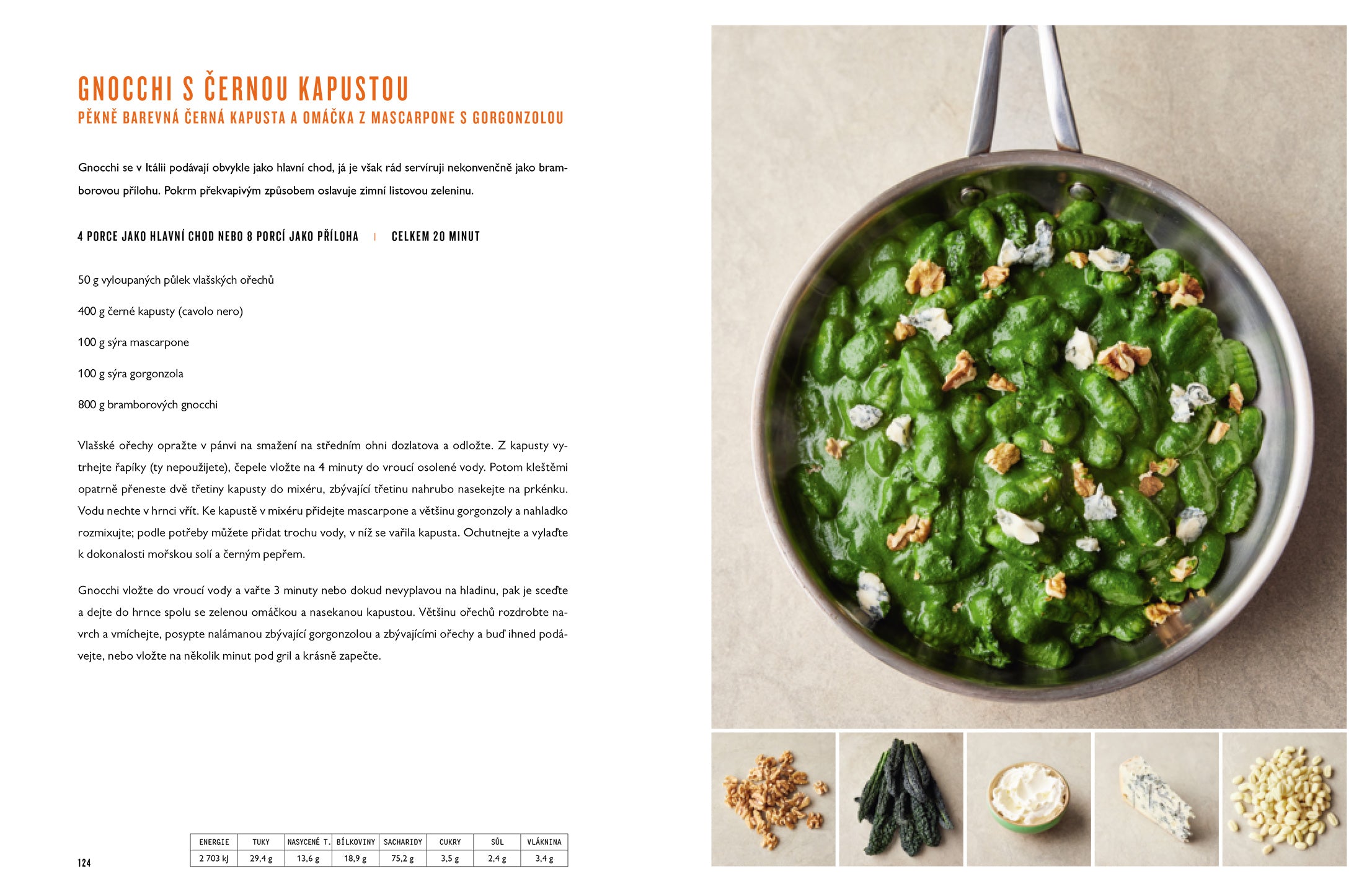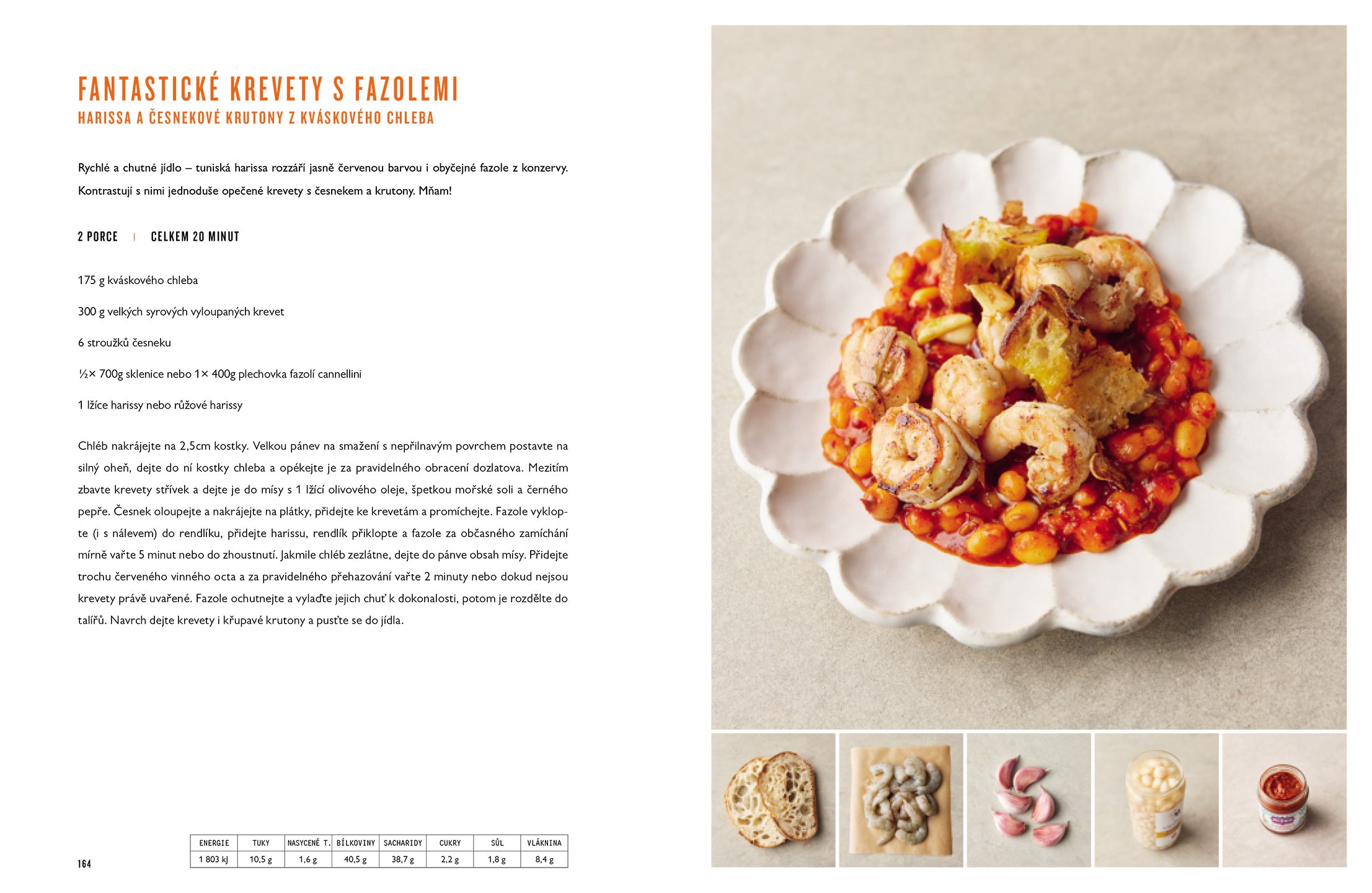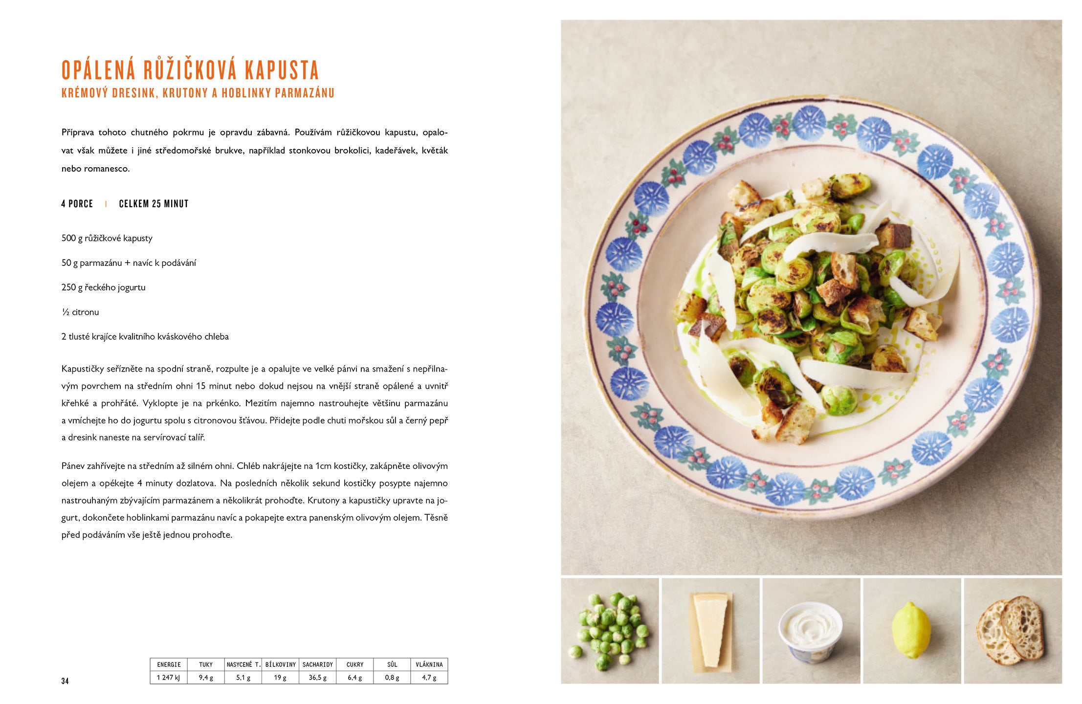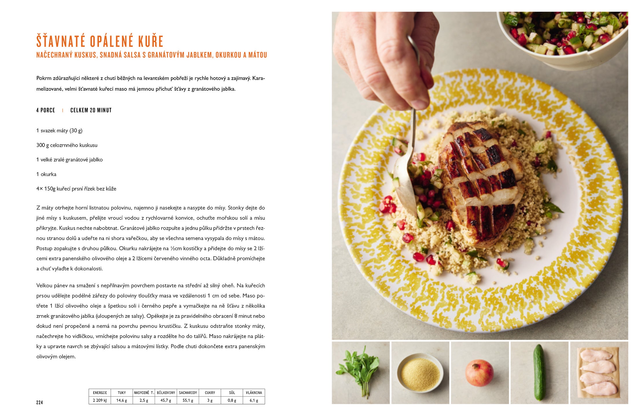 Jamie Oliver ve své nové knize představuje více než 125 receptů, které jsou oslavou středomořských surovin, chutí i vůní. Inspirovaly ho cesty po tomto oblíbeném regionu a s nadšením přetvořil klasické recepty na něco „oliverovsky" působivého a jednoduchého. Na každý recept budete potřebovat jen 5 surovin (základ typu olivový olej, sůl či pepř se nepočítá), takže připravíte chutná jídla bez dlouhého nákupního seznamu a velké kopy nádobí… Zhruba polovina receptů je buď bezmasých, nebo s menším obsahem masa. Hledáte-li inspiraci na saláty, polévky, těstoviny, zeleninové pokrmy, jídla z ryb či mořských plodů, drůbeže, vepřového, hovězího i jehněčího masa nebo na slané koláče a dezerty, určitě si vyberete. Vyzkoušejte melounový salát, pečenou rajčatovou polévku, řecko-kyperské těstoviny, dýňový tažín, chorvatské slávky, morčáka marinovaného limetou, pečenou kachnu s hroznovým vínem, hovězí tagliatu, trhané jehněčí ramínko, úžasné pečené meruňky, luxusní nanuk…