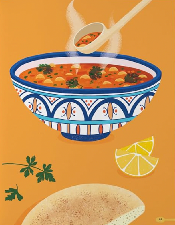 Countries and recipes featured: Afghanistan (plov); Algeria (sandwich aux merguez); Argentina (chimichurri); Australia (pavlova); Bangladesh (shondesh); Brazil (feijoada); China (dumplings); Democratic Republic of the Congo (poulet moambe); Ethiopia (nit’ir qibe); France (truffettes); Germany (cabbage and bratwurst); India (masoor dal); Indonesia (gado gado); Iran (borani ghogondar); Italy (focaccia); Japan (onigiri); Mexico (salsa verde cruda); Middle East (pita bread); Middle East and North Africa (baba ganoush); Morocco (harira); Myanmar (mohinga); New Zealand (lamb chops); Nigeria (jollof rice); North Africa (shakshuka); Pakistan (halwa); Peru (ceviche); Philippines (adobo); Poland (zupa ogórkowa); Russia (blini); Senegal (bissap); South Africa (potele); South Korea (haemul pajeon); Spain (tortilla de patatas); Sudan (salata tomatim bel daqua); Syria and Lebanon (tabbouleh); Tanzania (ndizi kanga); Thailand (pad thai); The Caribbean (pastelillos de guayaba); Uganda (mandazi); Ukraine (borshch); United Kingdom (scones); United States of America (chili con carne); Vietnam (pho).