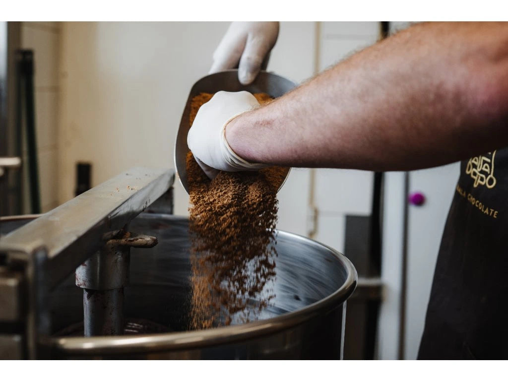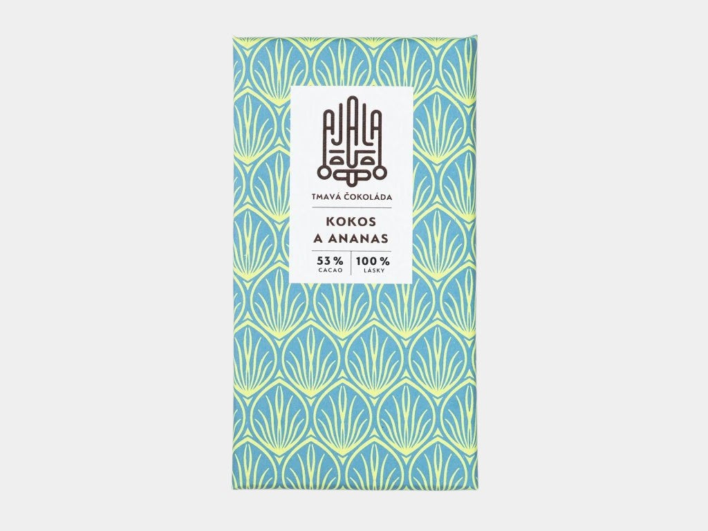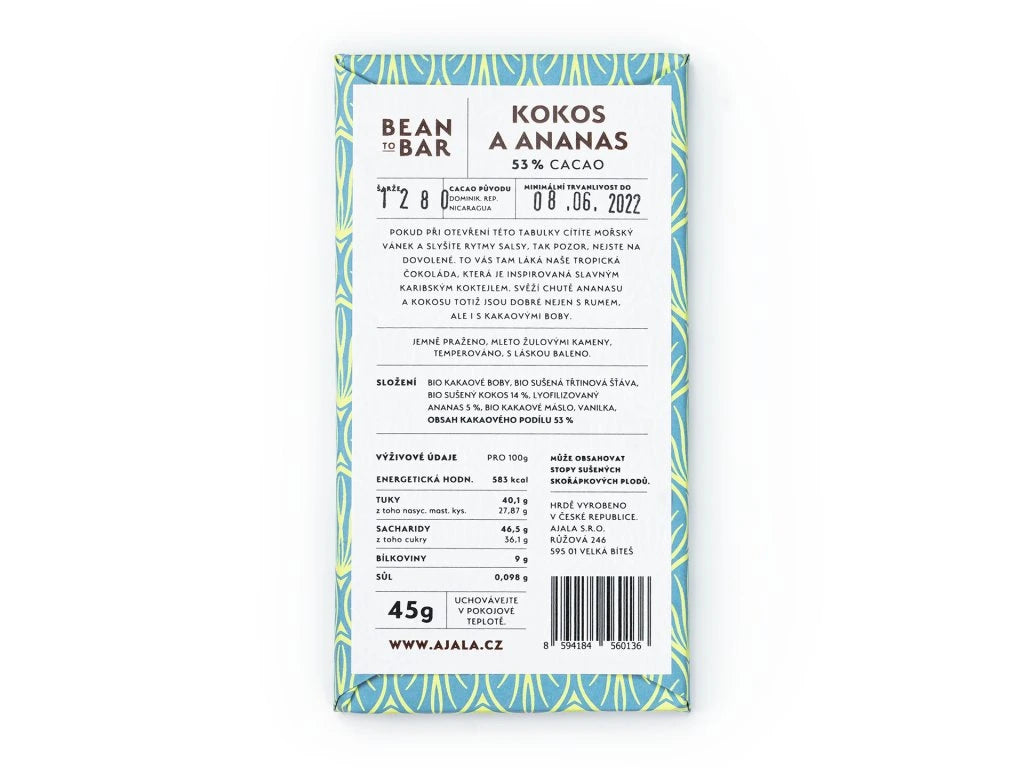 | Složení: | bio kakaové boby, bio sušená třtinová šťáva, bio sušený kokos 14 %, lyofilizovaný ananas 5 %, bio kakaové máslo, vanilka |