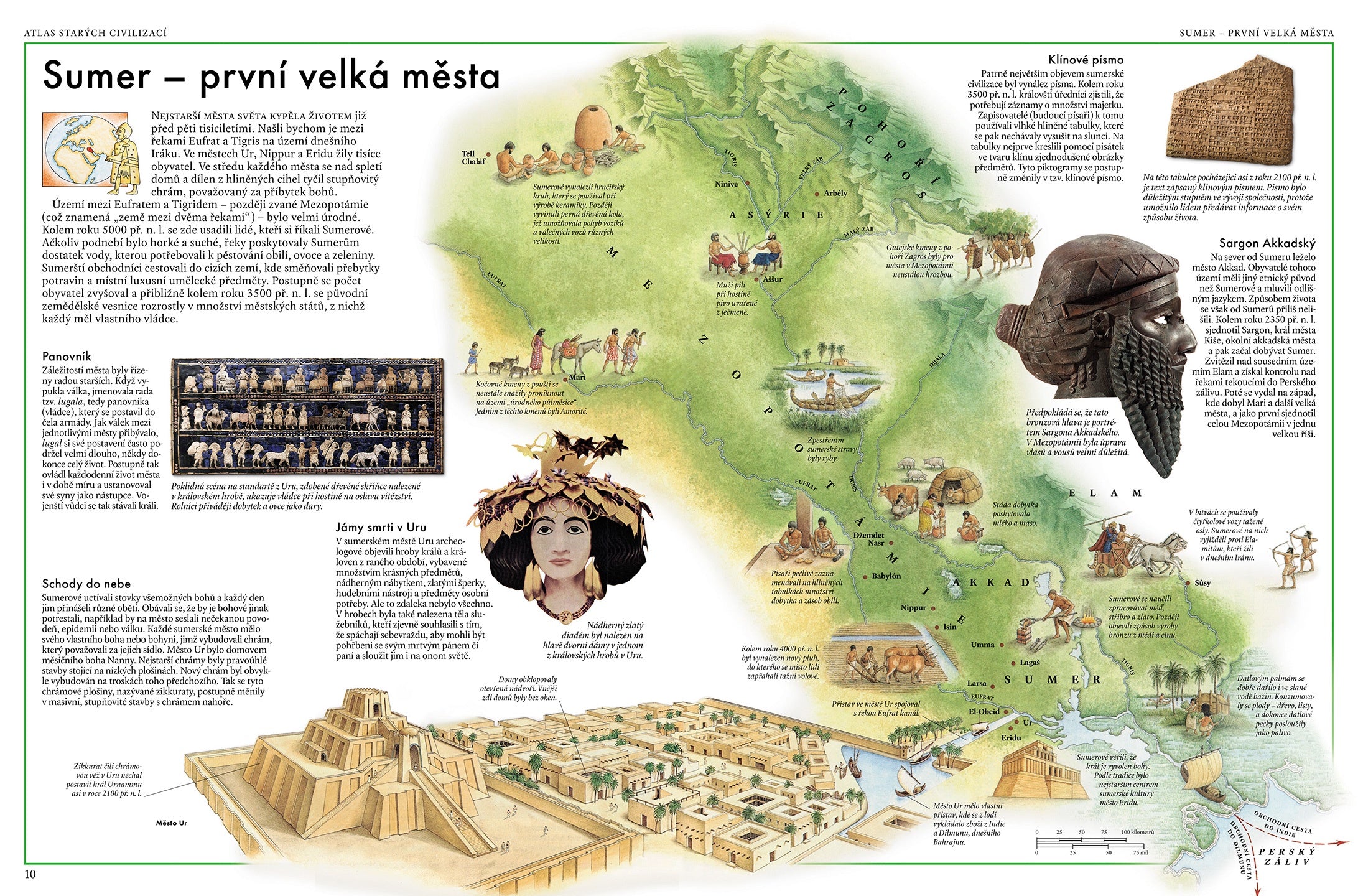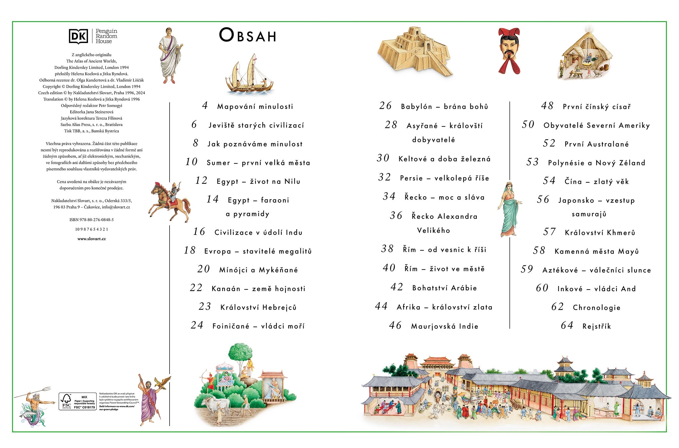Působivý obrazový průvodce mapuje téměř pět tisíciletí minulosti lidstva. Ukáže vám, kde se nacházely nejvýznamnější starověké civilizace a jak se vyvíjely v nejrůznějších přírodních podmínkách. Kniha začíná na Blízkém východě v rozpálených sumerských městech kolem roku 3500 př. n. l. a končí vysoko v Andách u jihoamerické civilizace Inků kolem 1500 n. l. Podrobné mapy s výjevy ze života starověkých lidí vám představí důležité události jejich dějin. Každá z kultur, o nichž kniha vypráví, zanechala v historii hmatatelnou stopu. Například Egypťané stavěli obrovské hrobky ve tvaru pyramid, Číňané dospěli k některým pozoruhodným vynálezům, Římané organizovali velké armády a Řekové stáli u zrodu divadla a olympijských her.