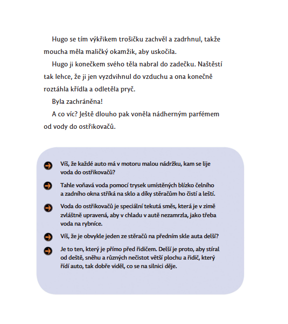 Kolik světel má auto? Co všechno ovládá řidič? Co se dočtete na přístrojové desce? Co se lije do ostřikovačů? To všechno a mnohem víc se dozvíte v každodenních příbězích automobilových součástek. Zjistíte, co zažívají zrcátka a stěrače, o čem si povídají volant s ruční brzdou, proč se pohádaly blinkry, kdy přichází na řadu reflexní vesta, ale i co dělat při sněhové vánici nebo jak se auto likviduje. Sešlápněte pedál, vyjeďte s námi na silnici, poznejte svět uvnitř vozu a získejte svůj první řidičský průkaz.