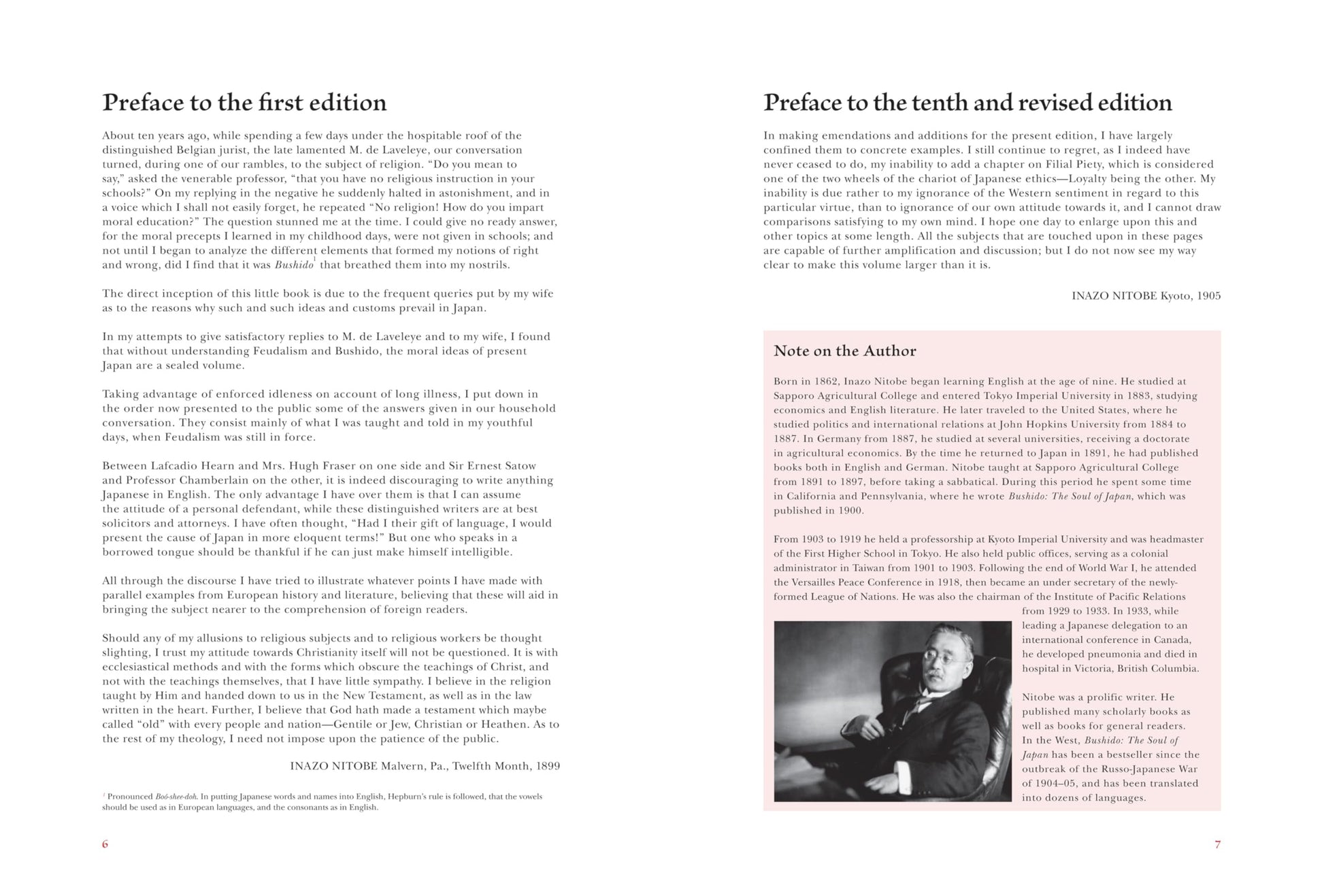 Born in 1862, Inazo Nitobe began learning English at the age of nine. He entered Tokyo Imperial University before studying politics and international relations at John Hopkins University. Nitobe taught at Sapporo Agricultural College from 1891 to 1897, before moving to the USA, where Bushido: The Soul of Japan was published in 1900. From 1903 to 1919 he held a professorship at Kyoto Imperial University. Following the end of World War I, he attended the Versailles Peace Conference in 1918, then became an under secretary of the League of Nations. He was also the chairman of the Institute of Pacific Relations from 1929 until his death in 1933. Nitobe published many scholarly books as well as books for general readers.