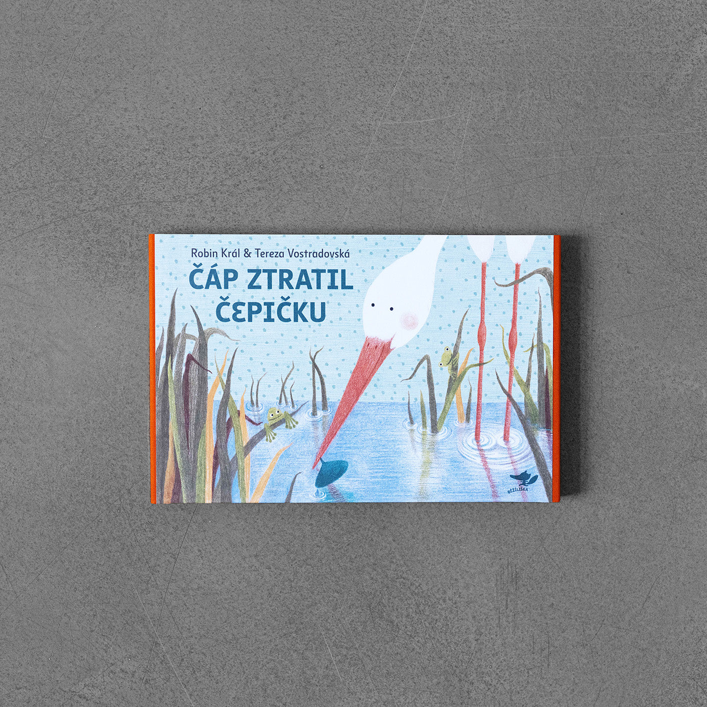 Veršované vyprávění o mladé čapí rodině hledající místo k uhnízdění, na stránkách leporela vázaného v plátně.