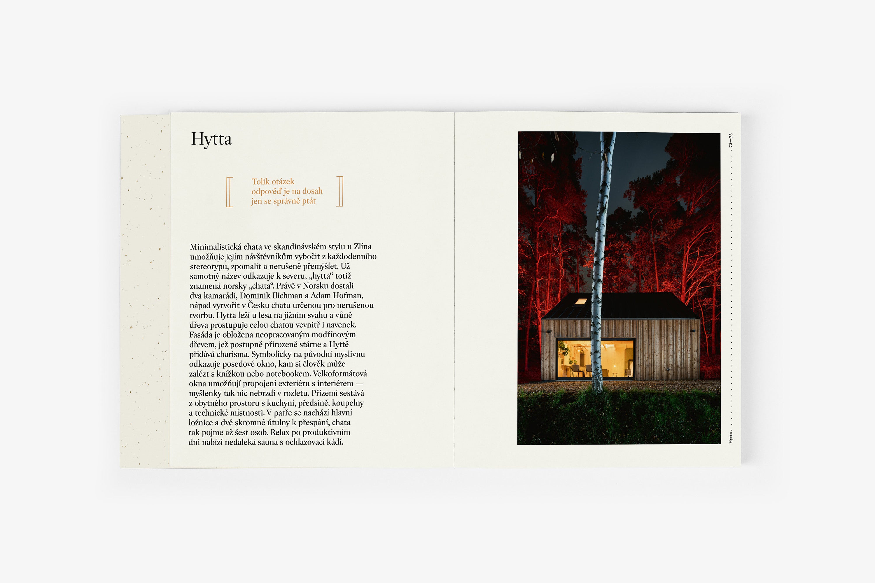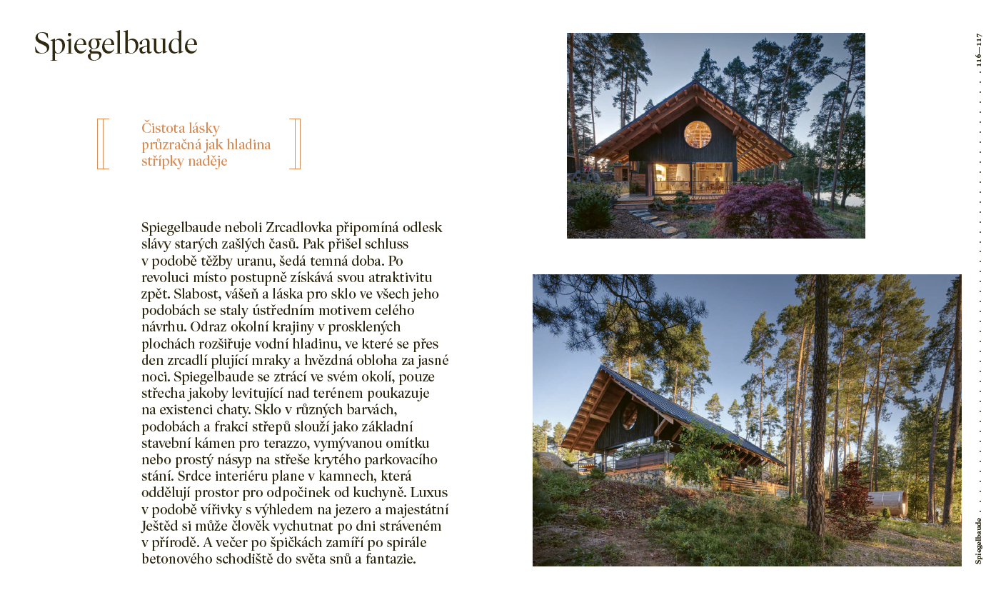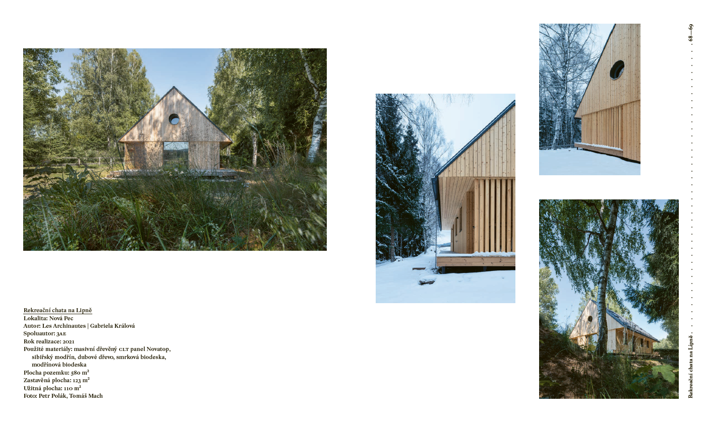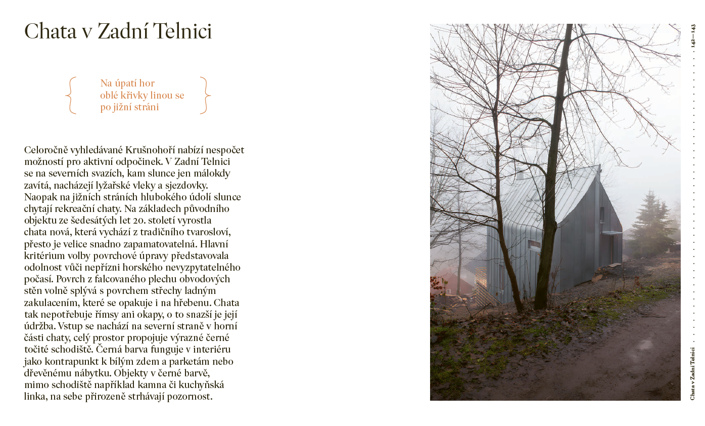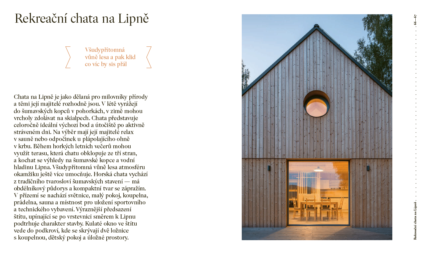 Kniha nabízí neotřelý pohled na fenomén chataření, který je hluboce zakořeněný v české kultuře. Od historie až po současnost. Co kdysi sloužilo jako únik od stresu a každodennosti, se dnes proměnilo v styl života, který nachází své místo i v moderní architektuře. Chataření a chalupaření už není jen o opravách starých domů – stále více lidí hledá inspiraci v současné architektuře, která harmonicky splývá s přírodou a nabízí pohodlí jak pro odpočinek, tak pro práci.