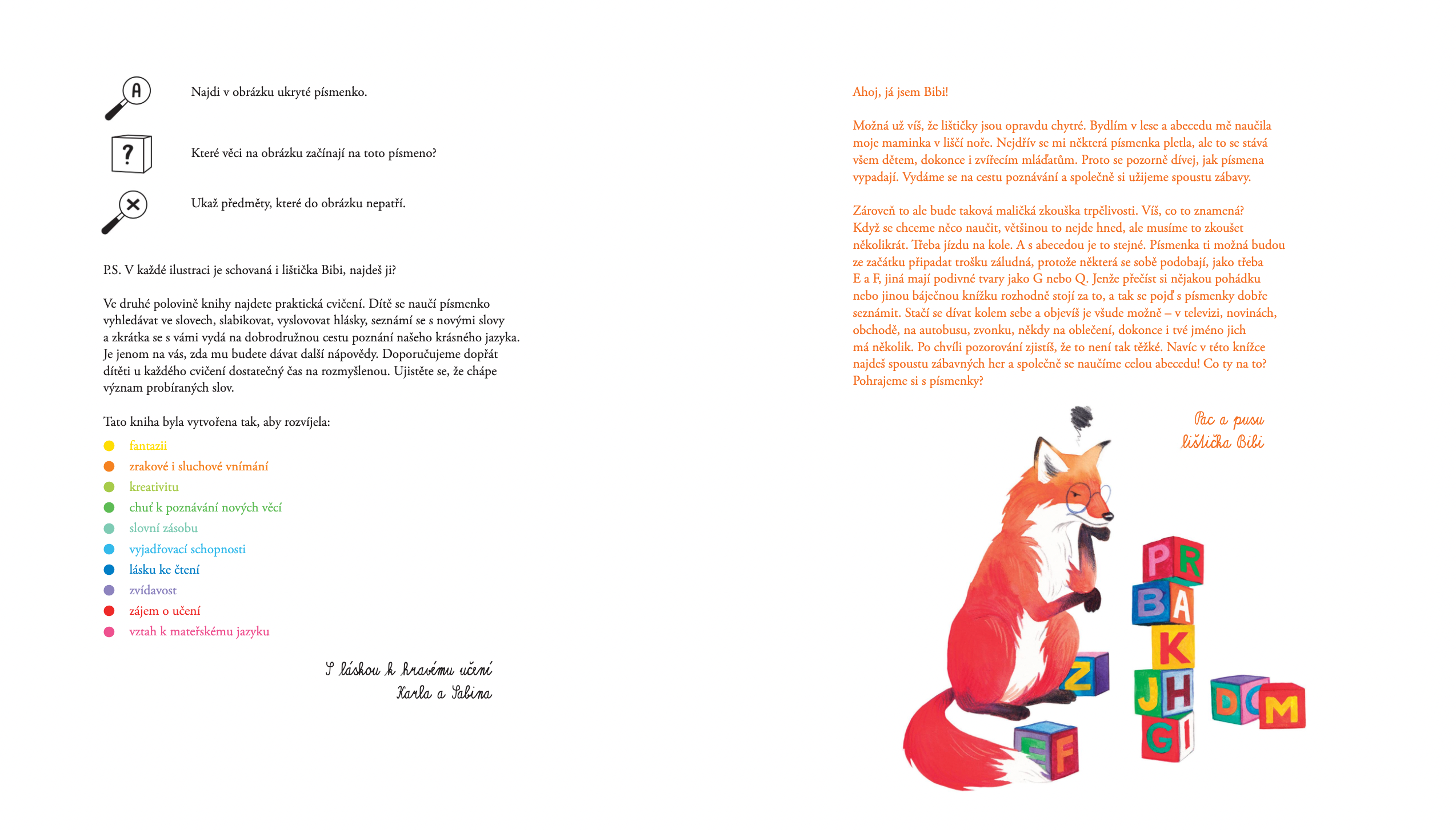 Milé děti, kluci a holky, cinky linky, lištička Bibi vás vezme na dobrodružnou cestu za písmenky. Zkoušíte si číst názvy ulic, espézetky aut nebo nápisy na dobrůtkách v obchodě? Těšíte se, až přelouskáte svoji první knížku? Tenhle báječně barevný slabikář vám umožní do světa písmenek proniknout. Zjistíte, jaké roztodivné tvary můžou mít, naučíte se je hledat ve slovech a hravé obrázky vám pomůžou s jejich zapamatováním. A ke čtení už budete mít jen krůček.