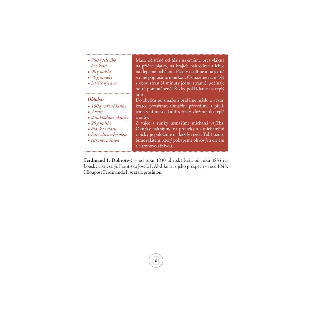 Když vám přistane skvělé jídlo na talíři, přímo se na vás směje. A pokud je navíc podle vašeho gusta, usmějete se na ně i vy. Ale knížka, kterou jste právě vzali do ruky, umí ještě něco navíc. Dokáže vám vykouzlit úsměv na tváři ještě předtím, než se vůbec rozhodnete vařit. Ba dokonce podle naší kuchařky vařit ani nemusíte, ale i tak se dozvíte spoustu hrnků informací a lžic souvislostí okořeněných nejednou špetkou humoru. A k tomu se možná podivíte, kolik klasických českých jídel je vlastně rakouských, maďarských či židovských, a naopak, a jaké slavné i zapomenuté osobnosti si na nich pochutnávaly v dobách, kdy jsme byli ještě součástí monarchie.