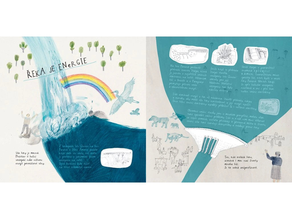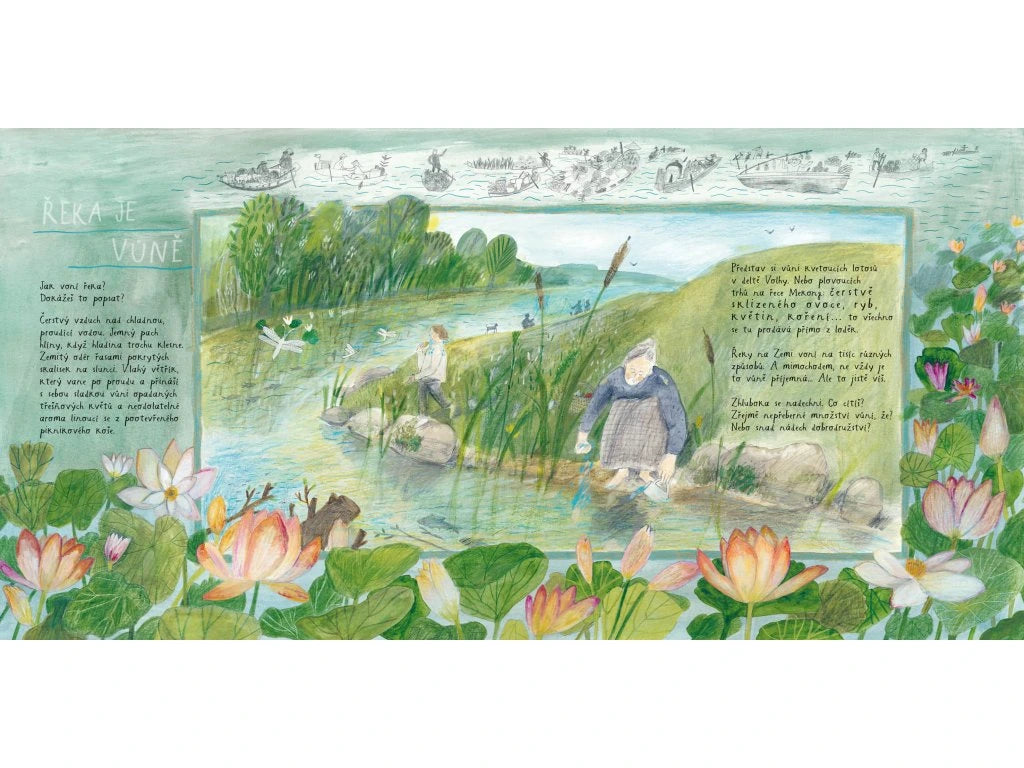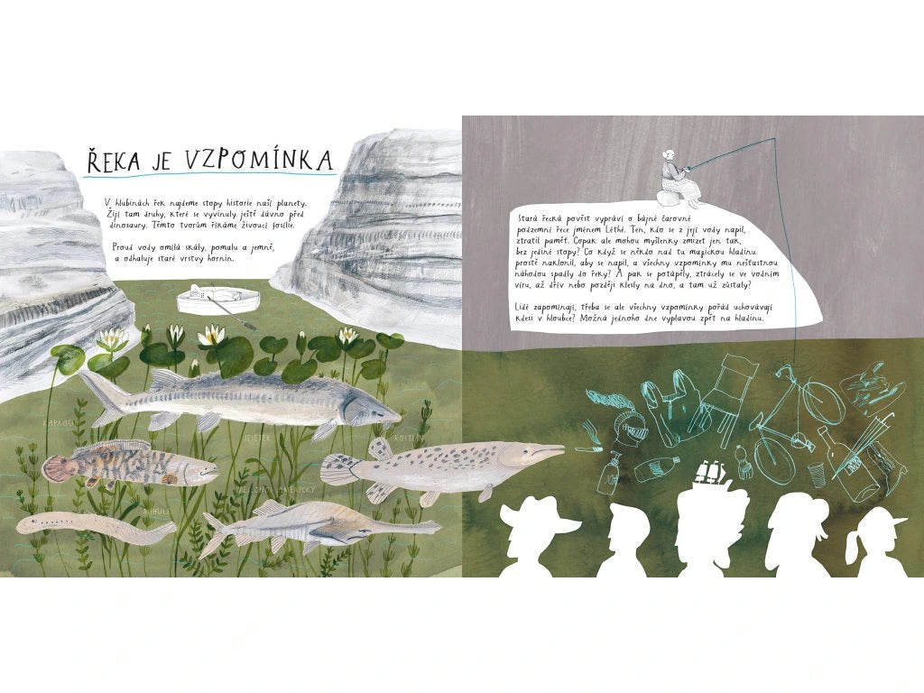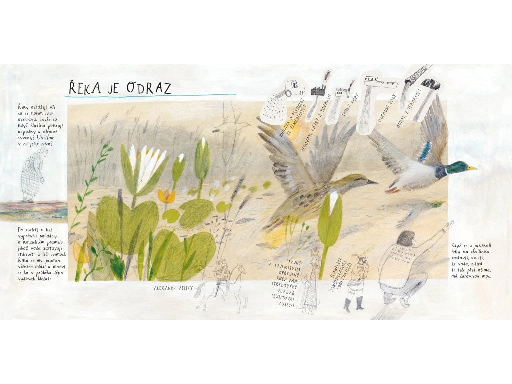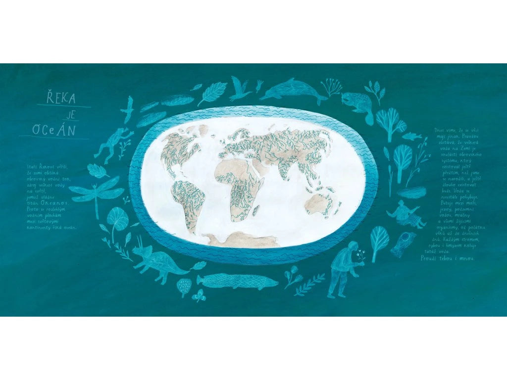 Krásně ilustrovaná kniha o řekách a jejich bohatém propojení s námi. Vnučka se svou babičkou na imaginární výpravě objevují tajemství řek, setkávají se s poutníky i dobyvateli, kouzelnými říčními delfíny nebo jesetery staršími než dinosauři, loví ryby, koupou se a zkoumají mnoho dalších věcí. Řeka je jako nit, vytváří na zemském povrchu nádherné obrazce, oživuje krajinu i naše vědomí a především - vypráví příběhy. Díky ní se potkávají různá místa, časy i lidé. Kniha čerpá ze zeměpisných, historických a mytologických odkazů i osobních postřehů a spojuje faktografii s poetickým vyprávěním. Řeky nám neustále připomínají, že všechno v životě má dva břehy, a ať jsme na kterémkoli, můžeme být dobrými sousedy.
