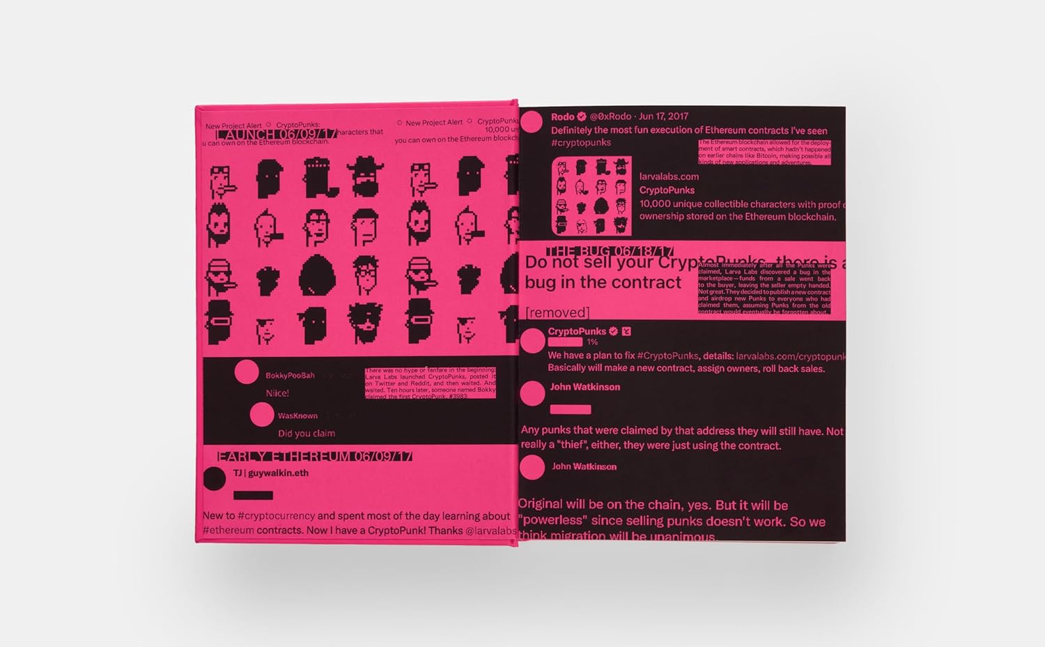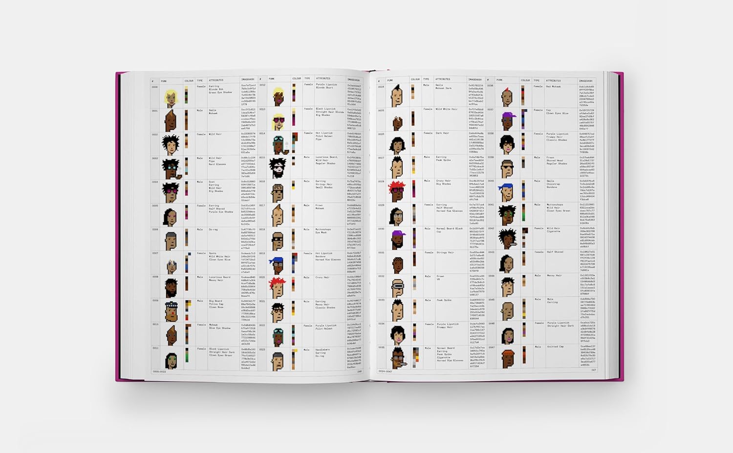 All 10,000 CryptoPunks are presented in a special 400+ page catalogue raisonné within this book, with a comprehensive listing including Punk, number, type, colors, attributes and image hash. A timeline provides a zine-like assemblage of community member posts and tweets as they happened; while an extensive glossary defines more than 100 anonymously authored terms and ideas with guest contributions from Beeple, Emily Segal, Venkatesh Rao, and more.