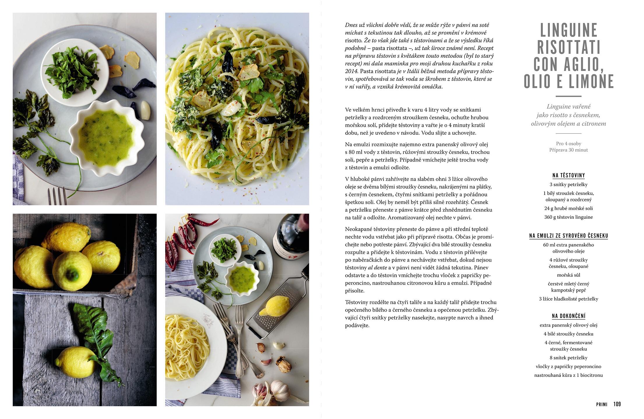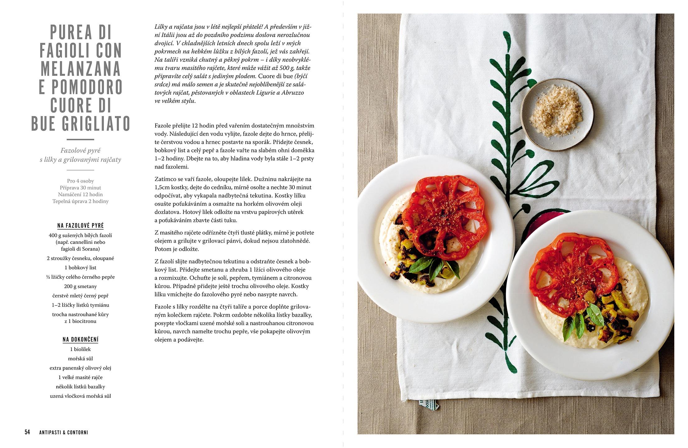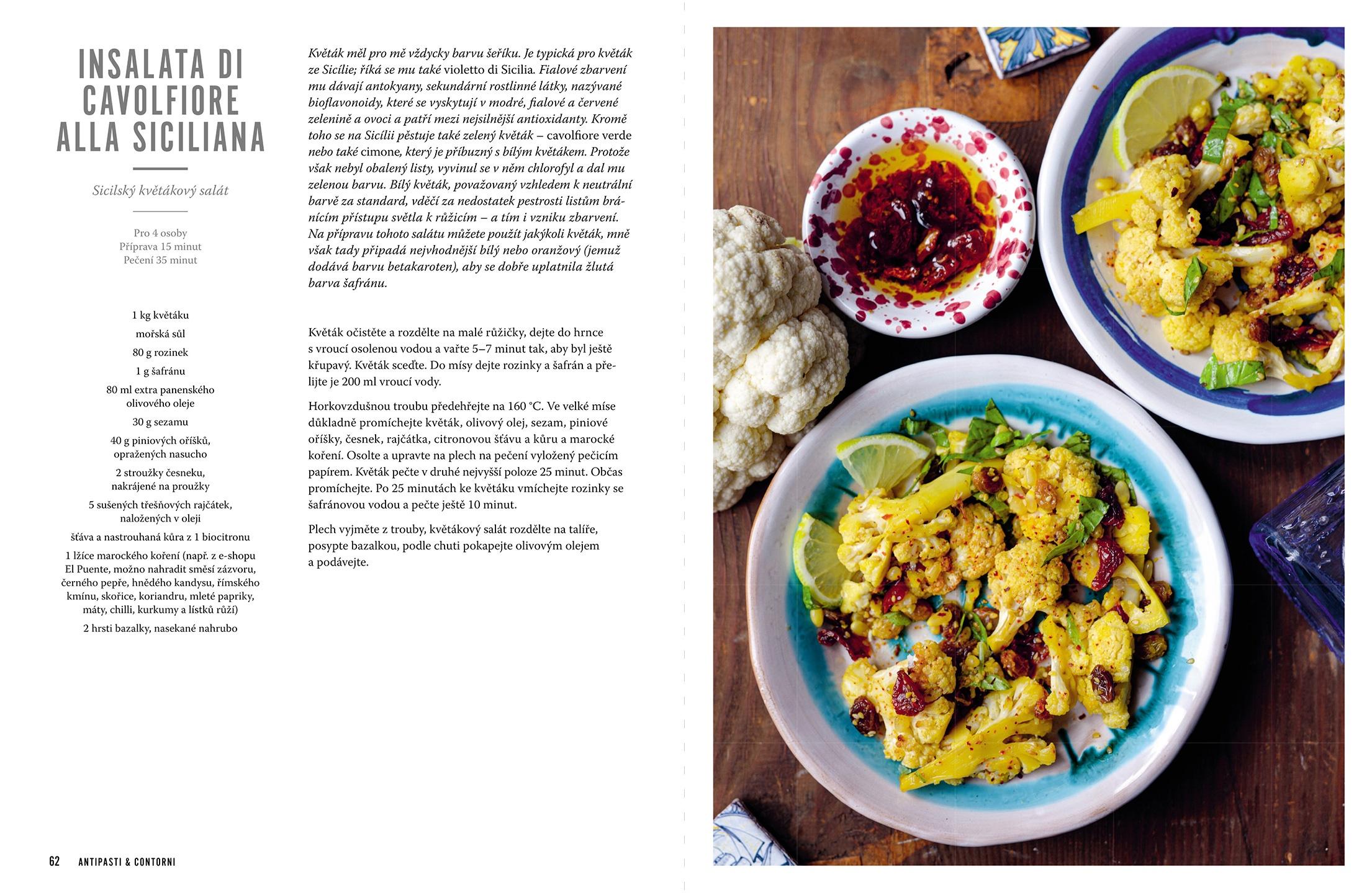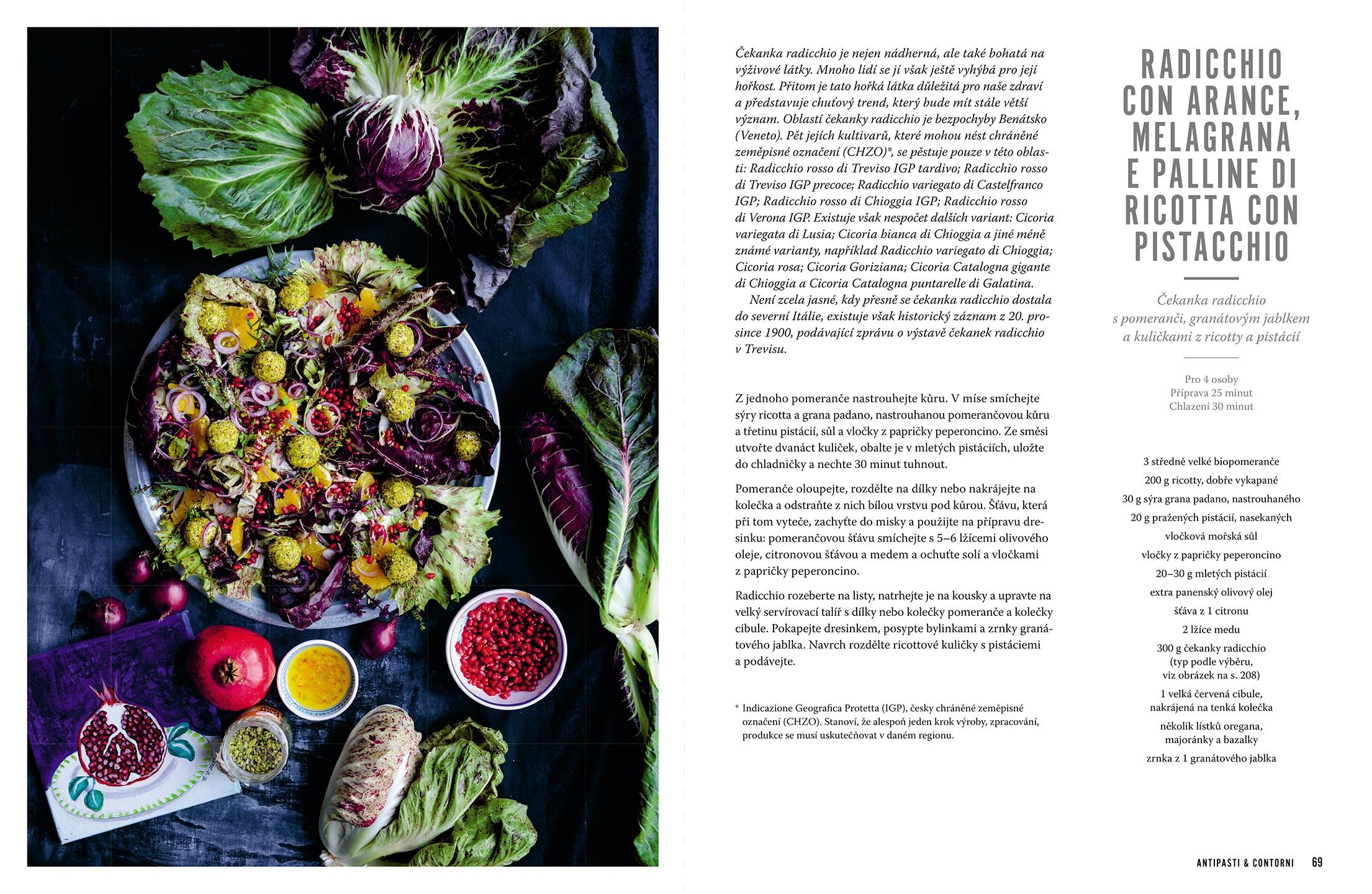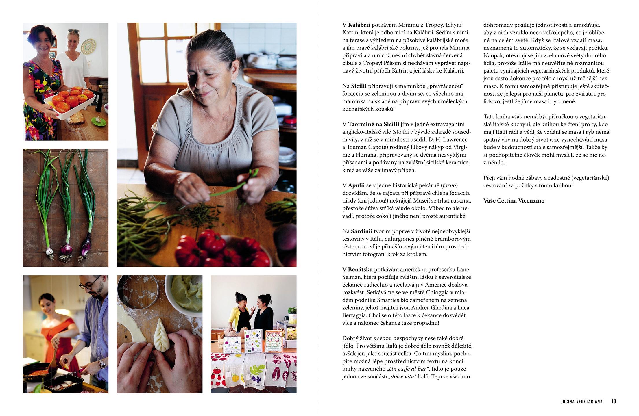 Cettina Vicenzino vás prostřednictvím více než 70 receptů zve na objevitelskou vegetariánskou cestu různými regiony své italské vlasti. Křehké artyčoky se podávají na těstovinách fregola vonících po citronu, zářivě fialová čekanka radicchio obohacuje těstovinový salát s grapefruitem a vlašskými ořechy, na slunci uzrálá masitá rajčata z grilu dokonale ladí s krémovitým fazolovým pyré s lilky, mrkvový salát ochucují olivy, arašídy a datle, těstoviny ze Sardinie se plní bramborami a mátou, šafránové risotto doplňuje černý česnek a mascarpone, pomerančový koláč kombinuje hrušky a červenou cibuli, smaženky z rajčat se podávají ve žluté rajčatové omáčce, ze Sardinie pochází úžasný dezert s mladým pecorinem a medem, kávová zmrzlina a granita mají svěží citronovou vůni… Cettina se nechává inspirovat lidmi a ingrediencemi. A vás jistě inspirují působivé fotografie a napínavé reportáže k netradičnímu vaření podle italských zvyků a možná také k nezapomenutelné cestě po Itálii.