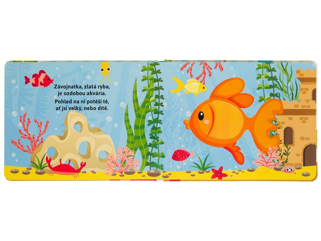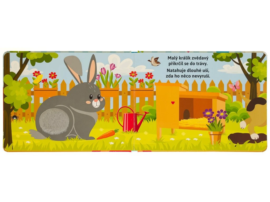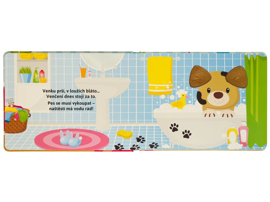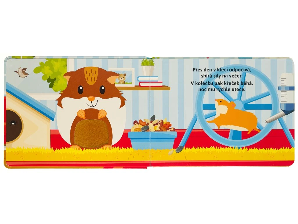 Veršované leporelo s hmatovými prvky o domácích mazlíčcích. Dotkněte se různých materiálů a přečtěte si básničky o zvířecích kamarádech.