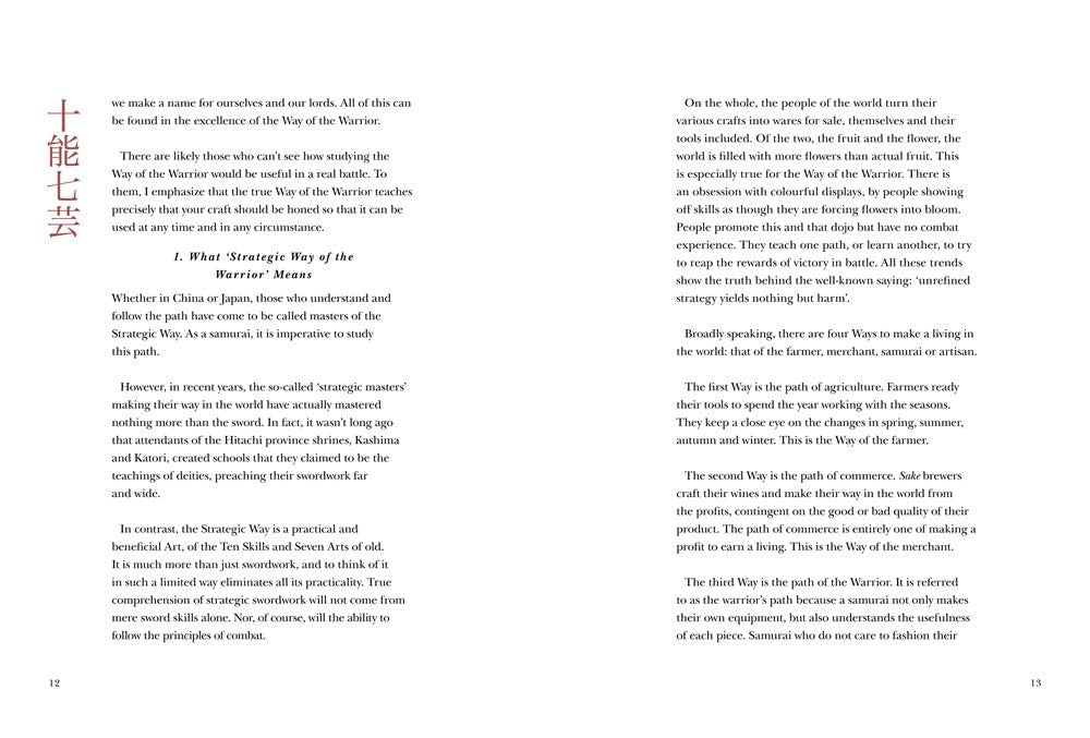 Musashi’s no-nonsense approach to the martial arts and combat includes eliminating technical flourishes, understanding that technique should simply be understood as defeating your opponent, and appreciating that the same qualities apply in both small- scale and large-scale conflicts. Repeatedly, he stresses the importance of learning through practice, rather than merely reading about them.