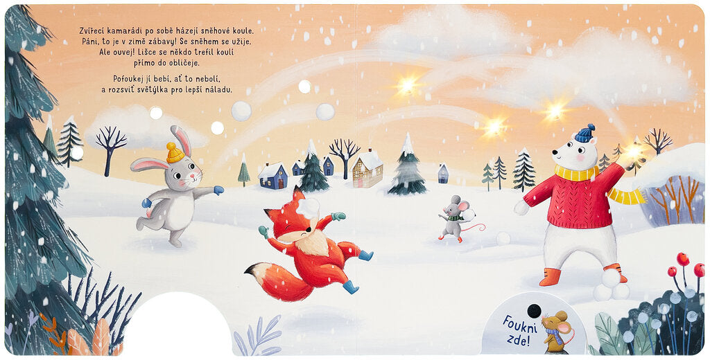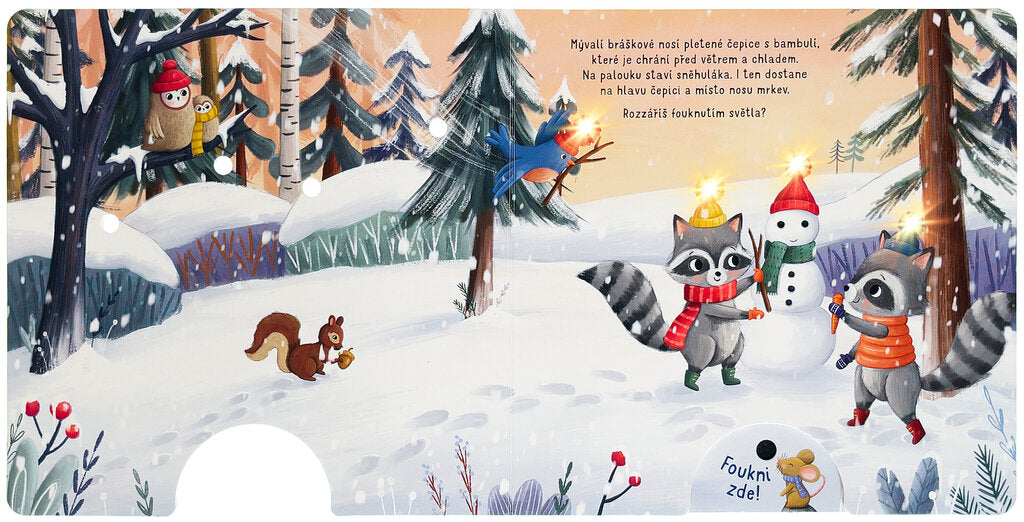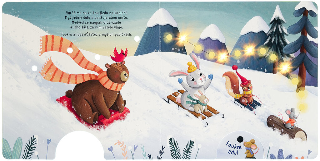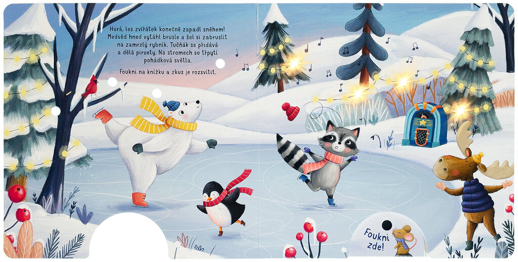 Foukni, rozsviť, počti si - fouknutím rozsviť světélka. Hurá, sněží! Zvířátka se v zimním lese radují z prvního sněhu. Medvěd bruslí na zamrzlém rybníku. Mývalové staví sněhuláka a další kamarádi sáňkují. A koho to vidí zvířátka na obloze? Někdo se blíží se sobím spřežením a veze všem dárky k Vánocům. Foukni na knížku a nechej rozzářit světélka, která ukážou cestu!