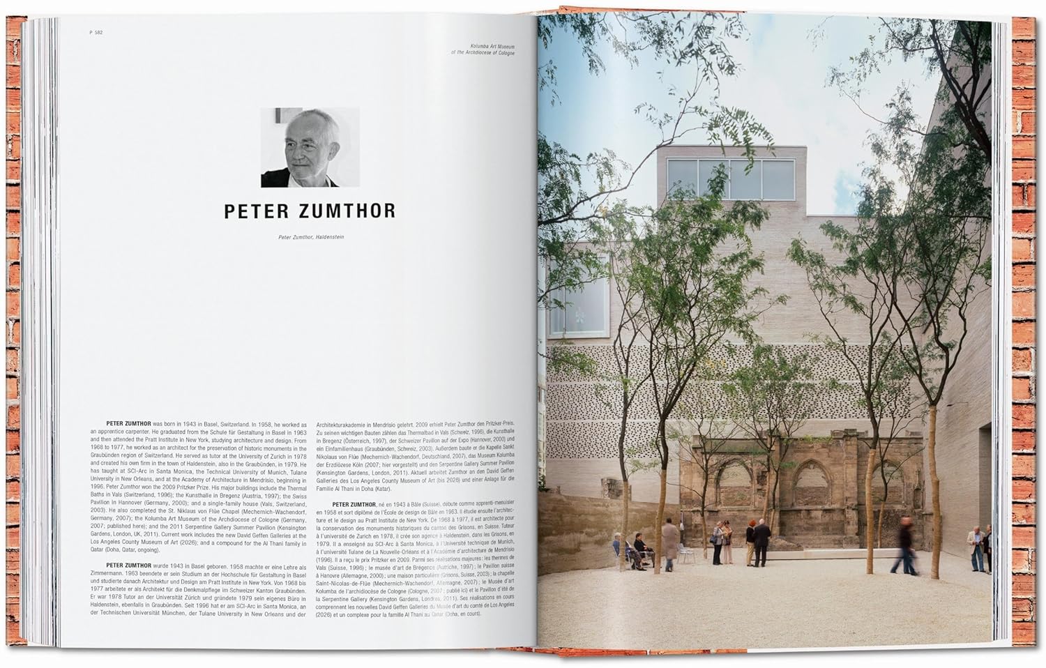 This comprehensive volume tours the world to cover the most exciting and innovative brick buildings of the past 35 years, from Paraguay to New Zealand. True to all TASCHEN architecture tomes, it includes new talents like Sanchit Arora from RENESA as well as established starchitects such as Renzo Piano and Peter Zumthor. Featured buildings showcase the variety of brick applications across cultural, domestic, infrastructure, and leisure spaces, including Tate Modern Switch House in London by Herzog & de Meuron, D’Houndt + Bajart’s Boa School Restaurant in Lille-Lomme, and MASS Design’s Maternity Waiting Village in Kasungu, Malawi.