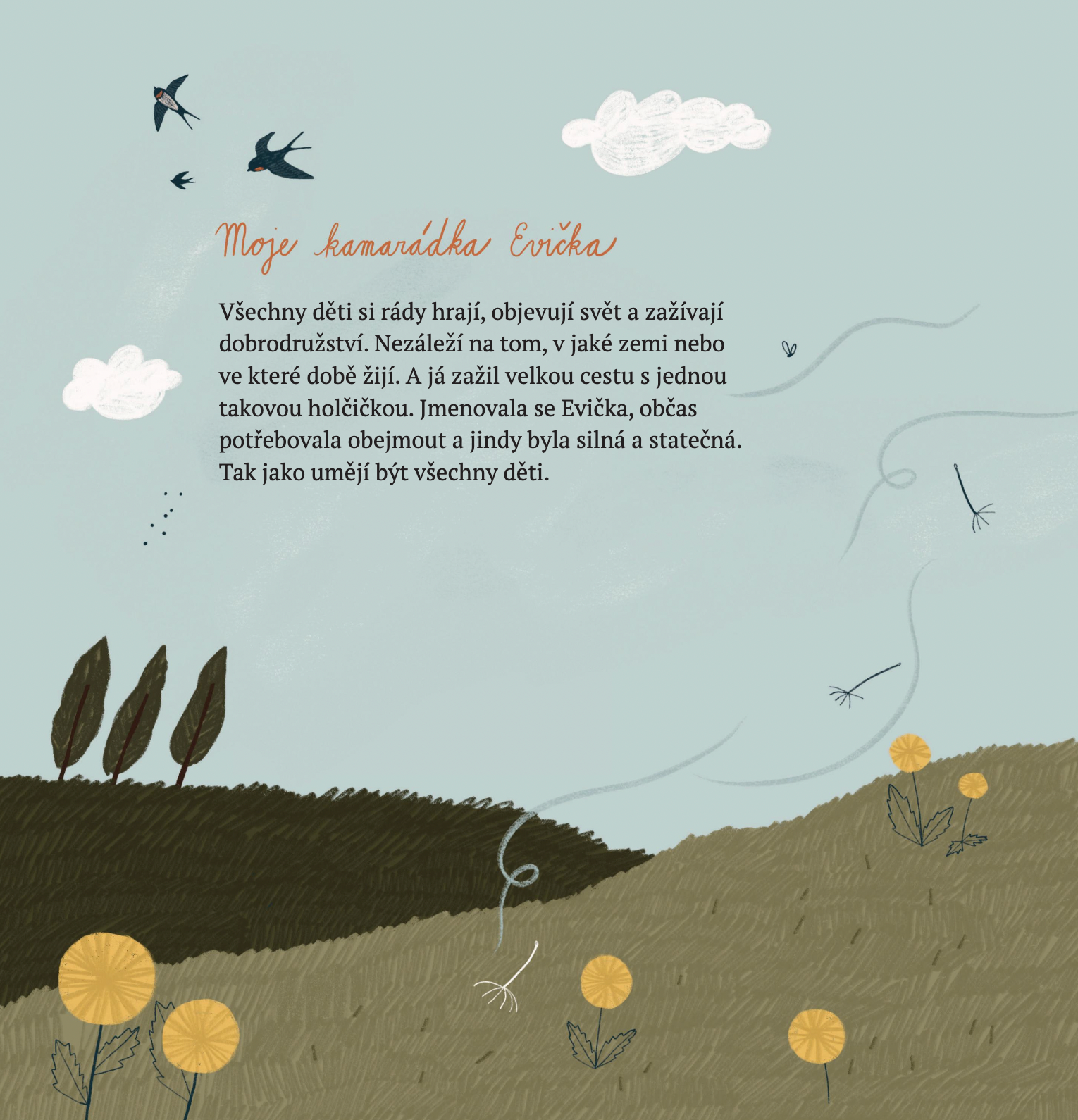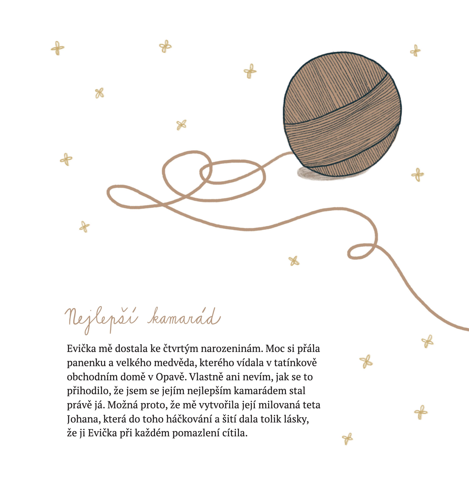 Herrmannovic Evička se narodila do krásných časů první republiky, svět se však začal měnit. Veselá holčička mohla mít život jako každé jiné dítě, ale vzhledem k okolnostem se musela stát silnou a statečnou. Čekala ji totiž velká cesta do neznáma. Do temných let, kterými probleskovaly jiskřičky přátelství a naděje. A do Terezína. Citlivé a ohleduplné vyprávění seznamuje děti s dobou, která změnila nejen tehdejší svět, ale možná i ten náš. A dává dětem i dospělým možnost podívat se na tuto kapitolu dějin očima holčičky a jejího věrného plyšového kamaráda.