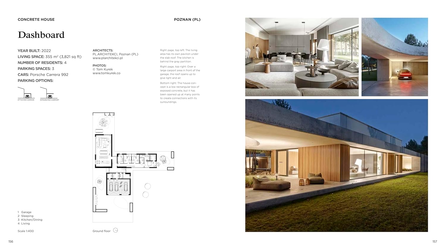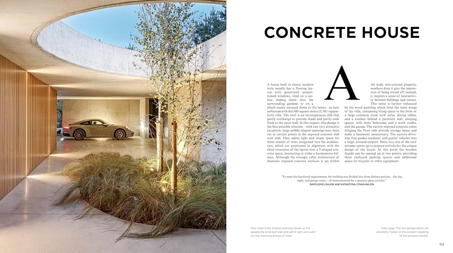 Kniha je strukturována jako sbírka 45 projektů z celého světa – od skromných jednogeneračních rodinných domů až po spektakulární rezidence, kde garáž a obytný prostor tvoří architektonicky jednotný celek. Vybrané ukázky projektů: