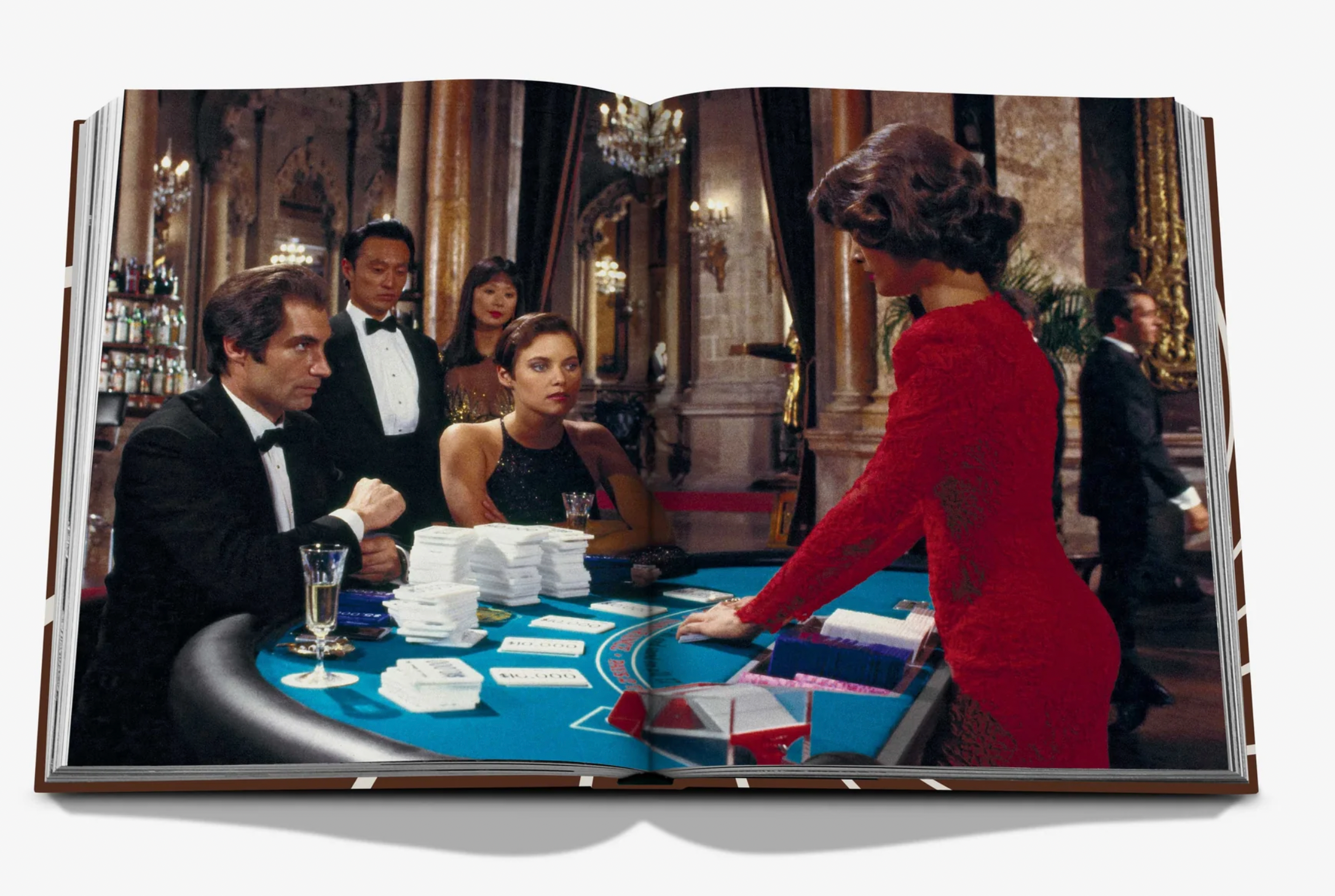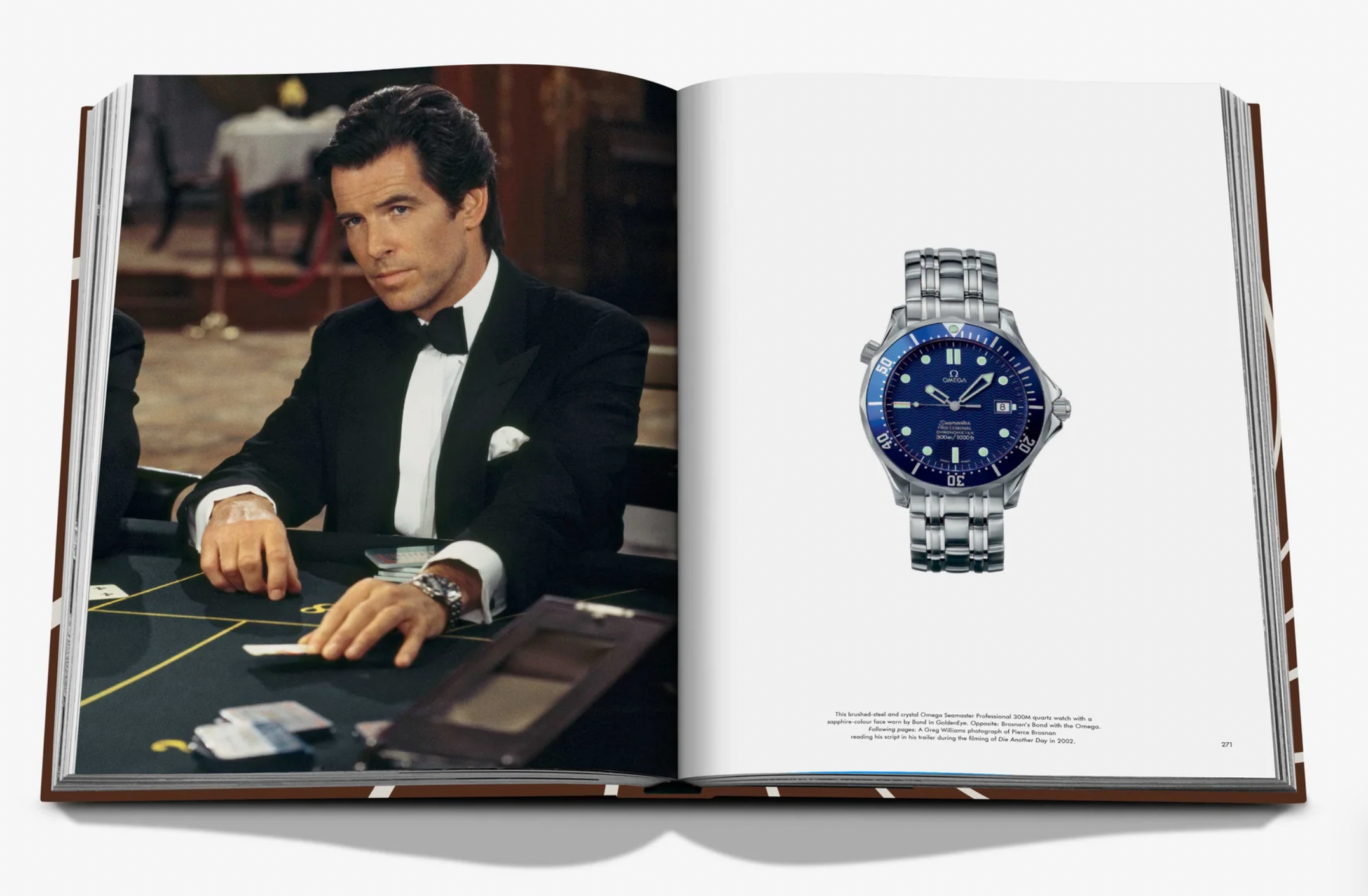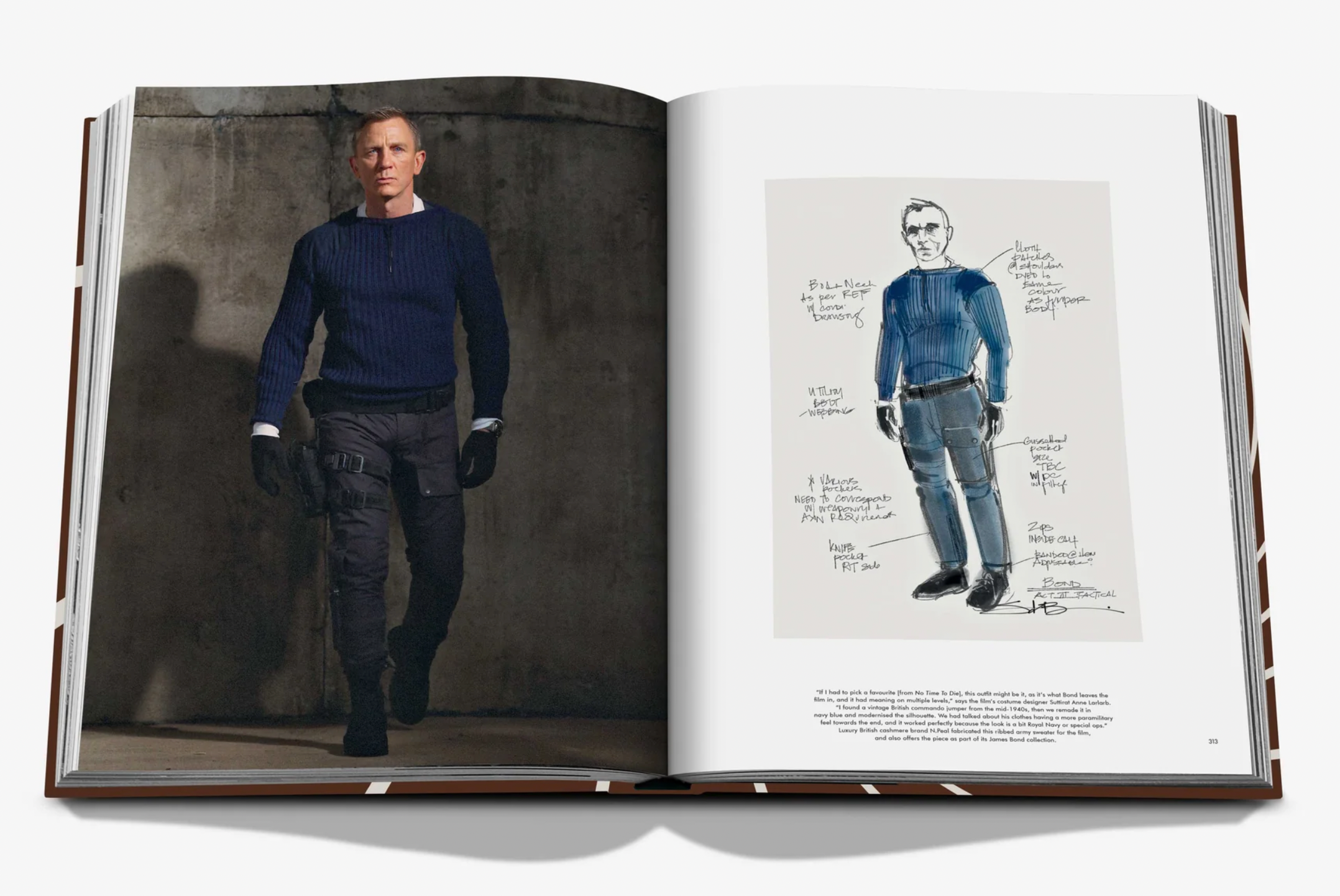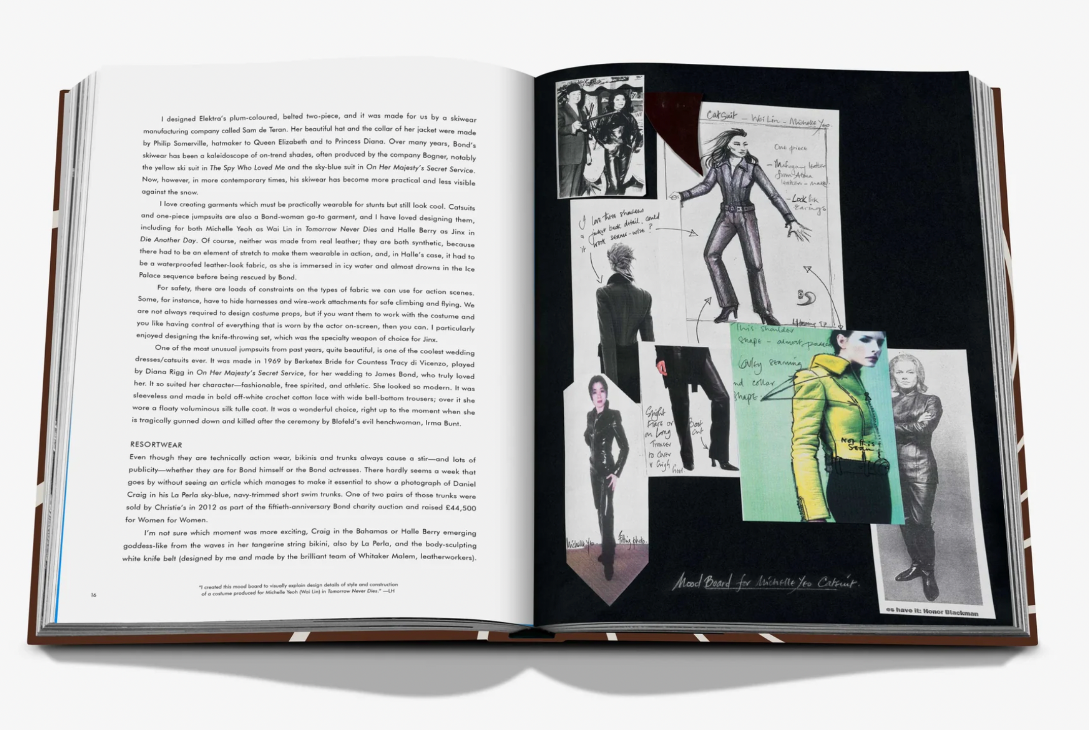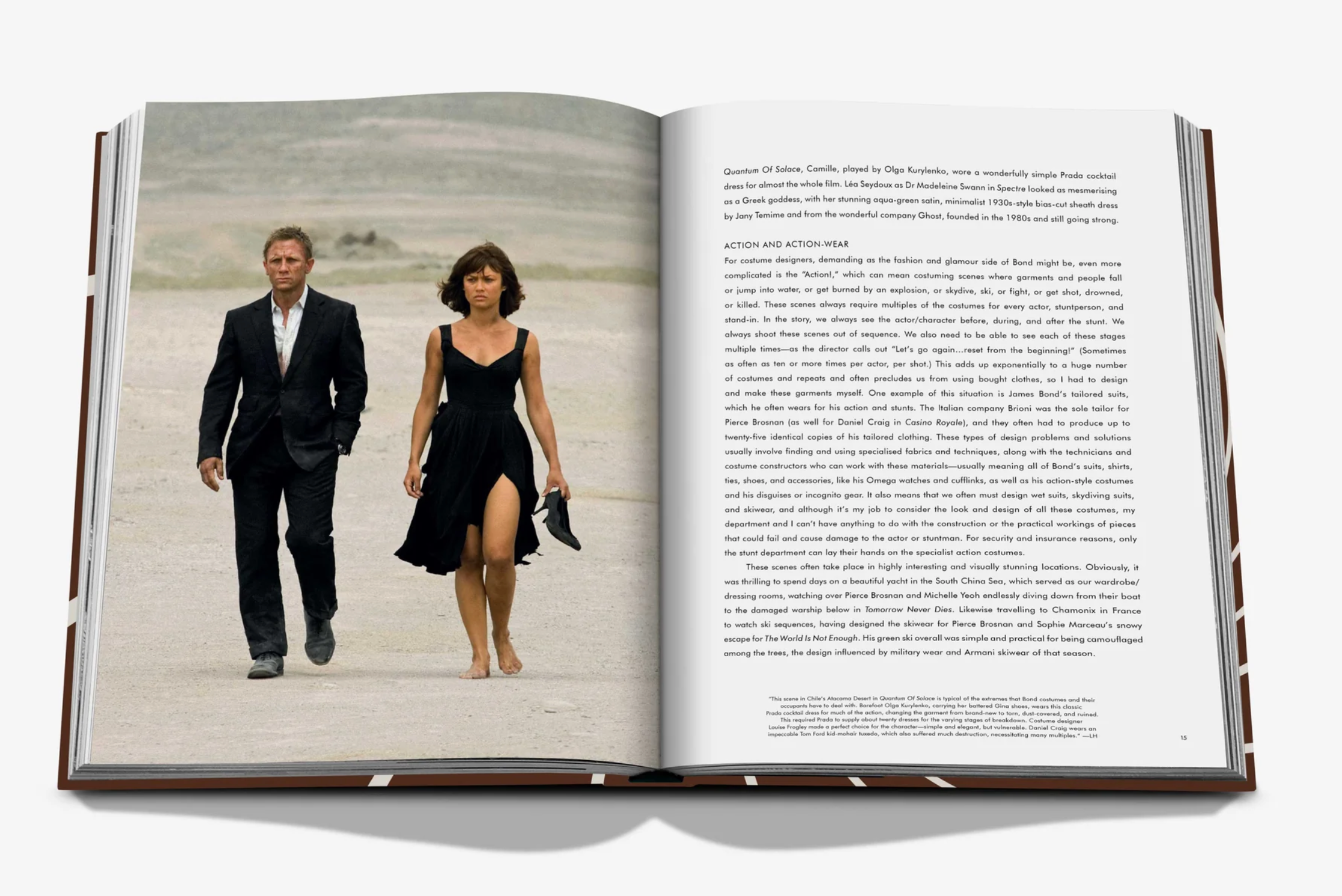 The book is separated by Bonds in chronological order, namely Sean Connery, Roger Moore, George Lazenby, Timothy Dalton, Pierce Brosnan, and Daniel Craig, each chapter filled with the most iconic looks from the actors’ films, from Dr. No to No Time To Die. In addition, there are extensive behind-the-scenes insights and stories from both the costume designers who worked on every movie as well the actual designers behind the outfits—think: Donatella Versace, Tom Ford, and Jenny Packham—plus a host of actors, from Pierce Brosnan and Daniel Craig to Michelle Yeoh and Grace Jones. These anecdotes reveal the sheer scale of the business that is Bond style, for instance, thirty-three bespoke Tom Ford tuxedos were made for No Time To Die in record time (and received just twenty- four hours before filming), while in Quantum Of Solace, Prada fabricated twenty dresses for Olga Kurylenko—as she wore the piece through most of the film, they needed one dress for each stage of the action, from brand-new to dust-covered to ruined.