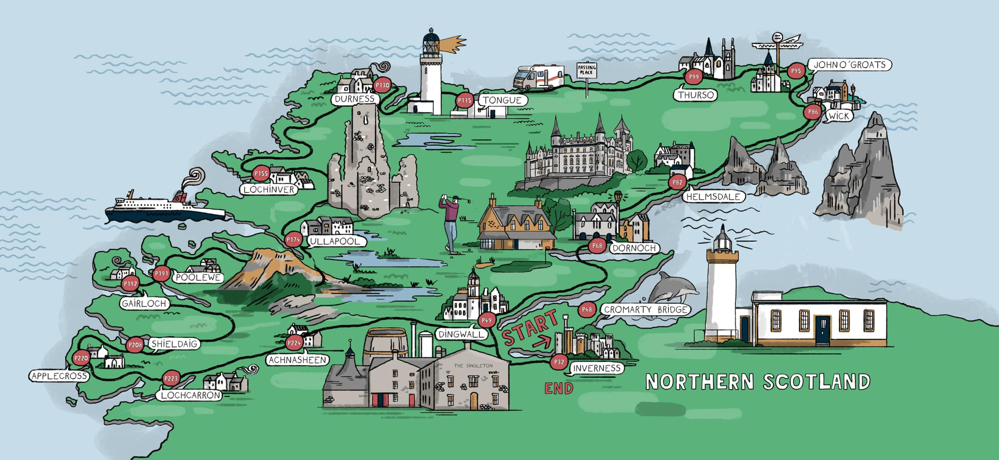 - Covers: Inverness to Black Isle; Black Isle to Dornoch; Dornoch to Wick; Wick to Thurso; Thurso to Tongue; Tongue to Durness; Durness to Lochinver; Lochinver to Ullapool; Ullapool to Gairloch; Gairloch to Shieldaig; Shieldaig to Inverness
