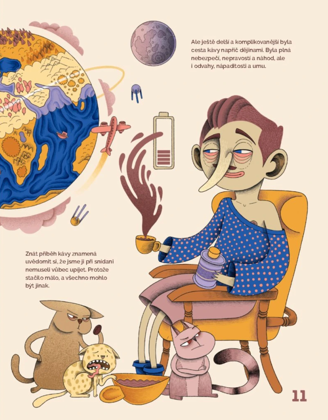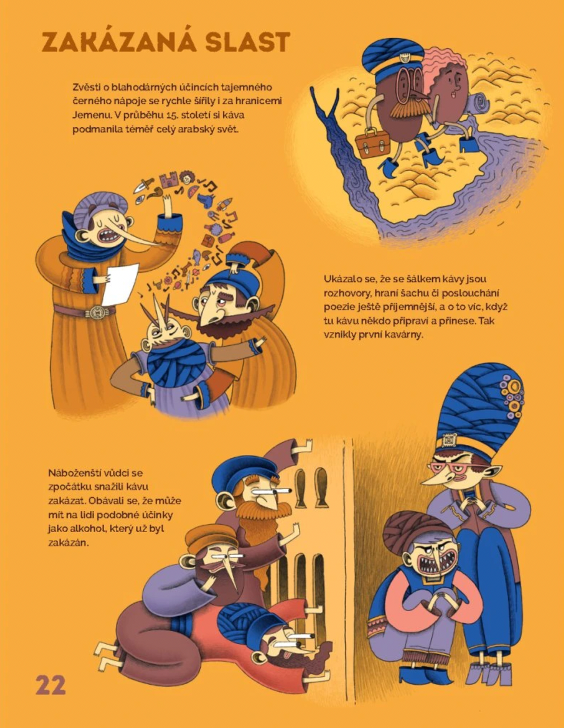 Vítejte ve fascinujícím světě kávy – nápoje, bez něhož dnes mnoho z nás nedokáže vstát z postele. Šálek černého moku pro nás představuje samozřejmý začátek dne. A přece musel tento milovaný nápoj předtím, než se dostal na náš snídaňový stůl, překonat neuvěřitelnou cestu napříč kontinenty i dějinami. Ilustrátor Dávid Soboň tuto fascinující a spletitou cestu zmapoval a vytvořil obrázkovou knížku, která je ideální (a snad i vtipnou) společnicí k šálku kávy. Protože s poznáním kávového příběhu je každý doušek ještě plnější a lahodnější.