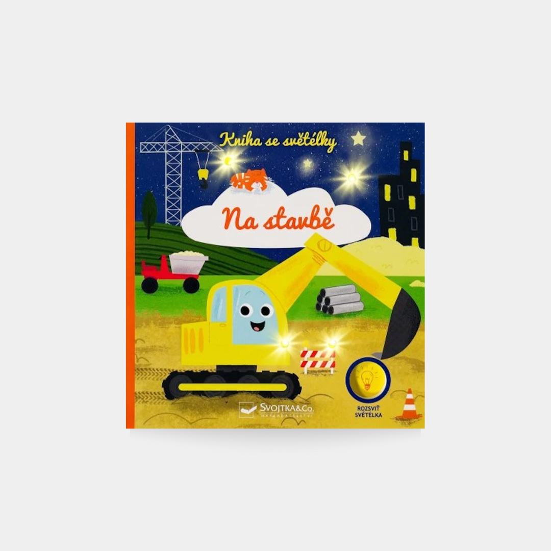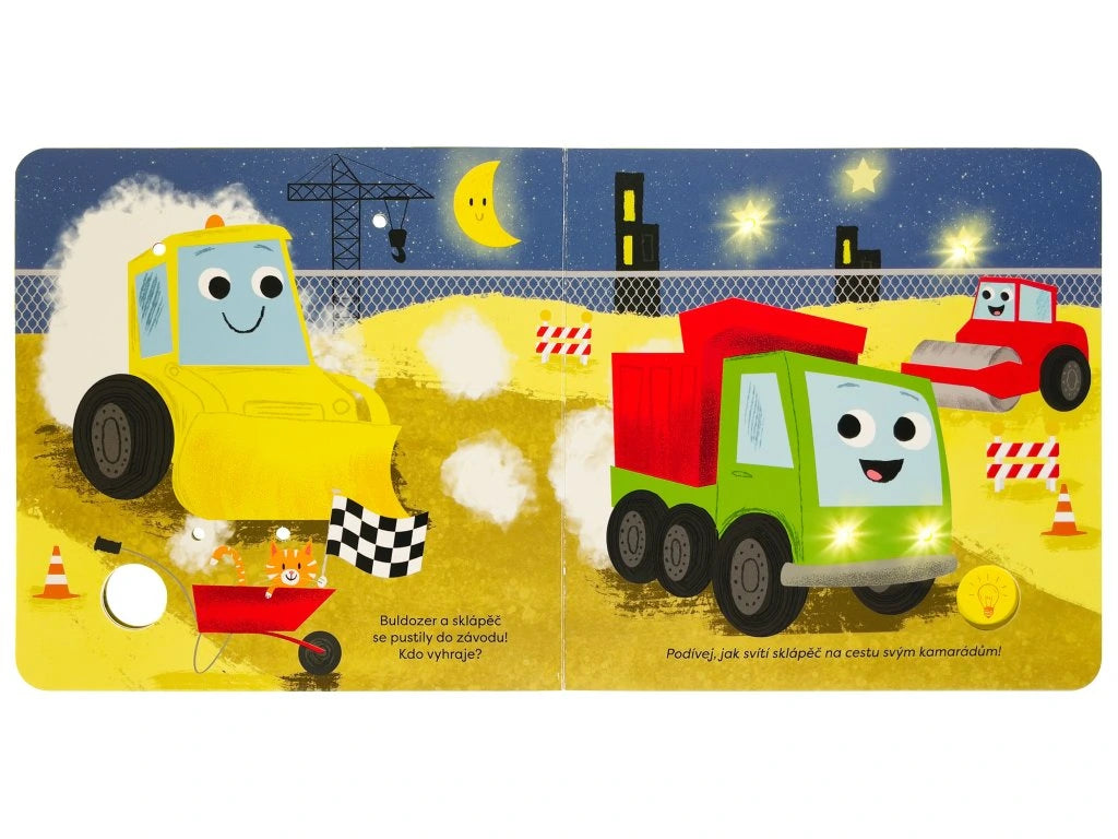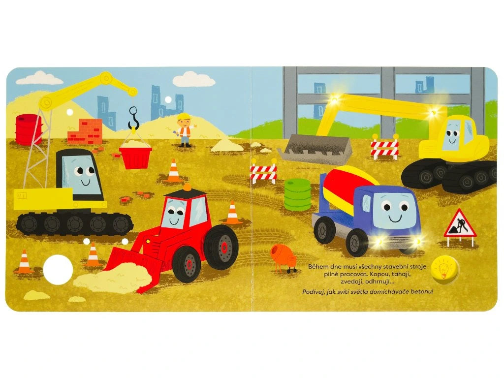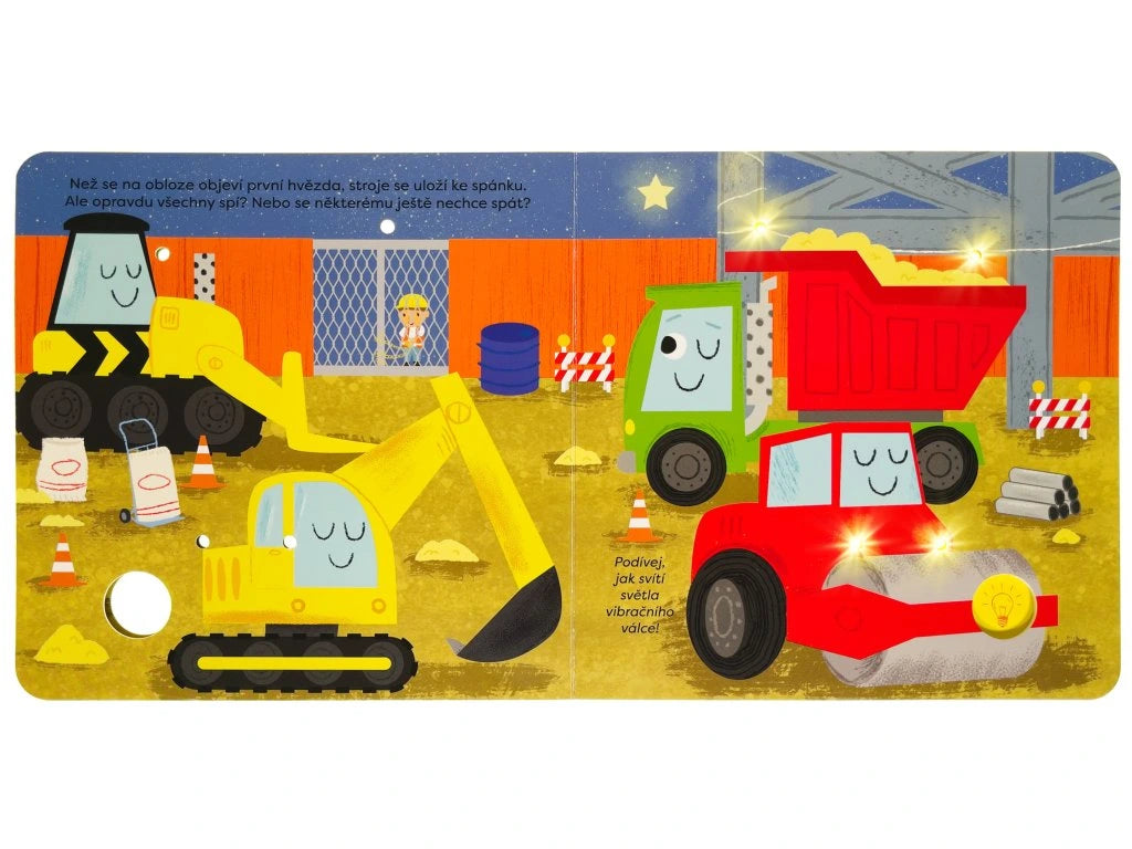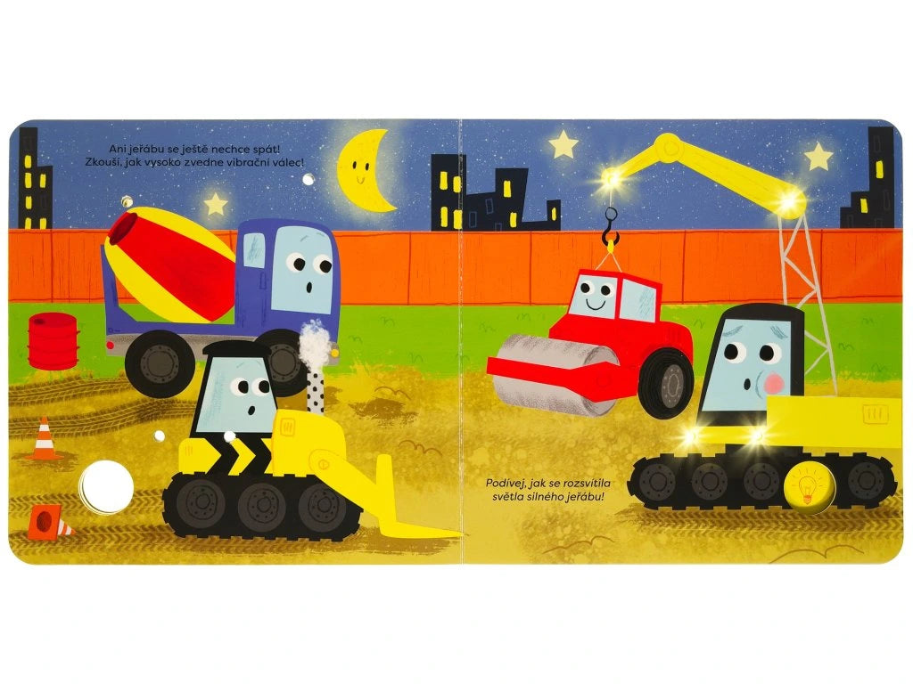 Po stisknutí tlačítka se rozsvítí světla jeřábu, bagru i hvězdičky na obloze. Zjistěte, co se děje na stavbě v noci. Ideální knížka na dobrou noc.