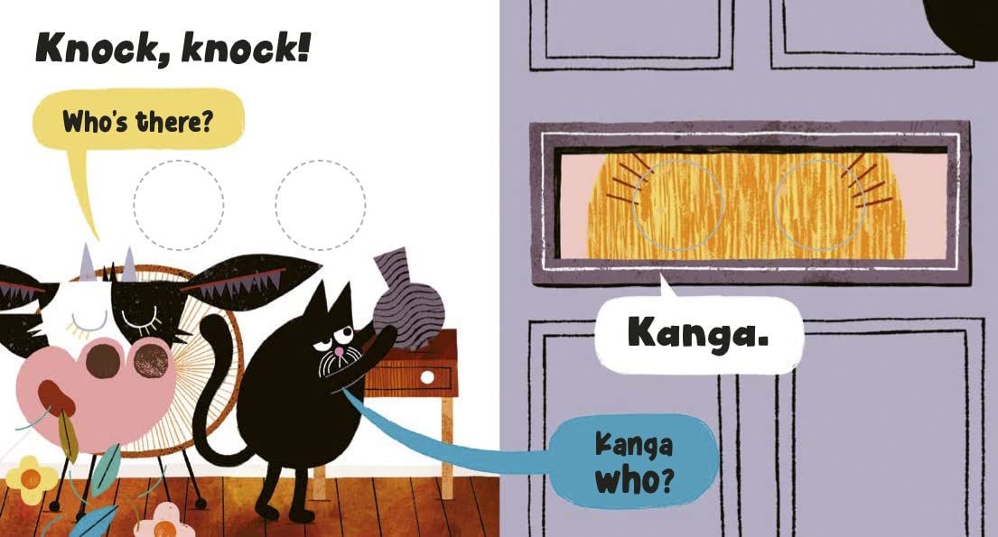 Knock on the door and wait to be asked, "Who's there?" before turning the page to discover a different googly-eyed animal with a punchline overleaf.