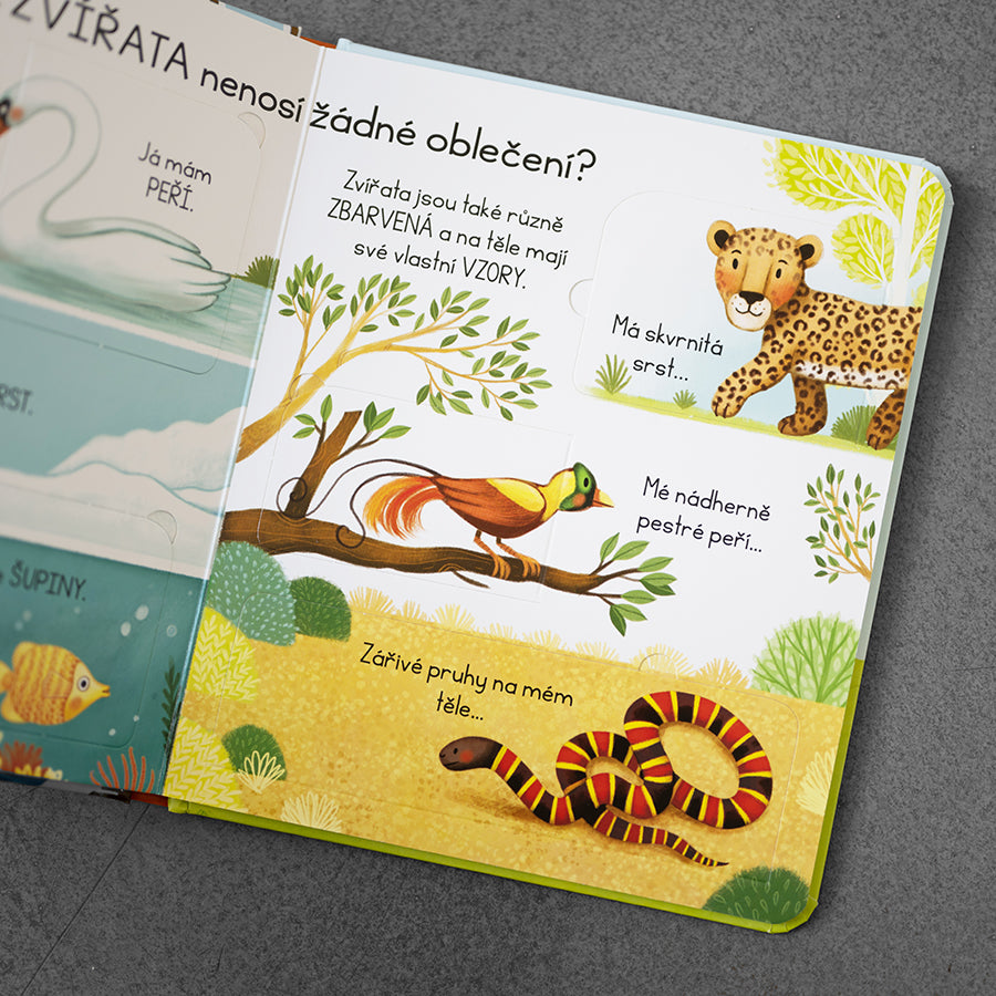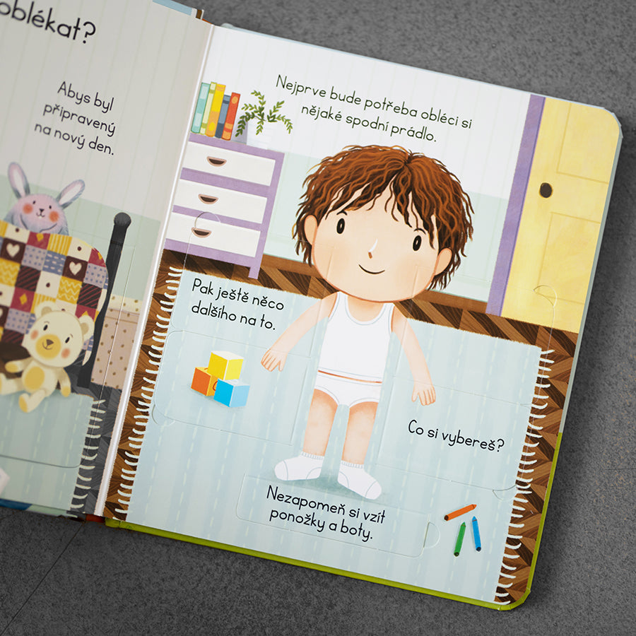 Proč nemůžu celý den nosit jen pyžamo? A co si mám vzít místo něj? Tato ilustrovaná knížka s odklápěcími okénky srozumitelnou formou dětem vysvětluje, jaké oblečení je vhodné do konkrétního počasí nebo pro speciální událost. Podněcuje v dětech zájem o to, aby se samy a správně rozhodly, co si oblečou. V tomto roztomile ilustrovaném leporelu najdou pod okénky spoustu příkladů toho, k čemu slouží různé druhy oblečení nebo doplňků a co si právě vzít na sebe. Výběr vhodného oblečení bude díky této knížce o poznání jednodušší. K čemu slouží speciální cyklistické kraťasy nebo neoprenová kombinéza? Jak se oblékala egyptská královna, starověký Říman nebo indián? A proč zvířata nemusí nosit žádné oblečení? Pojďme to všechno zjistit! České vydání publikace nakladatelství Usborne.
