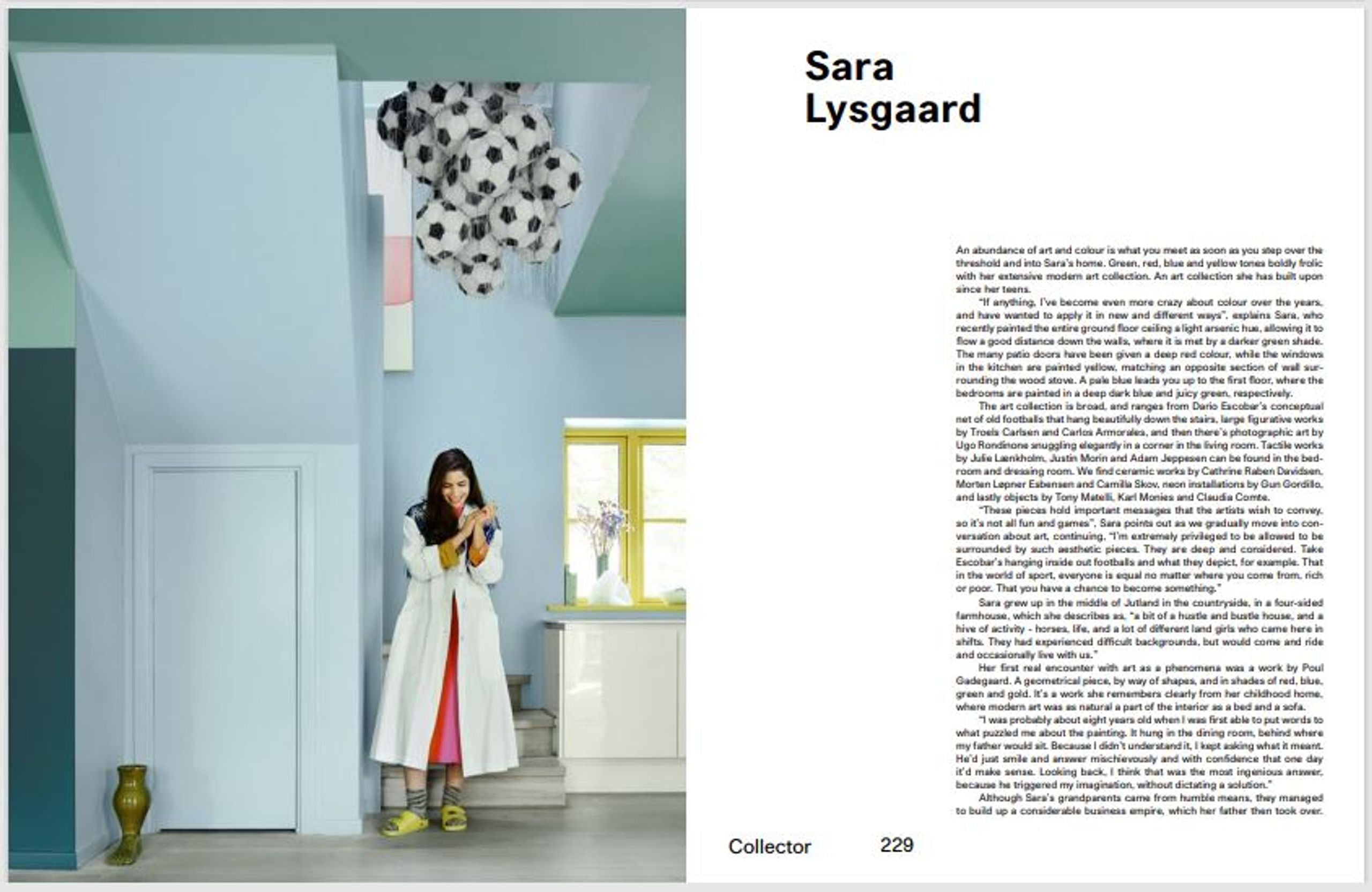 This book takes you on private visits to ten Danish contemporary artists, where we are allowed be- hind-the-scenes insight into the creative process. We see both ongoing and completed works, the materials, tools and thought processes used, Through conversations with the artists, we are party to their own stories as to why they became artists, and how they arrived to where they are today. What consumes them? What drives them? What inspires them? After each artist portrait, we are welcomed inside the individual homes of true art collectors. Some are vibrant and colourful. Others are monochrome and more subdued. Some are very feminine while others exude masculinity.The common denominator is that they are brimming with art and that everything has been thought through, They also happen to have a work by the artist we have just visited. We ask what art means to them and show how they align themselves with the pieces.