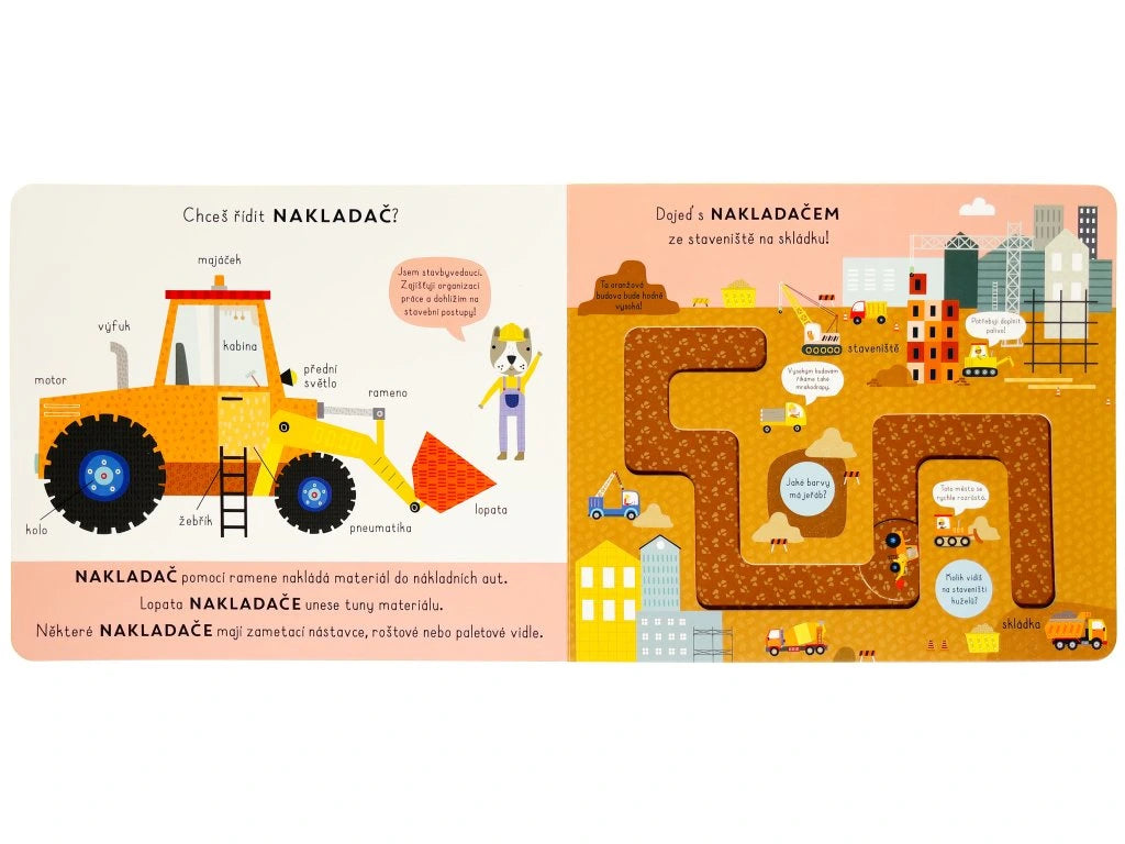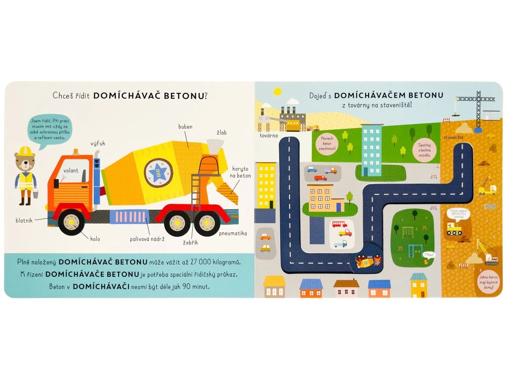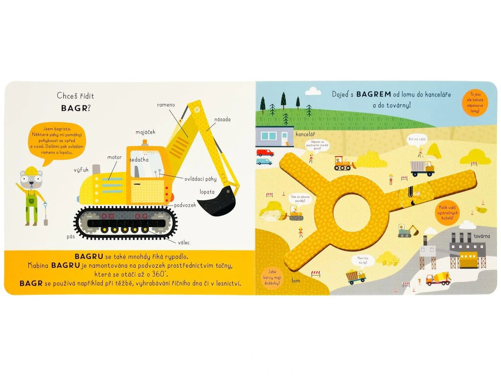 Zjisti o stavebních strojích spoustu zajímavostí a pomocí popisků u každého z nich se dozvíš, z čeho se skládají. Poté se s posuvnými kolečky můžeš projet po trasách po nejrůznějších staveništích a poznat i je! Víš, kolik může vážit domíchávač betonu? Jak se řídí bagr a kde se na nakladači nachází lopata? To a spoustu dalšího se dozvíš v tomto hravém, ale i velmi poučném leporelu s posuvnými kolečky.