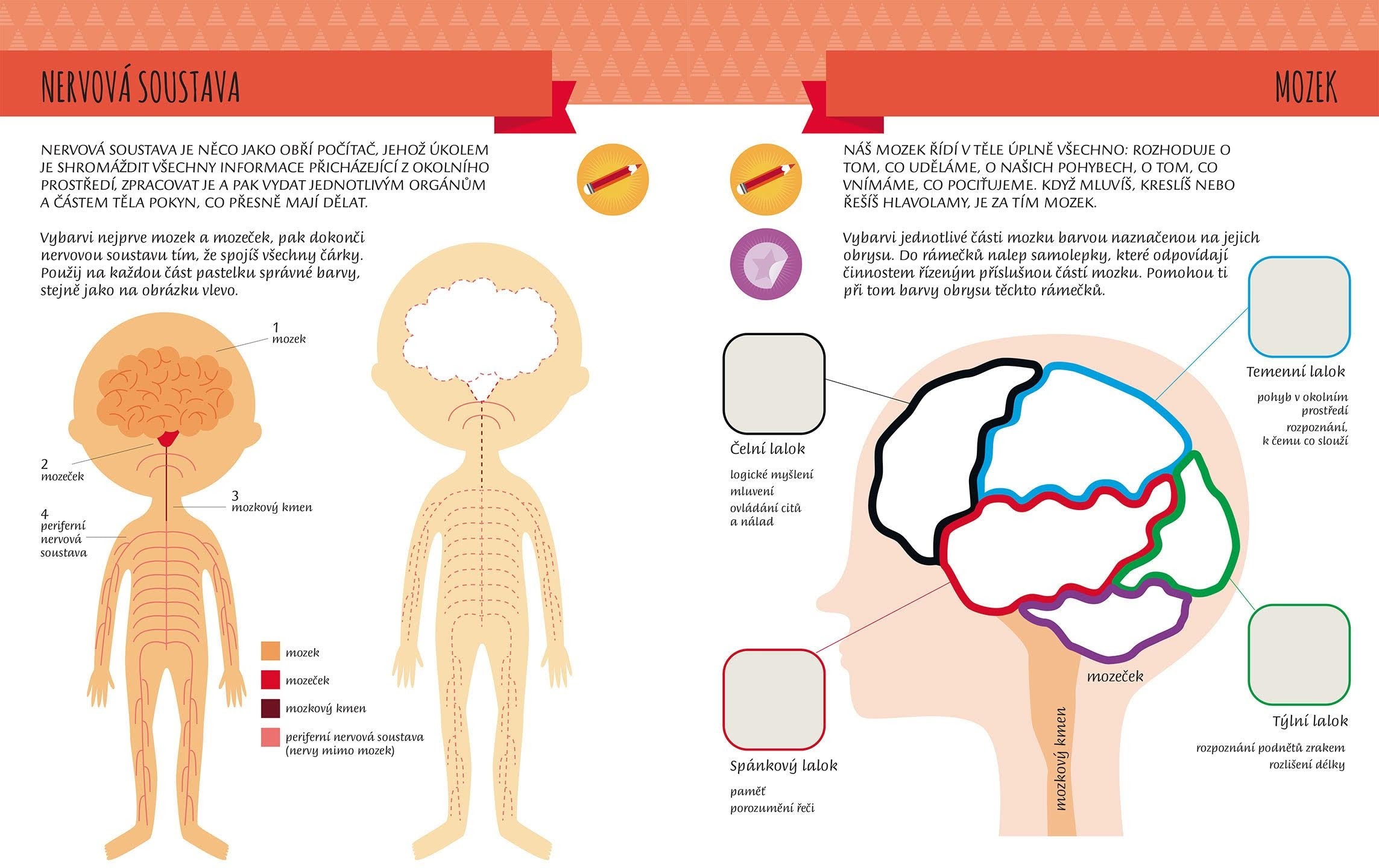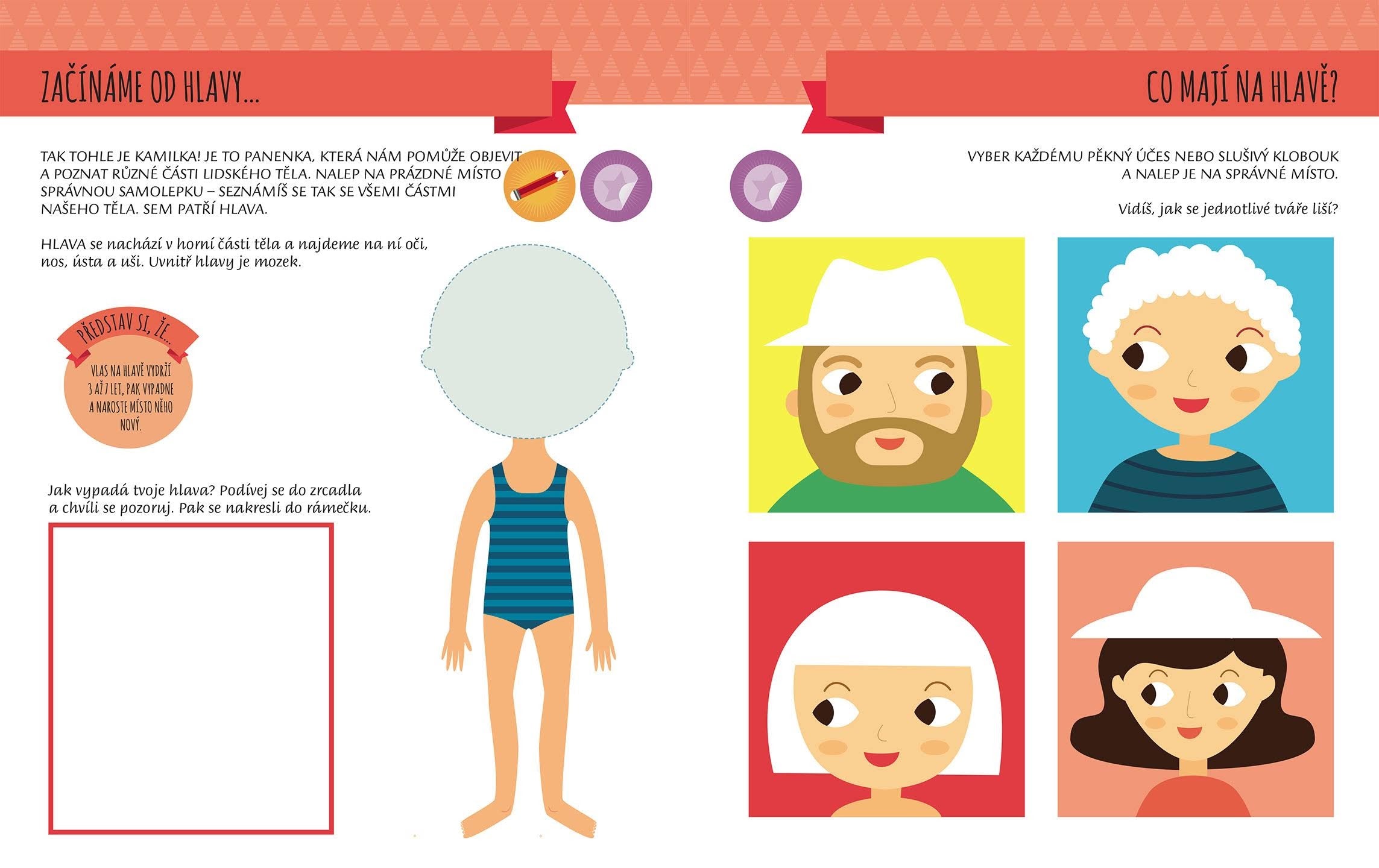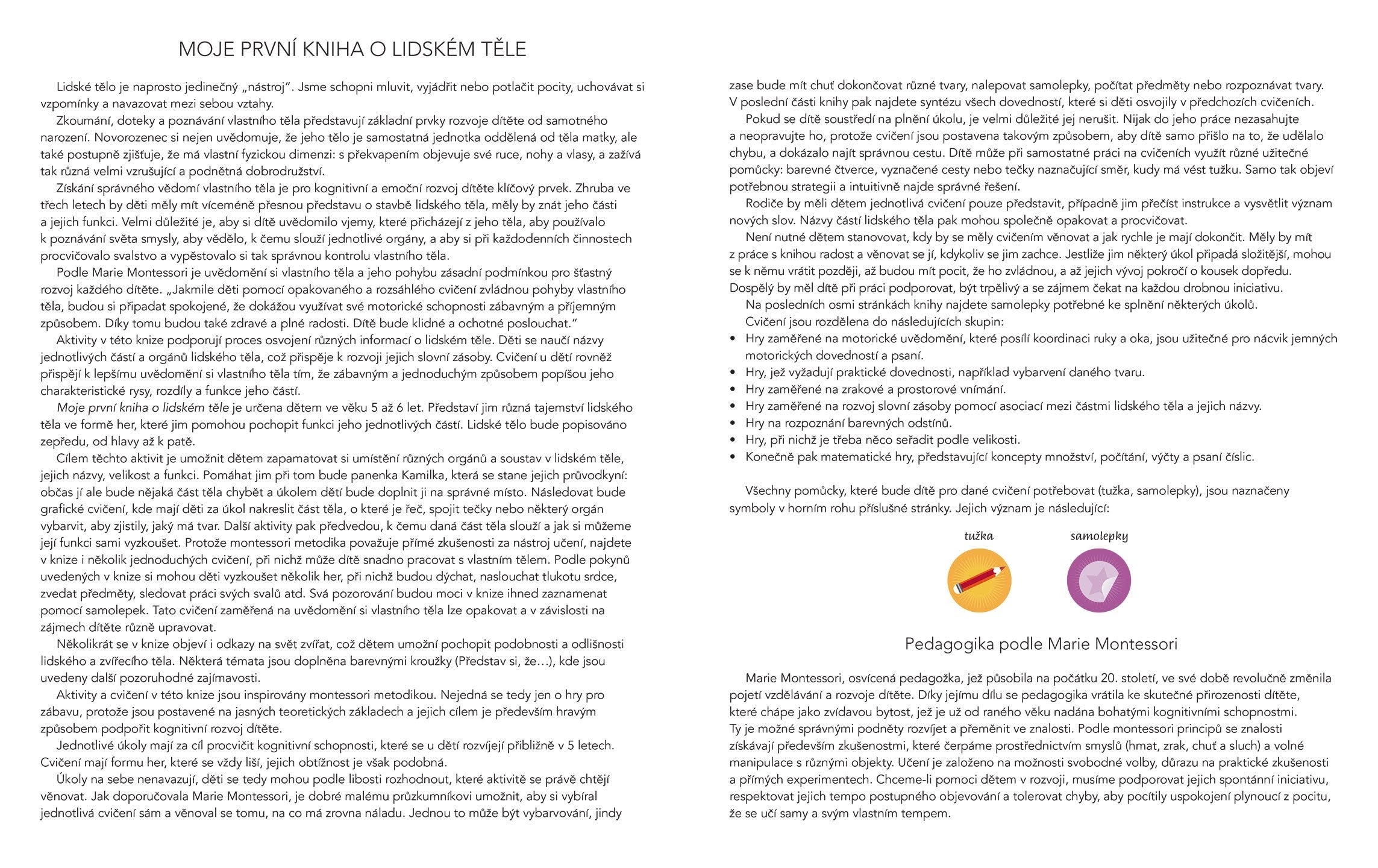 V knize se vydáš na dobrodružnou cestu za tajemstvím lidského těla. Prozkoumáš jeho jednotlivé části, dozvíš se, jak fungují třeba naše oči, jaké různé druhy očí můžeme vidět u zvířat, jak vypadá srdce nebo kostra člověka... Čekají tě důležité úkoly doplnit jí pomocí samolepek chybějící části těla a obléct ji. Budeš hledat cestu v bludišti, hrát hry, dokreslovat čáry, vybarvovat a hlavně nalepovat samolepky. Naučíš se mluvit pár slov rukama, vyjádřit pusou různé pocity a nálady, nakreslíš si autoportrét, prostě s lidským tělem si užiješ spoustu zábavy.
