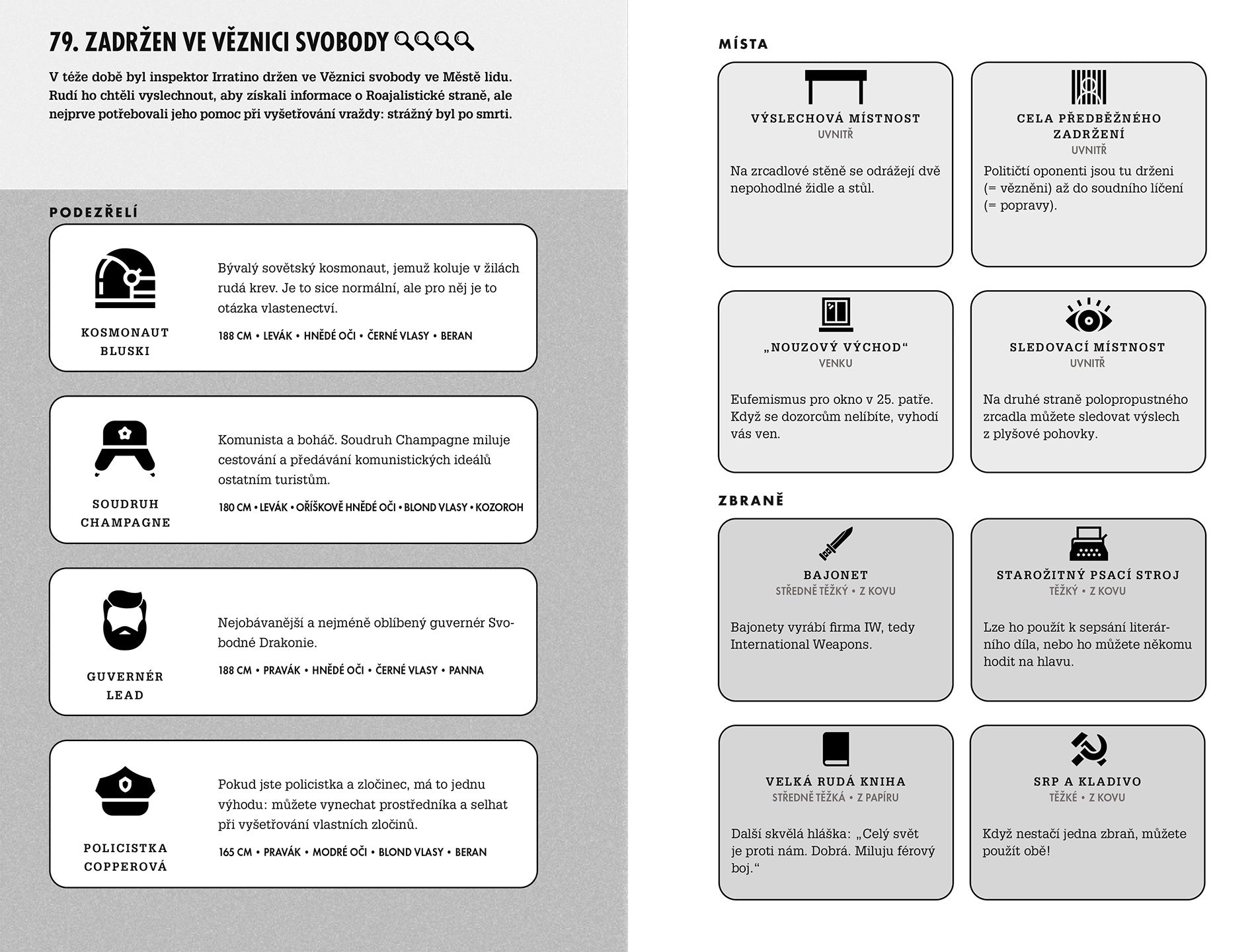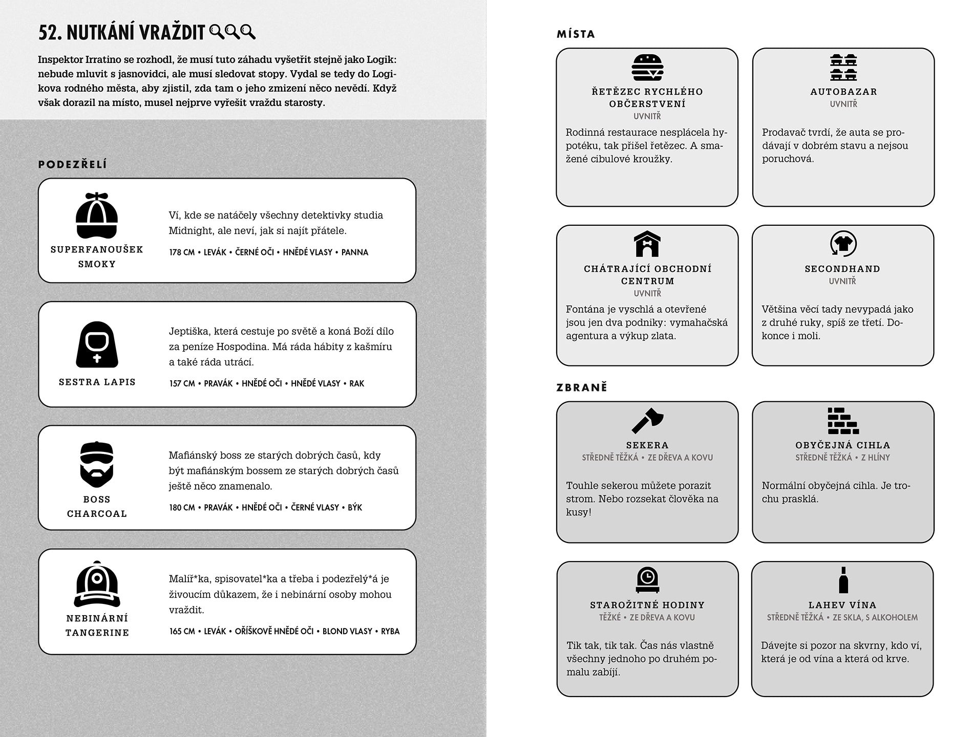 U každého případu je mřížka s políčky, kam si zaznamenáte vše, co vypátráte… Mřížka je vyplněná – a vida, máte vraha! Tak jednoduché to ale vždy nebude, případy jsou stále složitější. Svědkové se pokoušejí vás zmást, nevíte, který říká pravdu a který lže. Součástí knihy jsou naštěstí nápovědy, které vás nasměrují ke správné odpovědi, když si nebudete vědět rady (ale to jistě nebude často). A řešení vám potvrdí, jestli máte logické uvažování skutečně v malíku. Jen mimochodem – odhalování vraha v partě kamarádů má také něco do sebe.