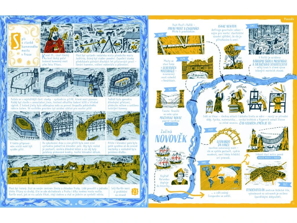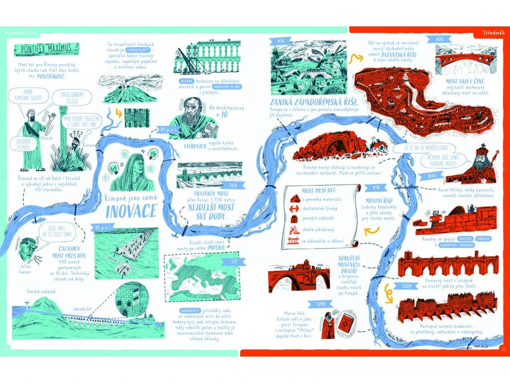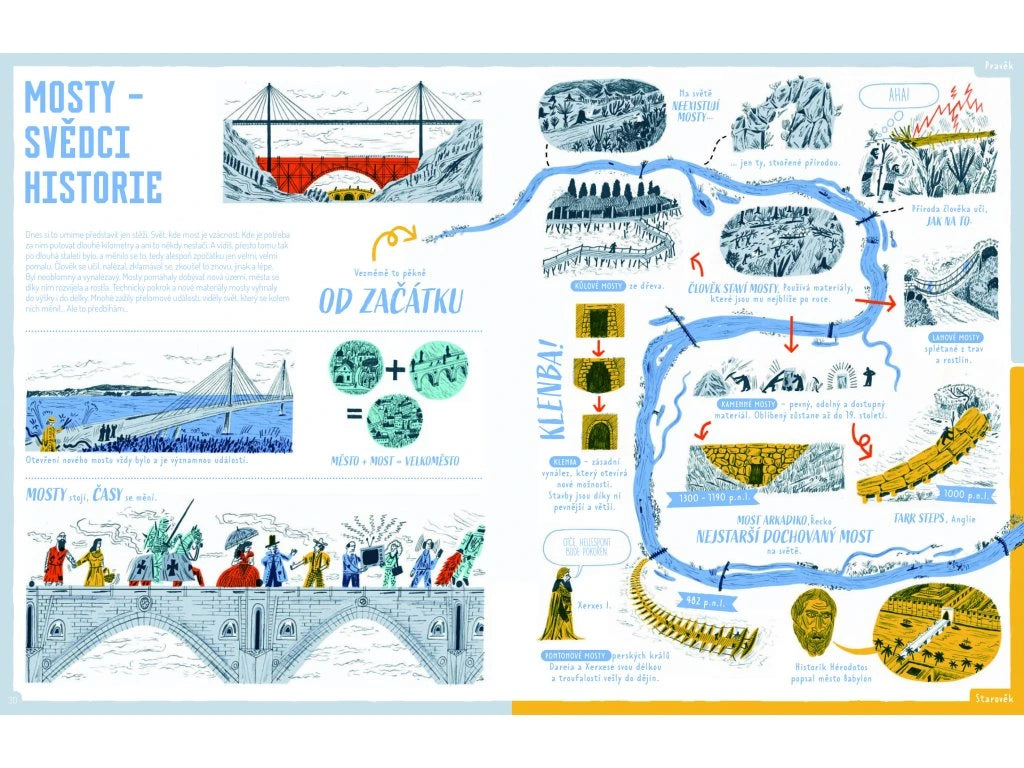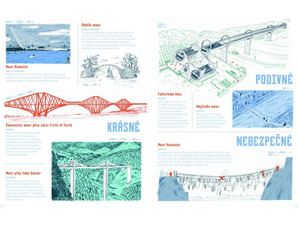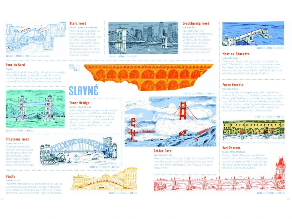 Most je geniální vynález. Díky němu si můžeme zkrátit cestu, ušetřit síly nebo si užít neopakovatelné výhledy. Člověk mosty buduje od chvíle, kdy poprvé přešel spadlý kmen stromu přes řeku. Tato velká obrazová kniha přináší příběhy více než sedmdesáti mostu — od Golden Gate v San Francisku přes francouzský akvadukt Pont du Gard až po náš Karlův. Vysvětluje, jak se mosty staví a jakou roli hrály v dějinách i v umění. Ukazuje, že na mosty lze narazit také u zubaře, při sportu nebo hře na hudební nástroj. A navíc prověří vaše konstruktérské dovednosti při stavbě špagetového mostu.
