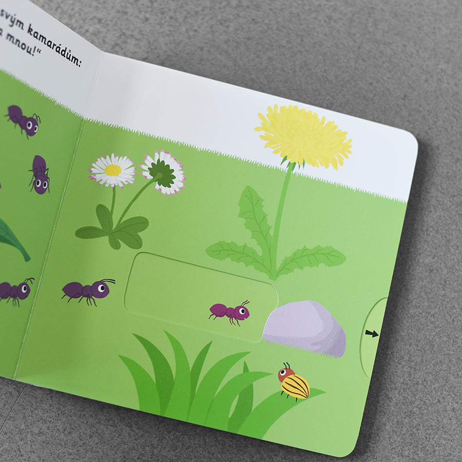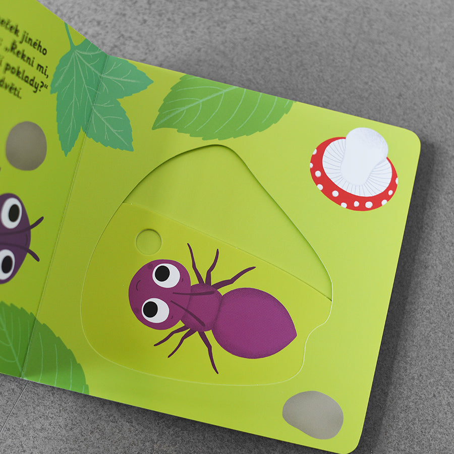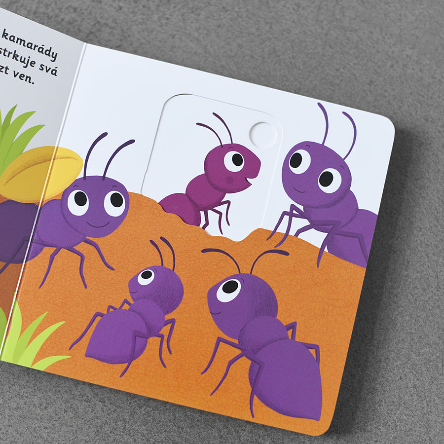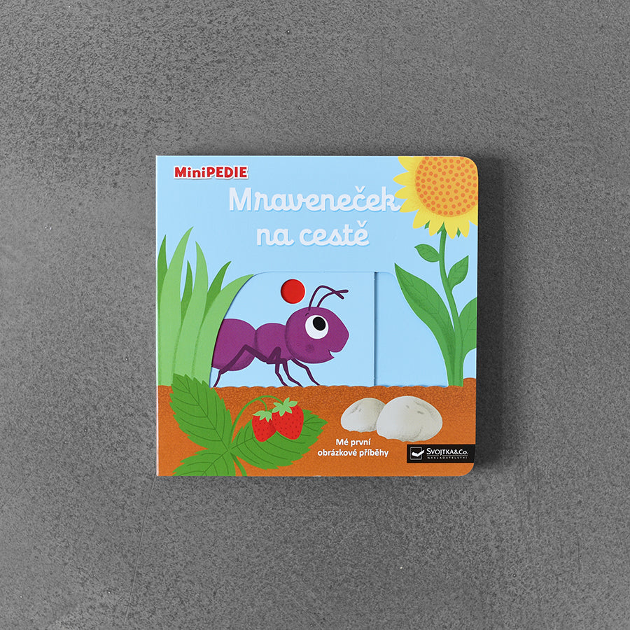 Mraveneček vystrčil tykadla z mraveniště a už běží objevovat a prozkoumávat okolí. Všichni mravenci pilně pracují a náš mraveneček pomáhá ostatním najít správnou cestu a donést do mraveniště zajímavé poklady. Objevovat svět s tímto leporelem pro nejmenší děti od jednoho roku je tak zábavné! Pevné stránky s pohyblivými prvky procvičí i jemnou motoriku. Stačí jen vložit prstík do správného otvoru a lehce vysunout, zatáhnout nebo otočit a hned bude váš malý objevitel znát odpovědi.