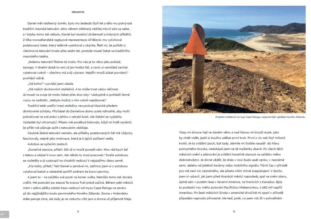 Nesamota zaznamenává Timova dobrodružství na každém kroku jeho cesty – dělí se s námi o útrapy způsobené odloučením od domova a rodiny, ale také o přínosy svého putování včetně přátelství s cizími lidmi, které cestou potkal. Kniha obsahuje množství nádherných fotografií a kreseb, jejichž autorem je sám Tim, a přináší čtenářům inspirativní příběh o svobodě, přátelství a propojení s ostatními.