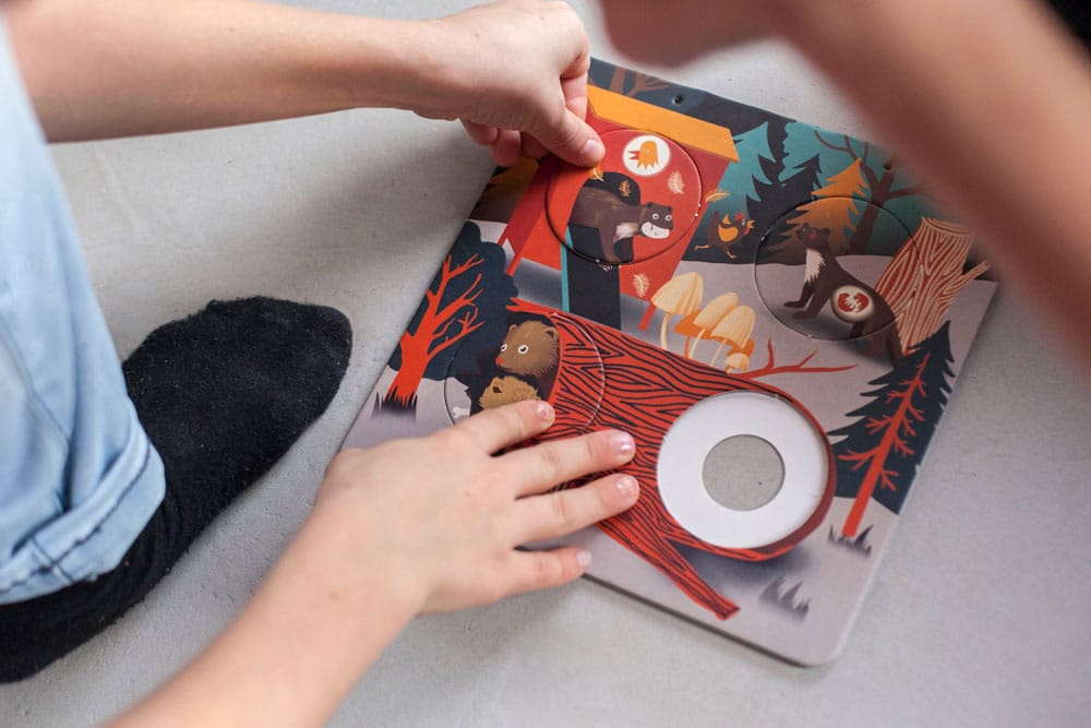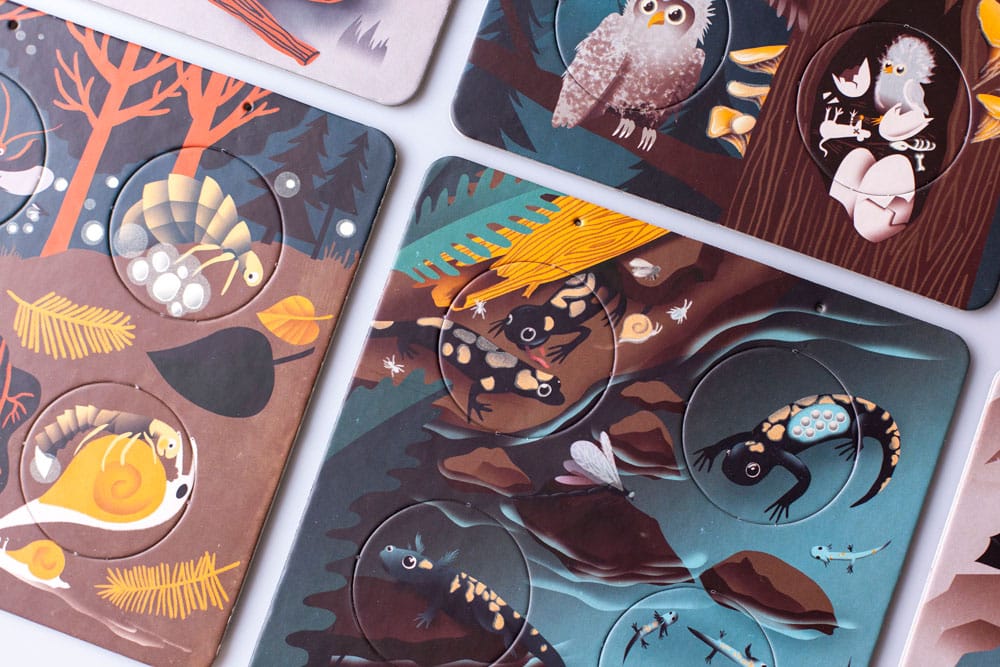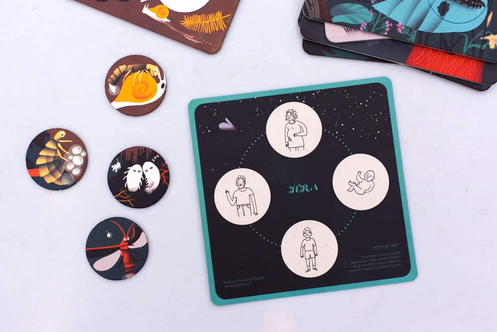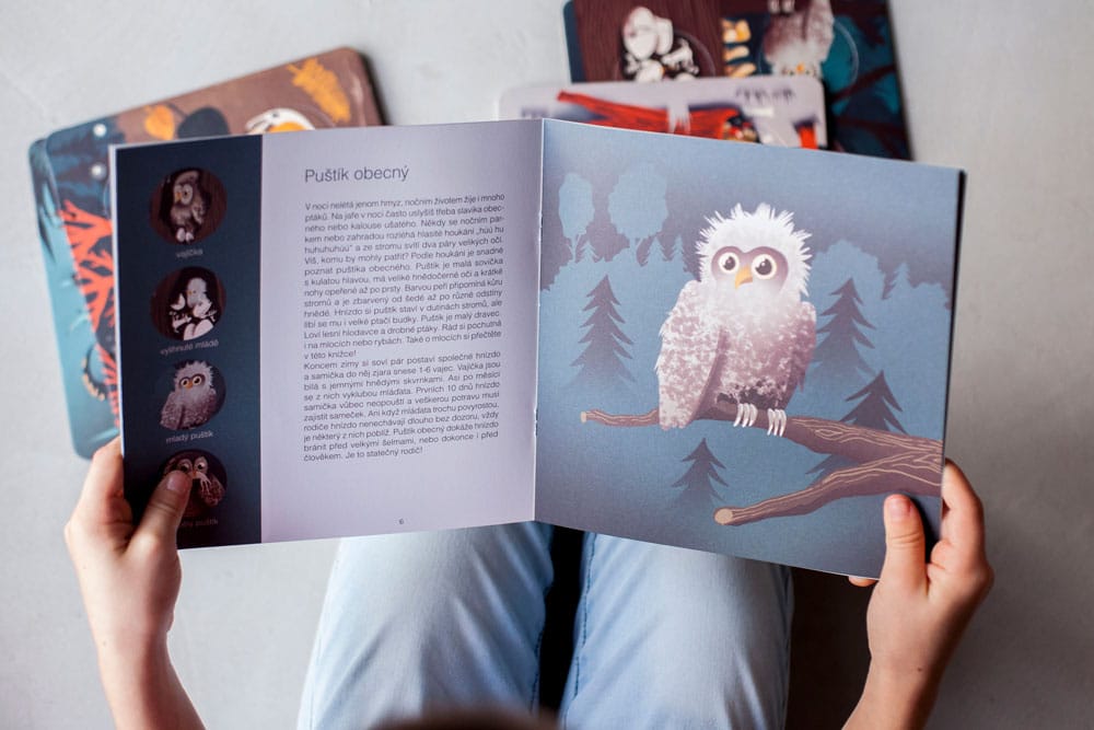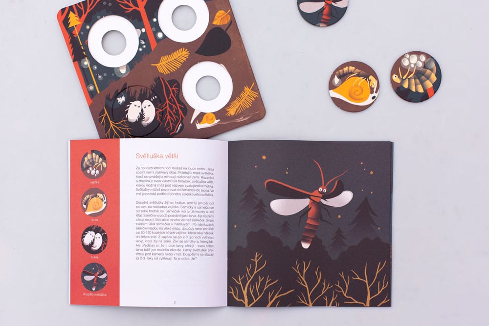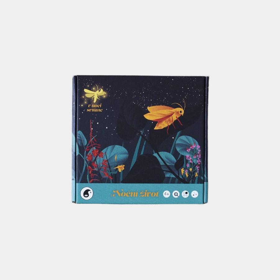 "Tato interaktivní knížka přináší zajímavosti o životě 6-ti nočních zvířat. Své tělesné proměny ti ukáže netopýr, puštík, kuna, lišaj a světluška. Zkus kruhové žetony sestavit tak, aby vznikl úplný obrázek vývoje zvířete. V úplné tmě ti navíc karty prozradí další malá tajemství."