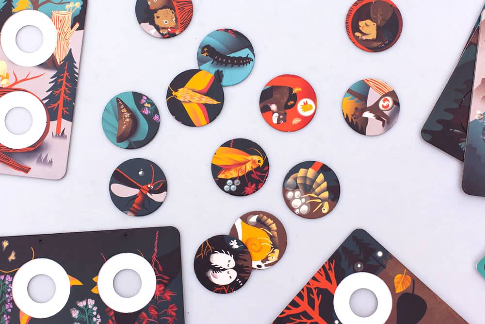 Balení obsahuje: 1 brožura, 1 hrací podložka, 6 karet s otvory, 24 vkládacích žetonů, KARTY VE TMĚ SVÍTÍ