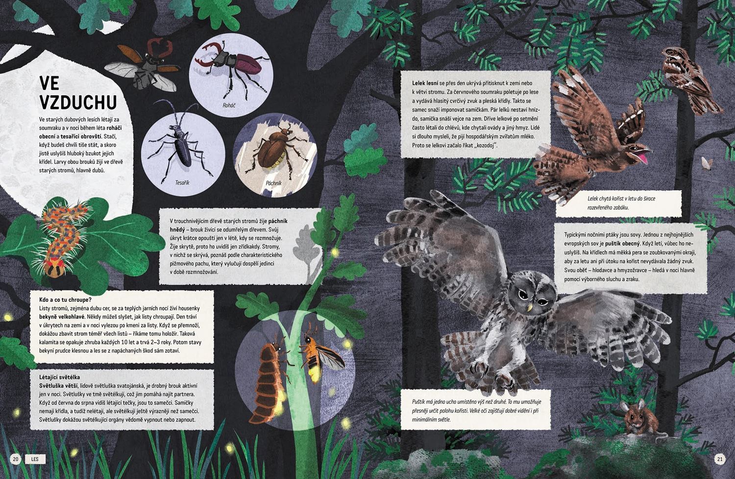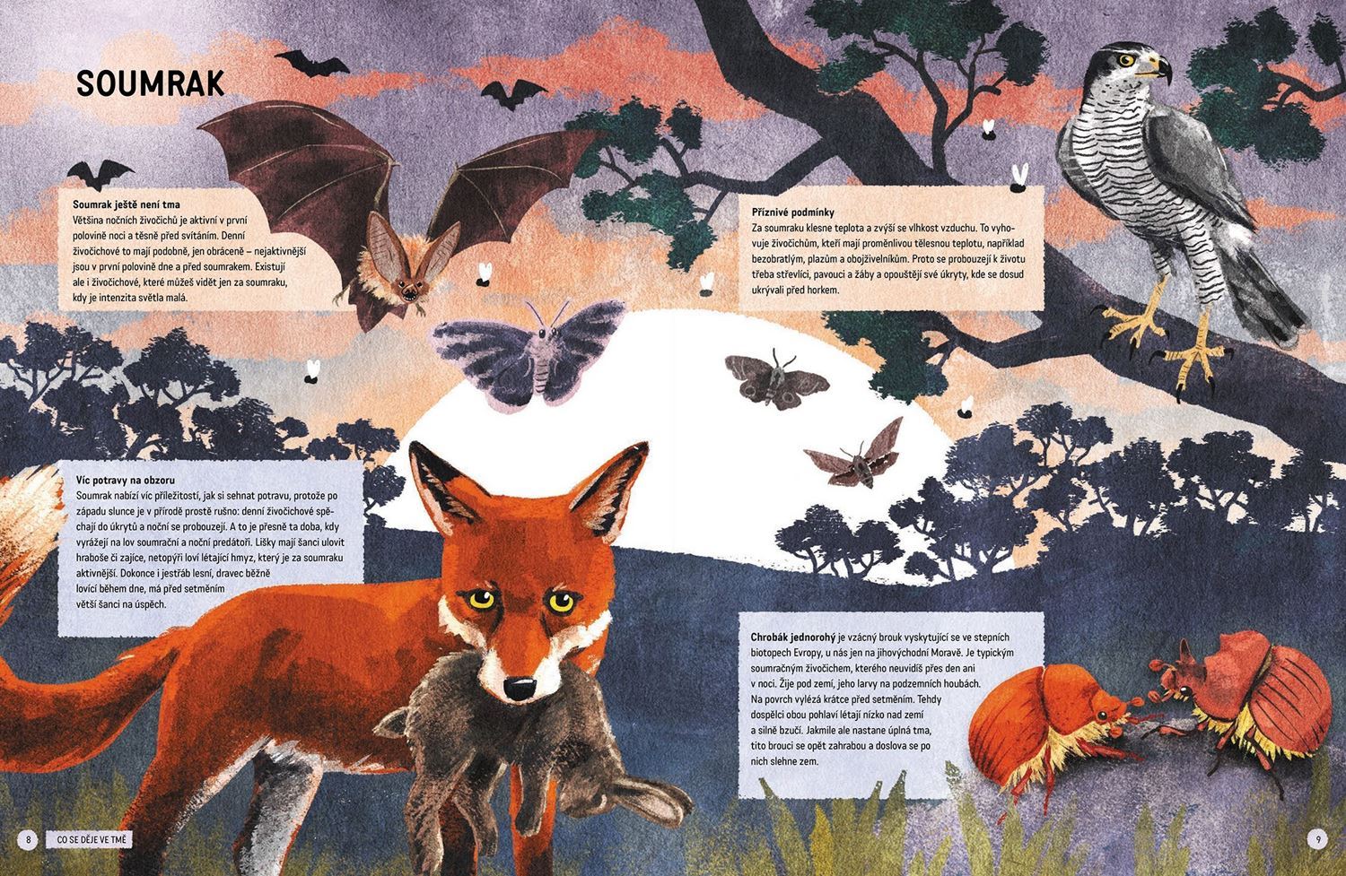 Kdo by nebyl zvědavý, co se v noci odehrává za okny našich příbytků! Kniha tě vezme na netradiční výpravu za zvířaty. Nahlédneš do nočního lesa, na louku i pod vodní hladinu. Poznáš také obyvatele jeskyní a podzemí, kteří žijí ve věčné tmě. Zjistíš, jak v noci vidí liška, jak se v úplné tmě najdou sameček a samička obrovského motýla martináče hrušňového, co dělá rak za úplňku, jak rozeznáš zpěv nočního zpěváka slavíka obecného, přečteš si i něco ze života potkanů a mnoho dalších zajímavostí. A v neposlední řadě se dozvíš, jak zoologové pozorují zvířata ve volné přírodě a jak se i ty můžeš vydat na průzkum. Text fundovaného zoologa je nabitý informacemi a ilustrace jsou plné nejen barev, ale i akce.