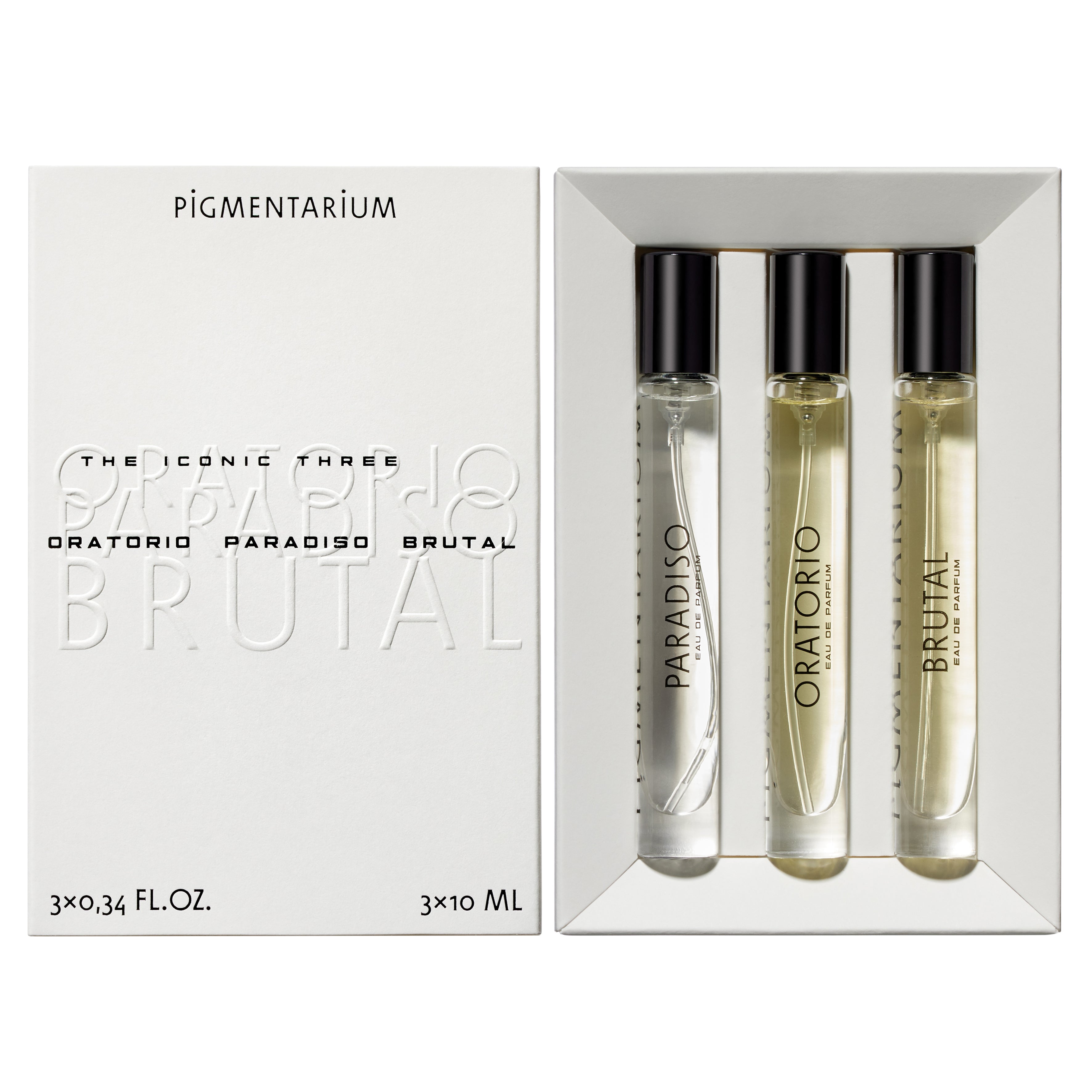 The Iconic Three nabízí v jednom produktu tři globální bestsellery značky Pigmentarium o velikosti 10 ml. Eau de Parfum Paradiso, Oratorio a Brutal – vůně rozdílné svou inspirací i charakterem – spojuje jejich odvážná originalita a mimořádně pozitivní odborná hodnocení. Kompozice tvořené se zcela původní vizí a bez ohledu na trendy si dokázaly zajistit komerční úspěch díky své jedinečnosti a prémiovému řemeslnému pojetí. Mimořádně úspěšné prodeje těchto vůní na rozdílných trzích od Japonska přes Evropu až po USA i Mexiko tak přirozeně vyústily v myšlenku nabídnout je klientům jako set.