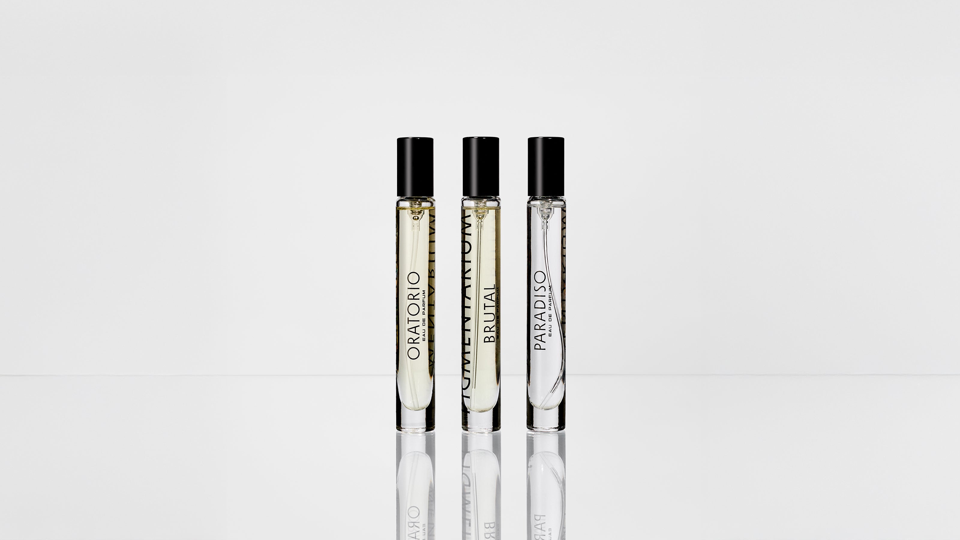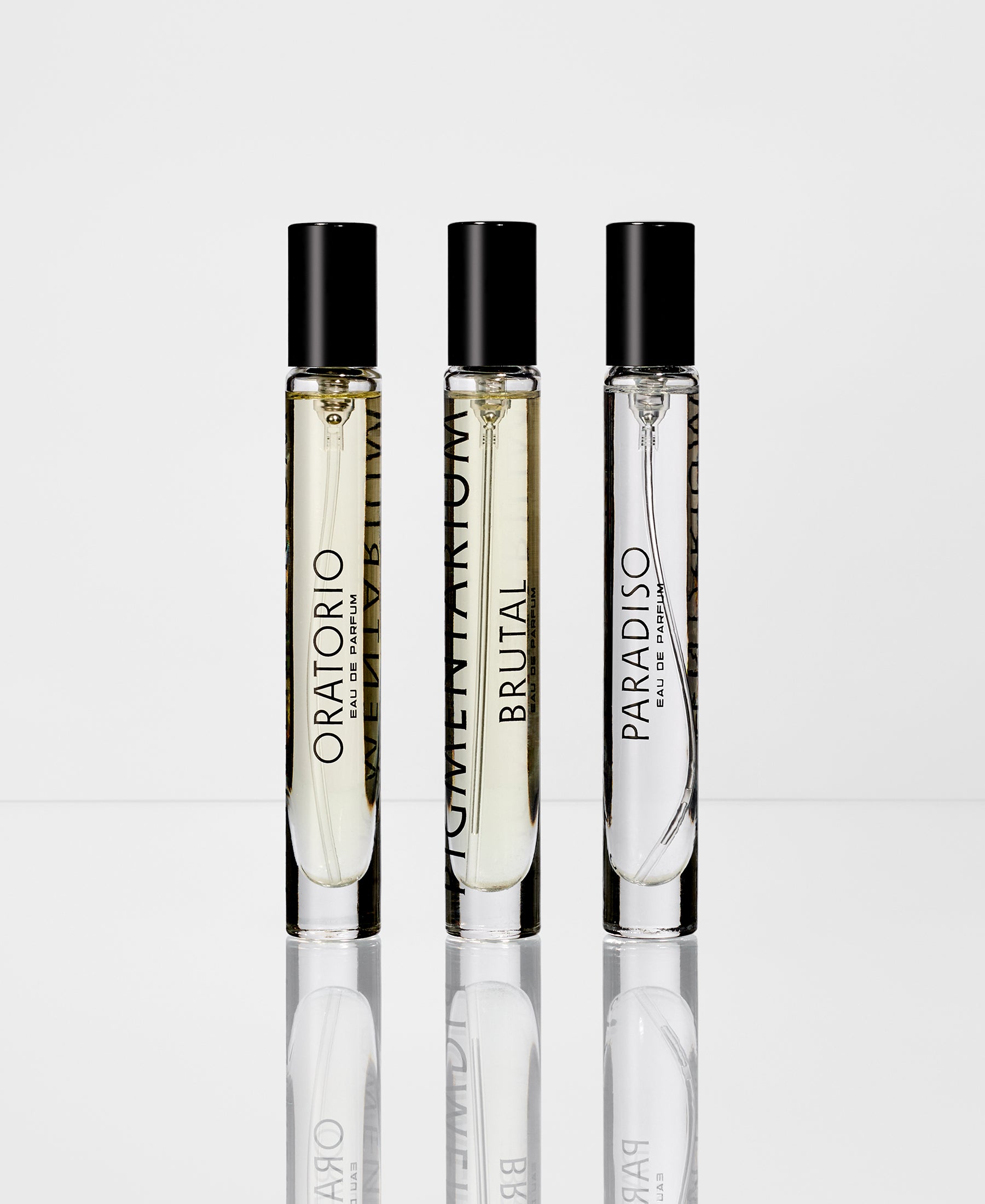 Všechny tři vůně jsou dynamické a současné, každá ale přináší jinou emoci. Paradiso představuje jiskřivé spojení grepu a verbeny. Brutal je sebevědomě výrazný a sexy spojením tuberózy, akordu negroni a tabáku. Oratorio nabízí univerzálně krásnou, v jednu chvíli chladnou i hřejivou kompozici niche madagaskarské mandarinky, kadidla a pačuli.