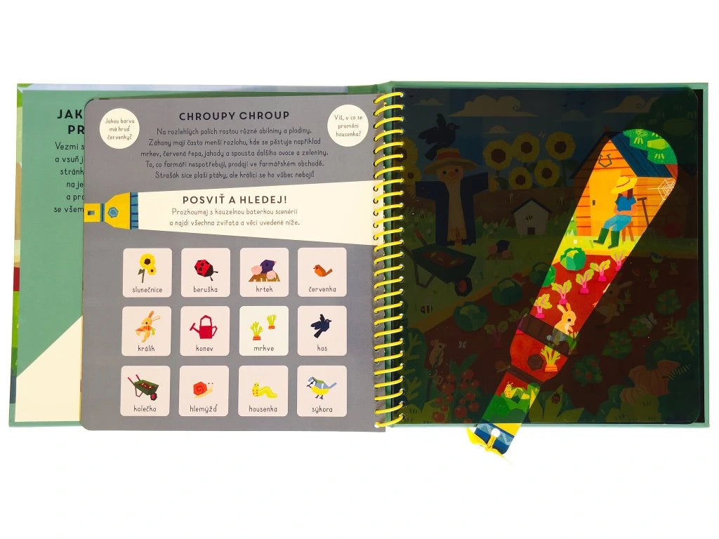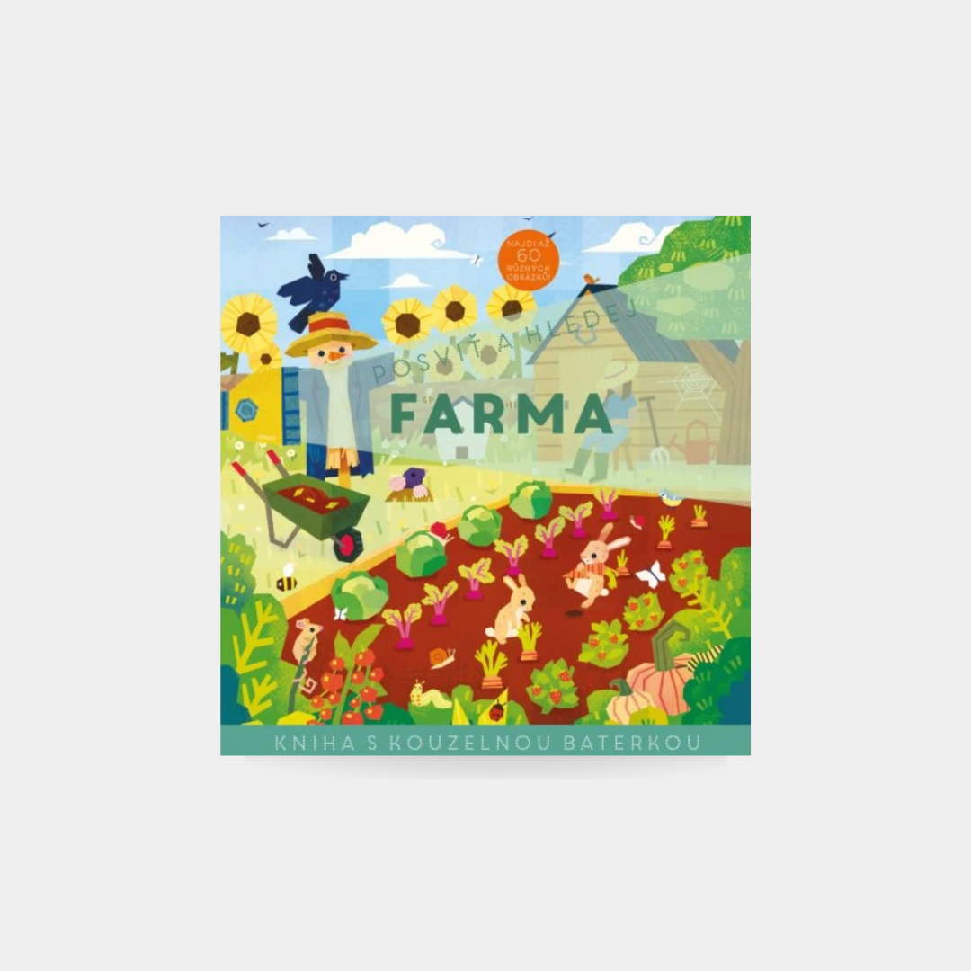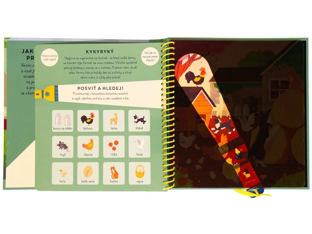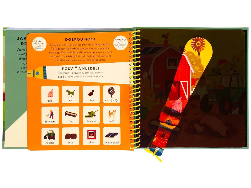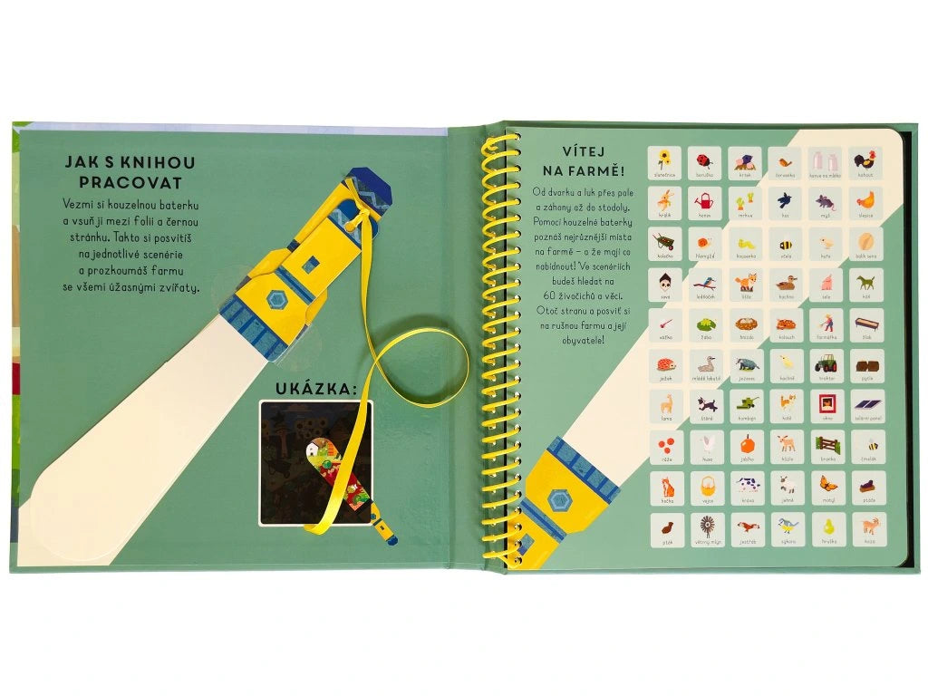 Vezmi si kouzelnou baterku a vsuň ji mezi folii a černou stránku. Takto si posvítíš na jednotlivé scenérie a prozkoumáš celou farmu se všemi úžasnými zvířaty. Objevuj dvorek, stodolu i rozlehlé pastviny! Která zajímavá zvířata zde žijí? Najdi je a zjisti o farmě zajímavé informace.