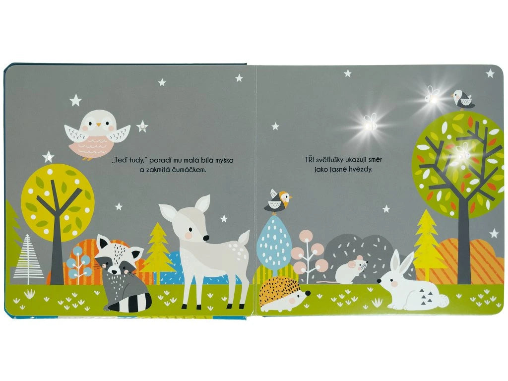 Kouzelná kniha ve formě leporela s integrovanými světélky, kterých je na každé straně víc a víc, zve děti na nezapomenutelnou cestu setmělým lesem spolu s malým kolouškem. Když otevřou knihu a rozsvítí světélka, budou s kolouškem hledat cestu z lesa ven, za maminkou, překonávat překážky a rozvíjet smyslové vnímání skrz počítání rozzářených světlušek. Krátký, milý a vtahující příběh sleduje dobrodružství kolouška, který se zatoulal v noci v lese, ale díky radám zvířecích kamarádů a světluškám zářícím ve tmě se nakonec z lesa vymotá a najde svou maminku. Leporelo rozvíjí schopnost řešení problémů, smyslové vnímání, naslouchání příběhům a porozumění textu, první počítání, jemnou motoriku a koordinaci oko-ruka. Tato kniha je skvělým způsobem, jak dětem poskytnout zábavu i vzdělání prostřednictvím poutavého příběhu v interaktivním leporelu se světélky.