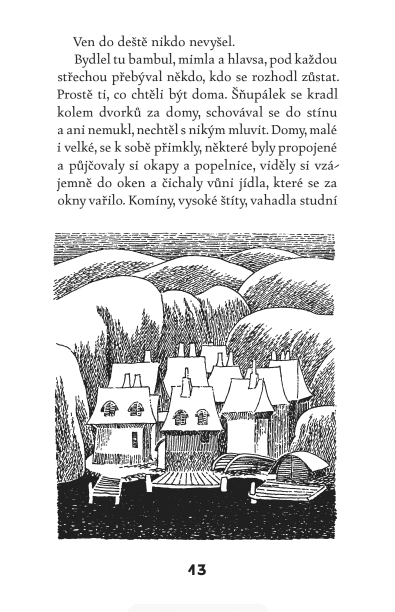 Podzim je čas, kdy se muminí údolí a jeho obyvatelé ukládají ke spánku. Ale letos je něco jinak. Nezamčený dům zeje prázdnotou a nikde ani řádka na rozloučenou, takže fififjonka, pimek, bambul, mimla, Strejdánek, ale ani Šňupálek, kteří sem zamířili, nemají potuchy, co se s rodinou stalo. Její nepřítomnost je ale přímo hmatatelná a každý z návštěvníků se s ní musí vyrovnat po svém a najít i tak, pro co sem přišel. Noví a zcela nesourodí obyvatelé se zároveň snaží přijmout role, které od nich muminí dům očekává.