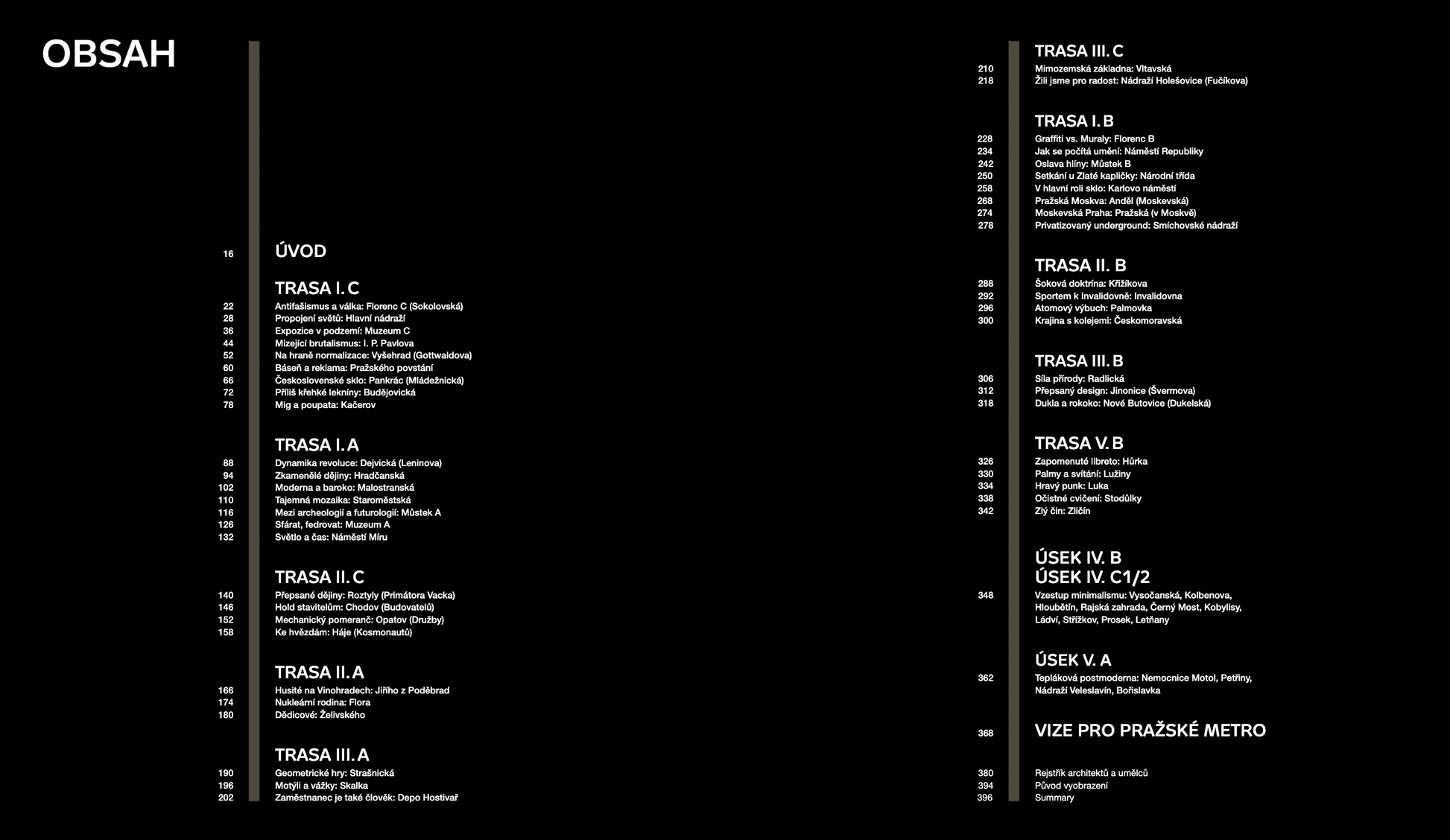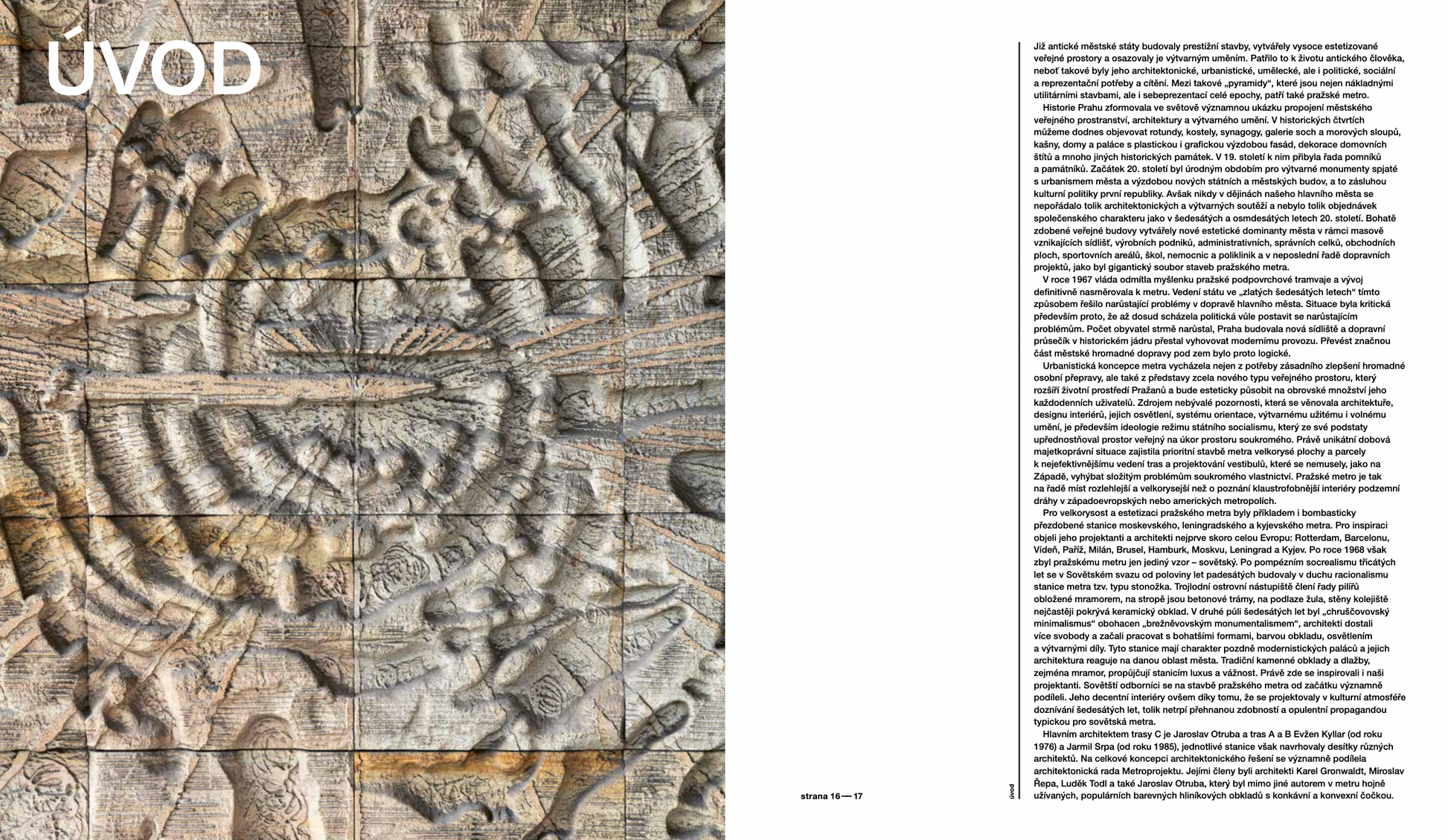 Pražské metro nemělo být jen dopravním prostředkem. Před 50 lety se díky této stavbě pod městem otevřel prostor s potenciálem naplnit myšlenku modernistů o schopnosti umění kultivovat člověka. Idea se promítla do pozornosti, kterou tvůrci věnovali architektuře, estetice interiéru, jeho osvětlení, systému orientace, výtvarnému umění a designu. Výtvarníci byli spolu s architekty aktivními spolutvůrci prostředí, a proto je také pražská podzemní dráha jednou z nejpůsobivějších na světě. Kniha prostřednictvím textů a fotografií zachycuje tento dodnes inspirativní projekt jako architektonický, umělecký a urbanistický fenomén i jako jedinečnou, živou stopu historie v útrobách města.