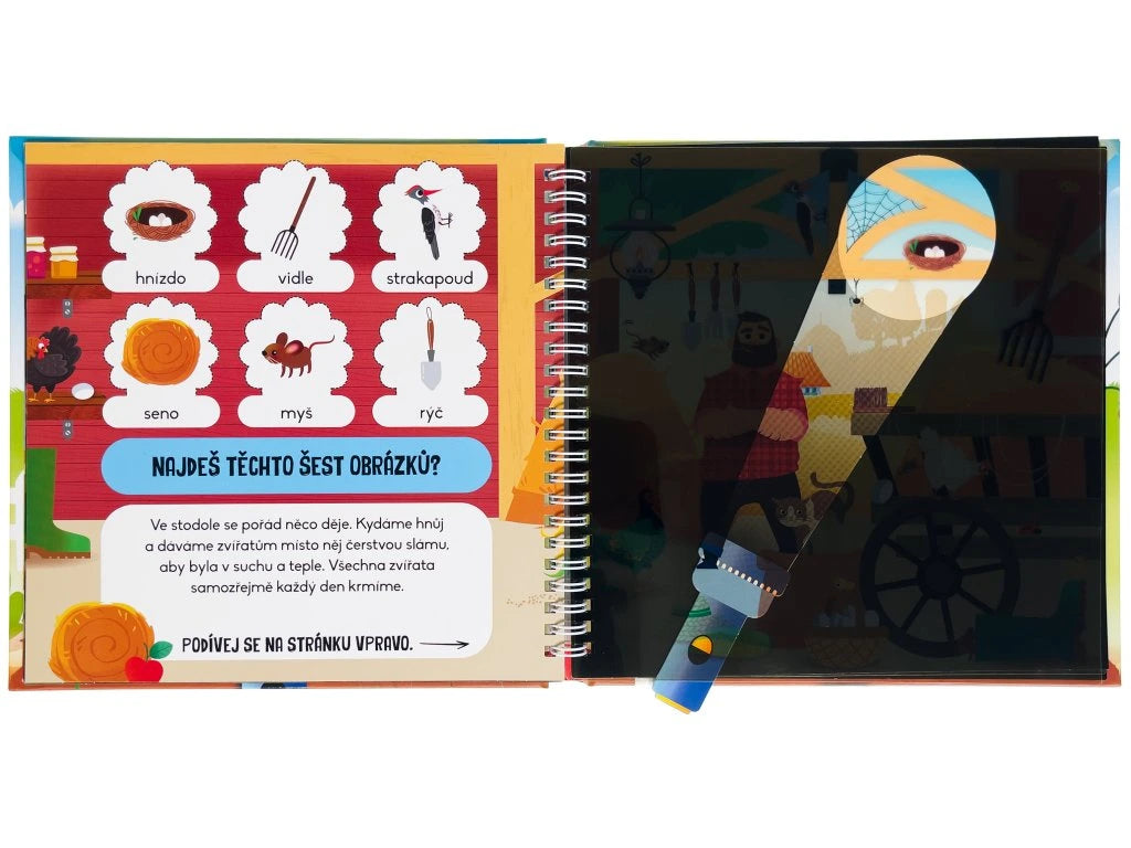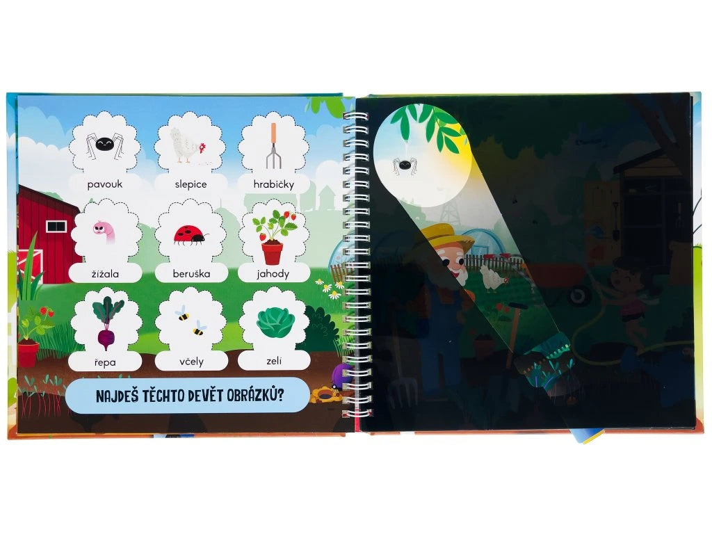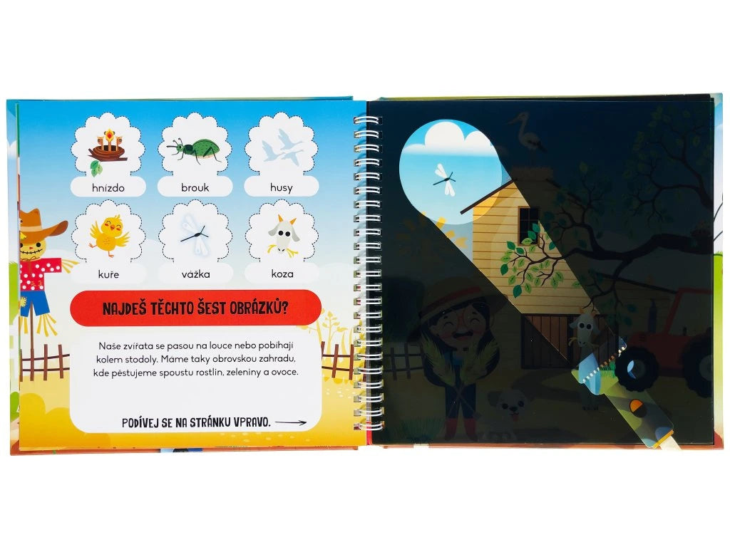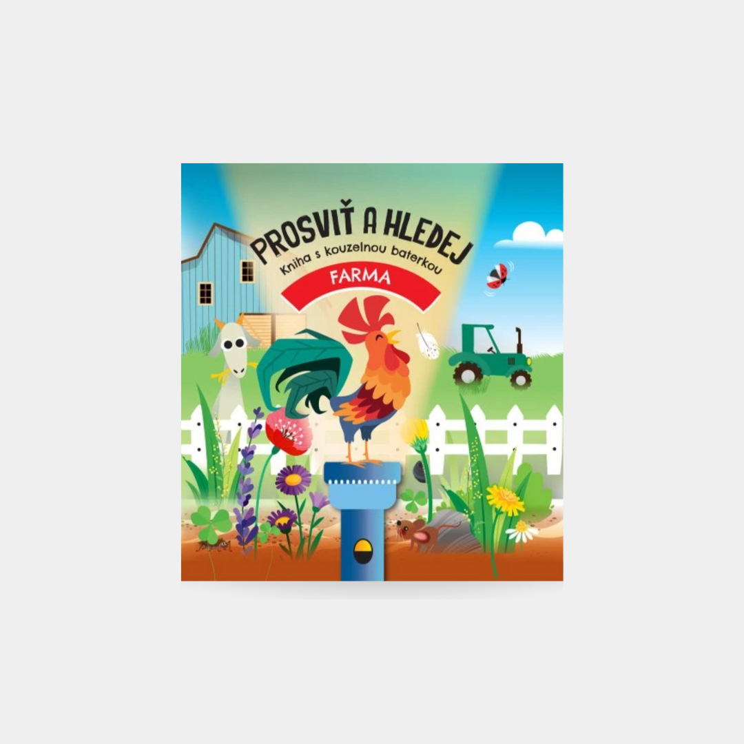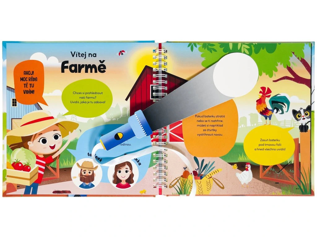 Na farmě je toho tolik k objevování! Čekají tu na tebe rozverná zvířata a také spoustu věcí, které farmáři potřebují ke své práci. Na stránkách hledej ukryté obrázky a zjisti o farmě a zvířatech zajímavé informace. Stačí jen zasunout baterku pod tmavou folii a hned všechno uvidíš.