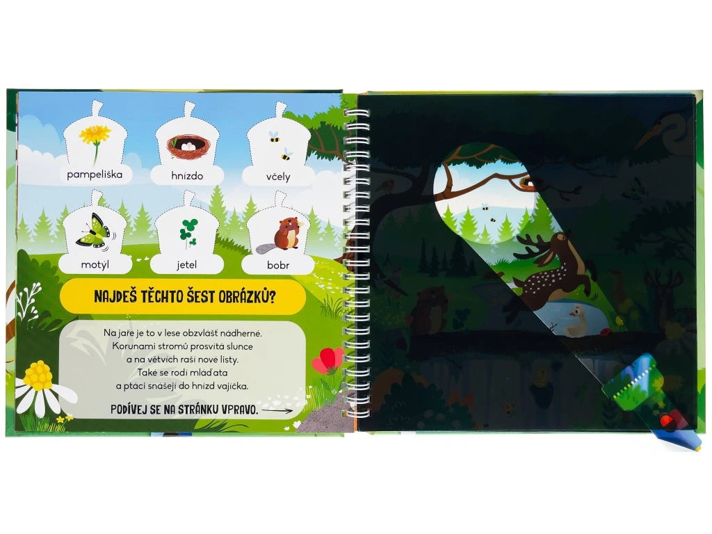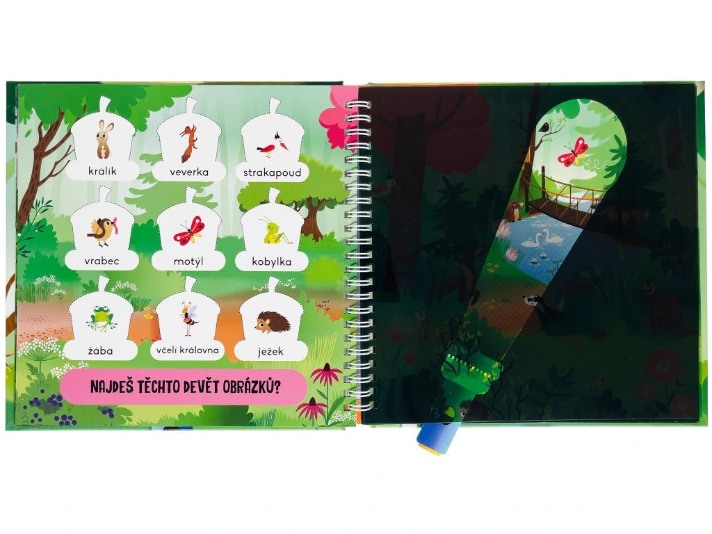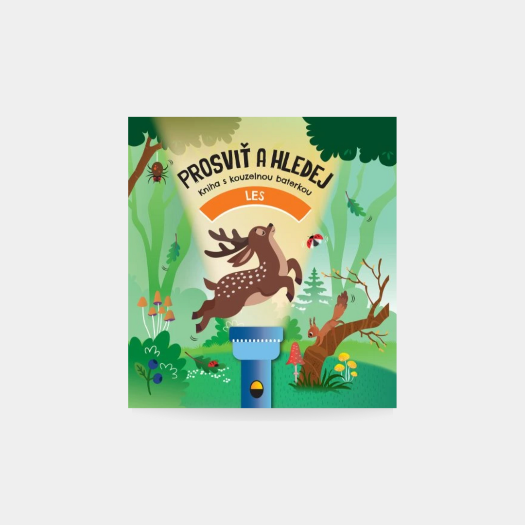 V lese je toho tolik k objevování! Čekají tu na tebe rozverná zvířata a také spoustu krásných rostlin a stromů. Na stránkách hledej ukryté obrázky a zjisti o lese a zvířatech zajímavé informace. Stačí jen zasunout baterku pod tmavou folii a hned všechno uvidíš.