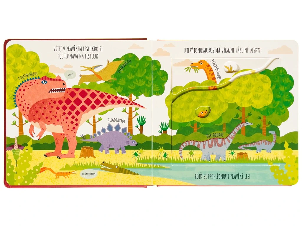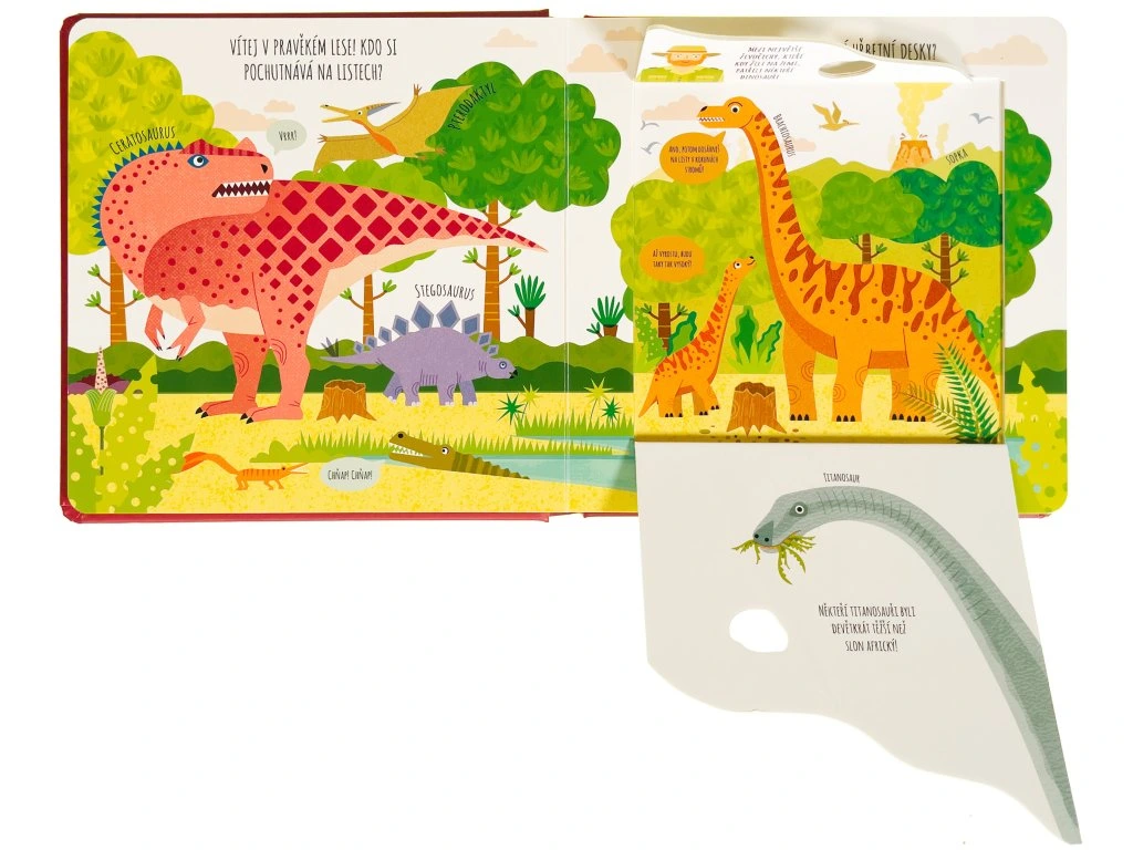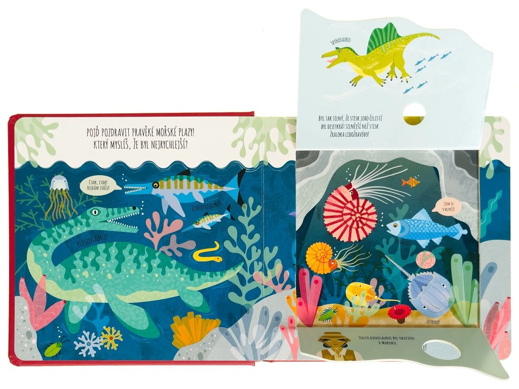 Pojď se seznámit s nejrůznějšími dinosaury a pravěkými tvory. Kdo se to ukrývá mezi skálami v oceánu? Který dinosaurus má hřbetní desky? A kdo byl postrach na pravěkých planinách? Prozkoumej nejrůznější prostředí v tomto roztomile ilustrovaném leporelu, které děti provede pravěkým světem dinosaurů. Jednoduché popisky a poučné informace pod okénky nadchnou každého malého paleontologa a malou paleontoložku.