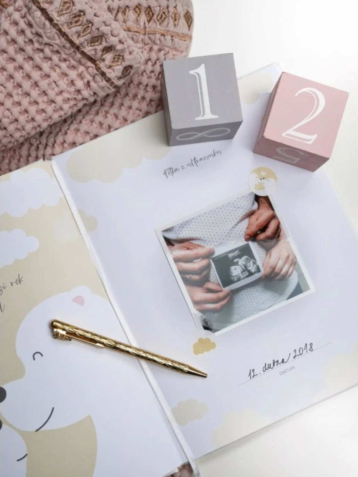 Sekce od počátku těhotenství až po první narozeniny, včetně prostoru pro ultrazvukové snímky, výběr jména, popis prvních momentů a nejdůležitějších událostí.