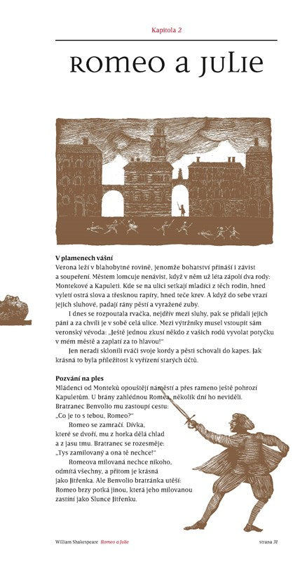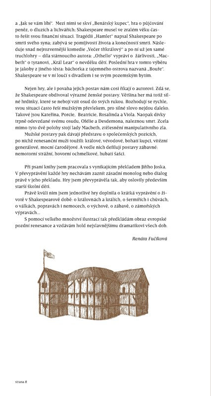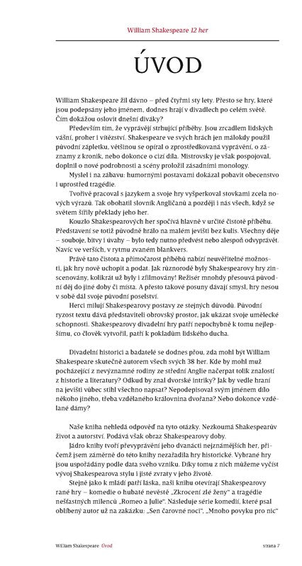 Dvanáct nejznámějších her Williama Shakespeara převyprávěla pro dnešní mladé čtenáře i jejich rodiče svěžím stylem renomovaná autorka a ilustrátorka Renáta Fučíková. Z jejího výběru her, sestaveného chronologicky, můžeme vyčíst vývoj dramatikova stylu i zvraty v jeho životě. Stejně jako k mládí patří láska, naši knihu otevírají Shakespearovy rané hry – komedie o hubaté nevěstě „Zkroceni zle ženy“ a tragédie nešťastných milenců „Romeo a Julie“. Následuje trojice komedií, které si již od Shakespeara vyžádalo jeho vděčné, urozené i neurozené obecenstvo: „Sen čarovné noci“, „Mnoho povyku pro nic“ a „Jak se vám líbí“. Mezi ně se vklínila hra „Benátský kupec“ o penězích a dluzích. Jak to chodívá, v jistém věku musí každý řešit svou finanční situaci. Tragédie „Hamlet“, kterou Shakespeare napsal po smrti svého syna, se zabývá pomíjivostí života a konečností smrti.